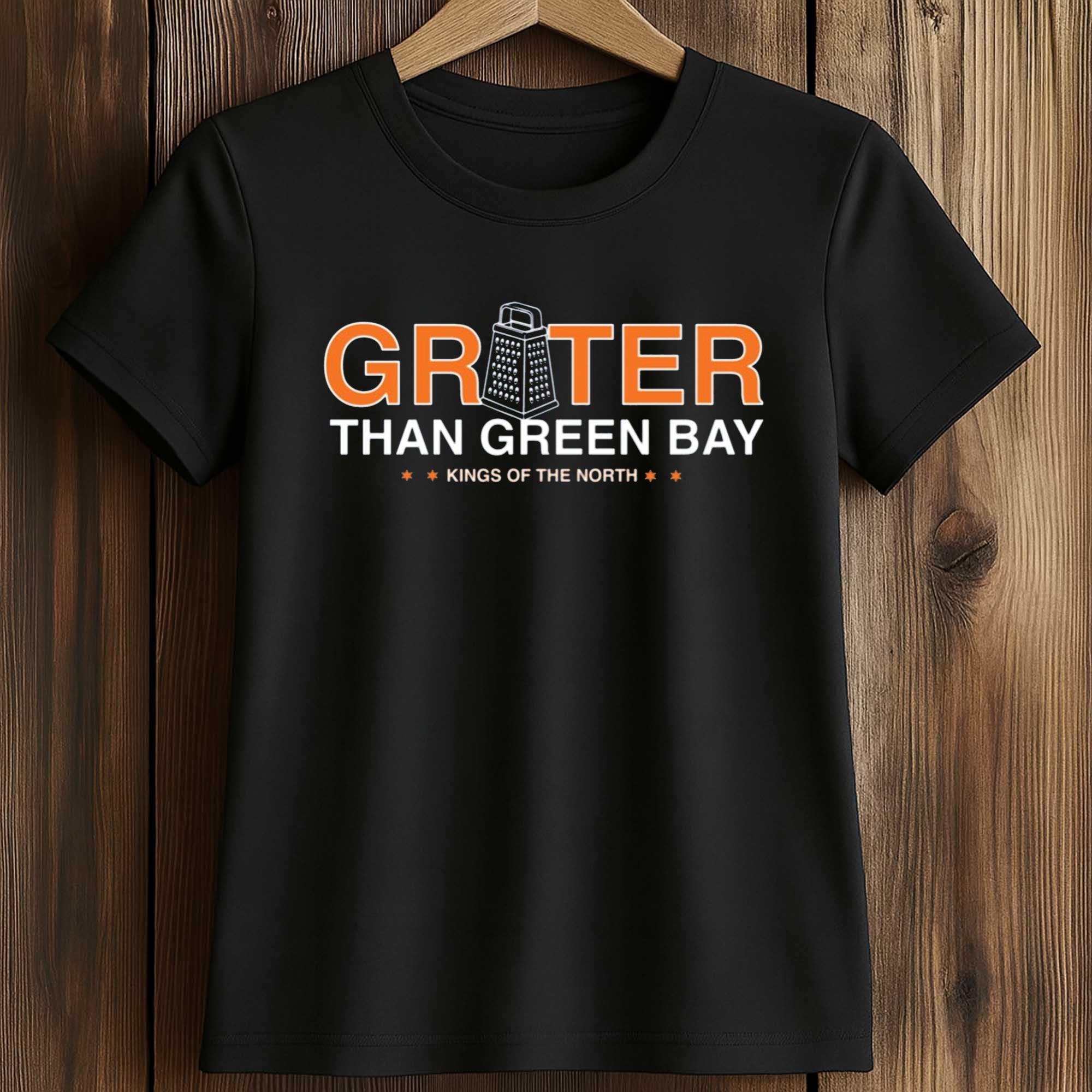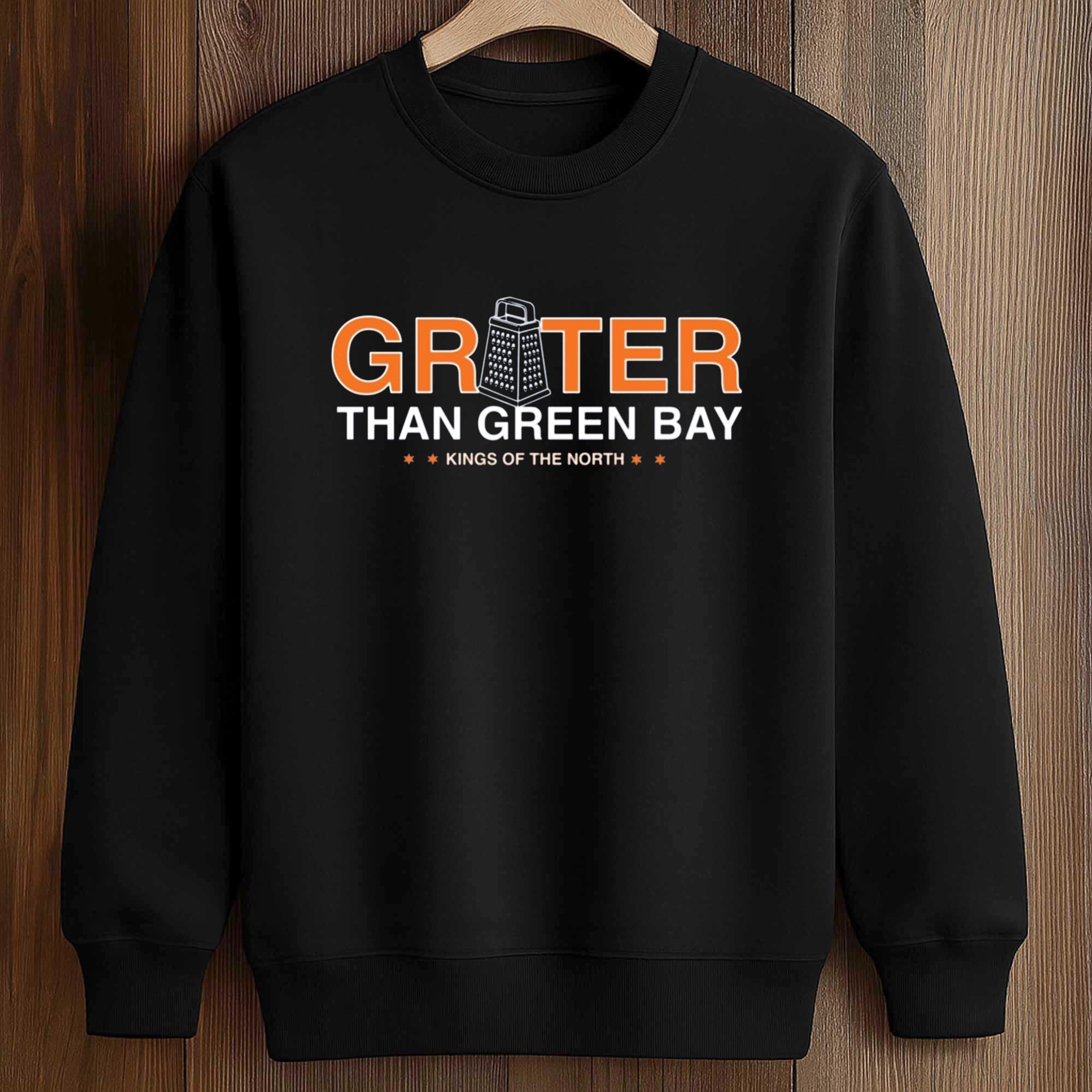 The Grater Than Green Bay Kings Of The North Shirt a black background with striking orange and white lettering, focusing on a cleverly designed inverted cheese grater, Green Bay’s most famous symbol. The message is direct, witty, and unmistakable, making this shirt a great choice for fans who love the competitive culture of football.