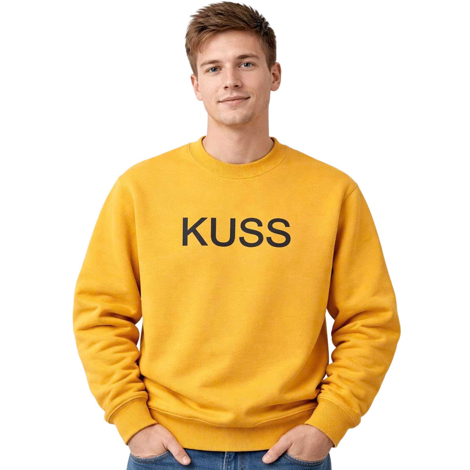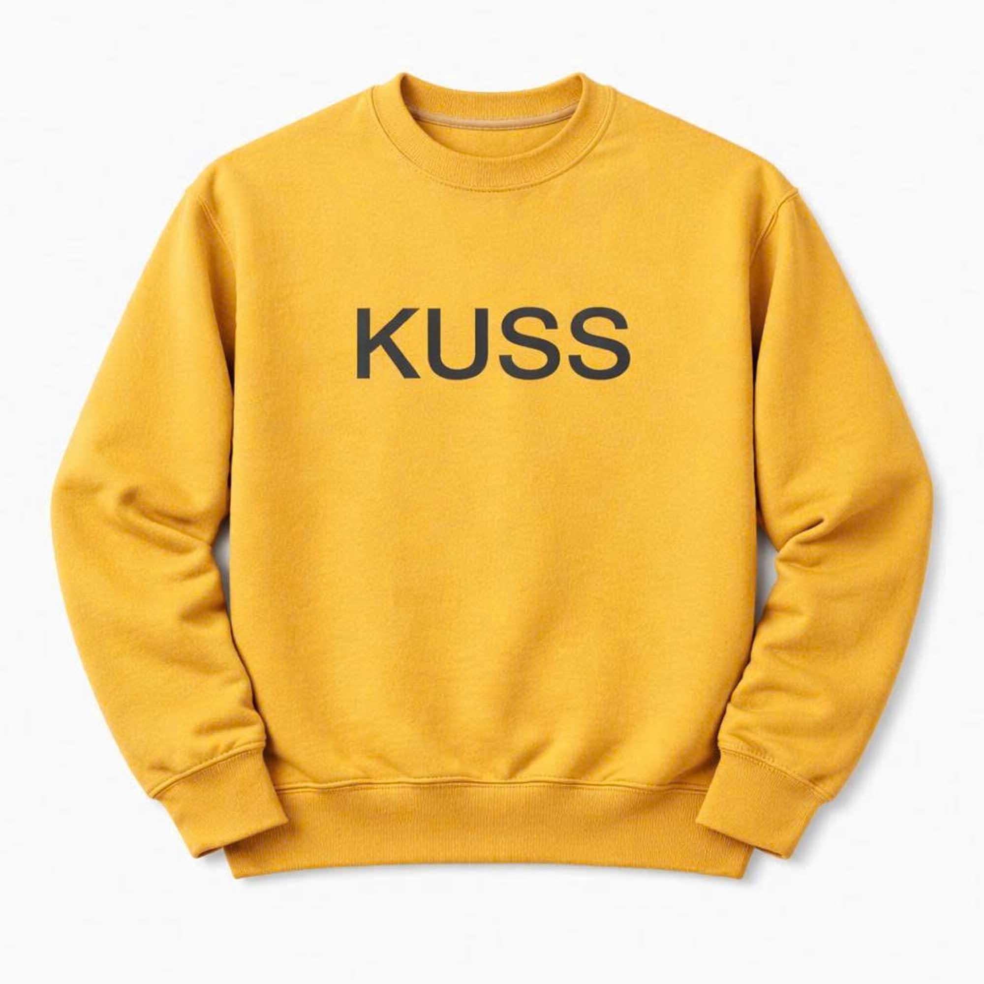 The highlight is the KUSS lettering printed in the center of the chest, with a dark contrasting color creating a modern and sophisticated look. The golden yellow color of the sweatshirt brings energy and warmth, making the design eye-catching without being overly flashy. Without any fussy patterns or details, the shirt maintains a sharp and easy-to-wear look. This minimalist style appeals to fans who love casual yet stylish fashion.