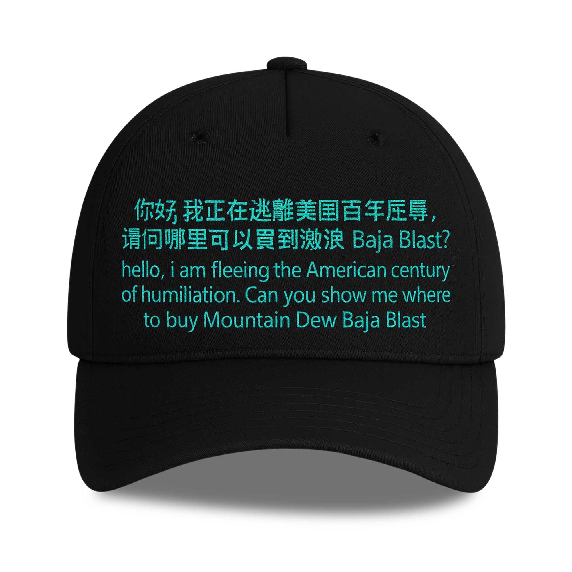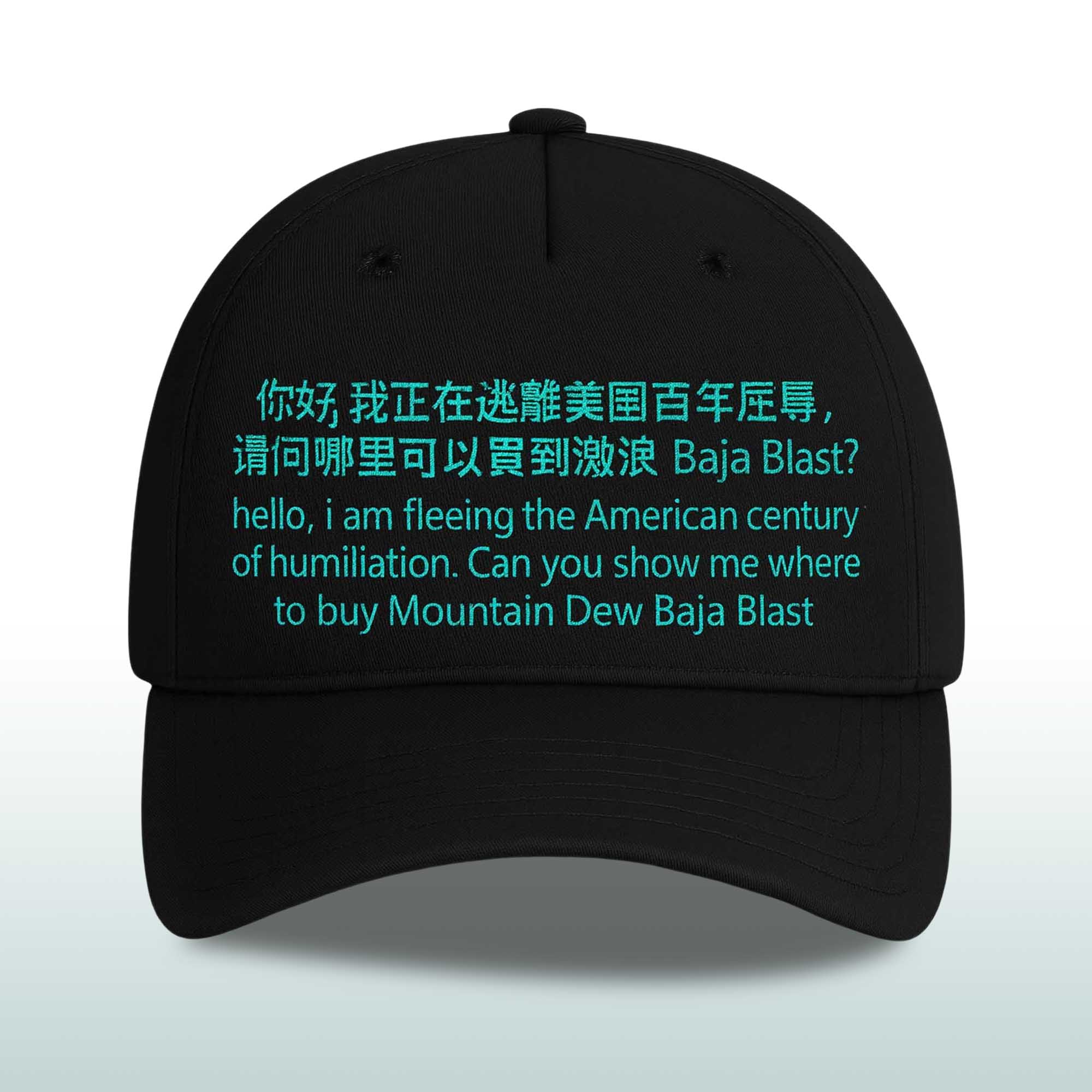 The Hello, I Am Fleeing The American Century Of Humiliation Hat combines sarcasm and confidence in a sleek black hat. The bilingual message – in Chinese and English – gives the hat a global edge, creating a humorous, satirical, and instantly recognizable piece. It’s fashion that speaks without trying too hard.
