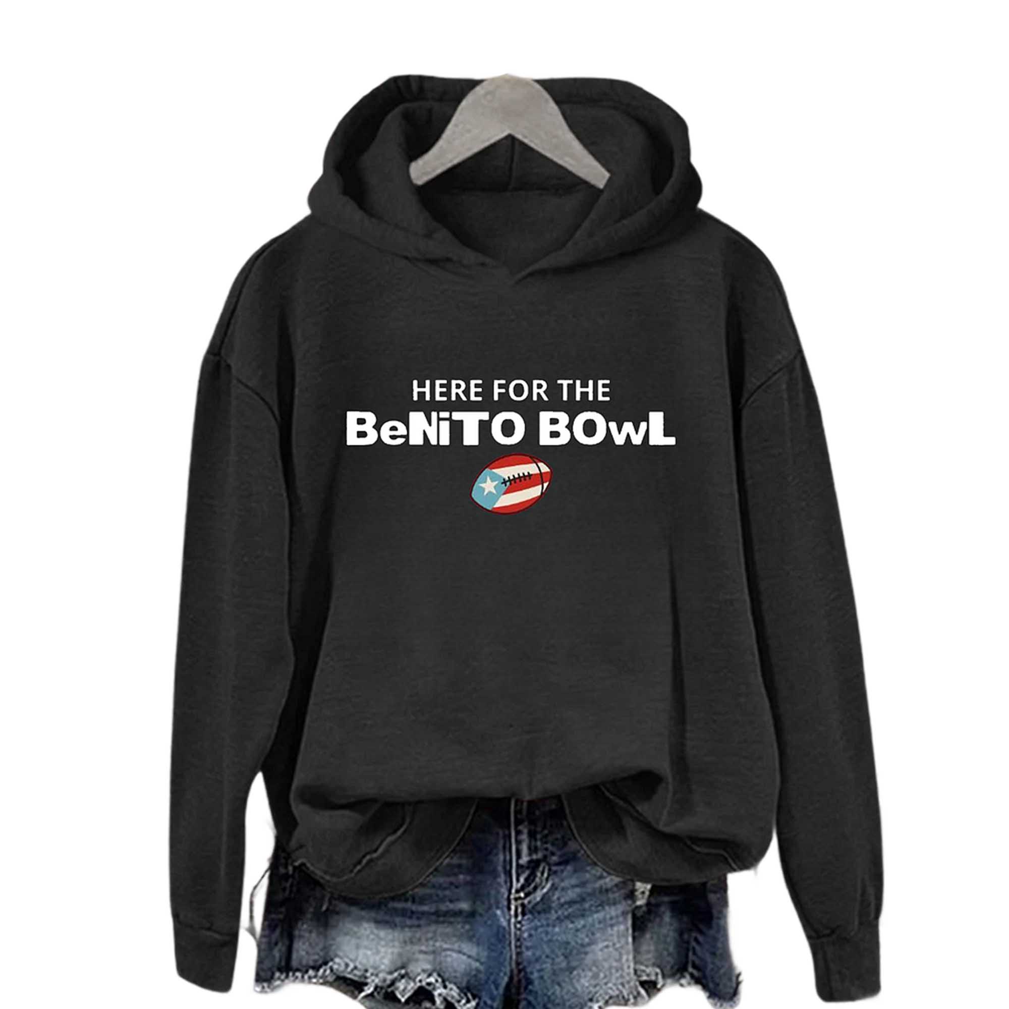 The hoodie features a sophisticated black base with a playful “HERE FOR THE BeNiTO BowlL” slogan printed on the chest. The handwritten lettering in both upper and lower case creates a bold, bold style, while the soccer graphic with the Puerto Rican flag ties the design to cultural pride and sportsmanship. The simple design makes it easy to coordinate with any outfit, but the message is sure to attract attention wherever you wear it.