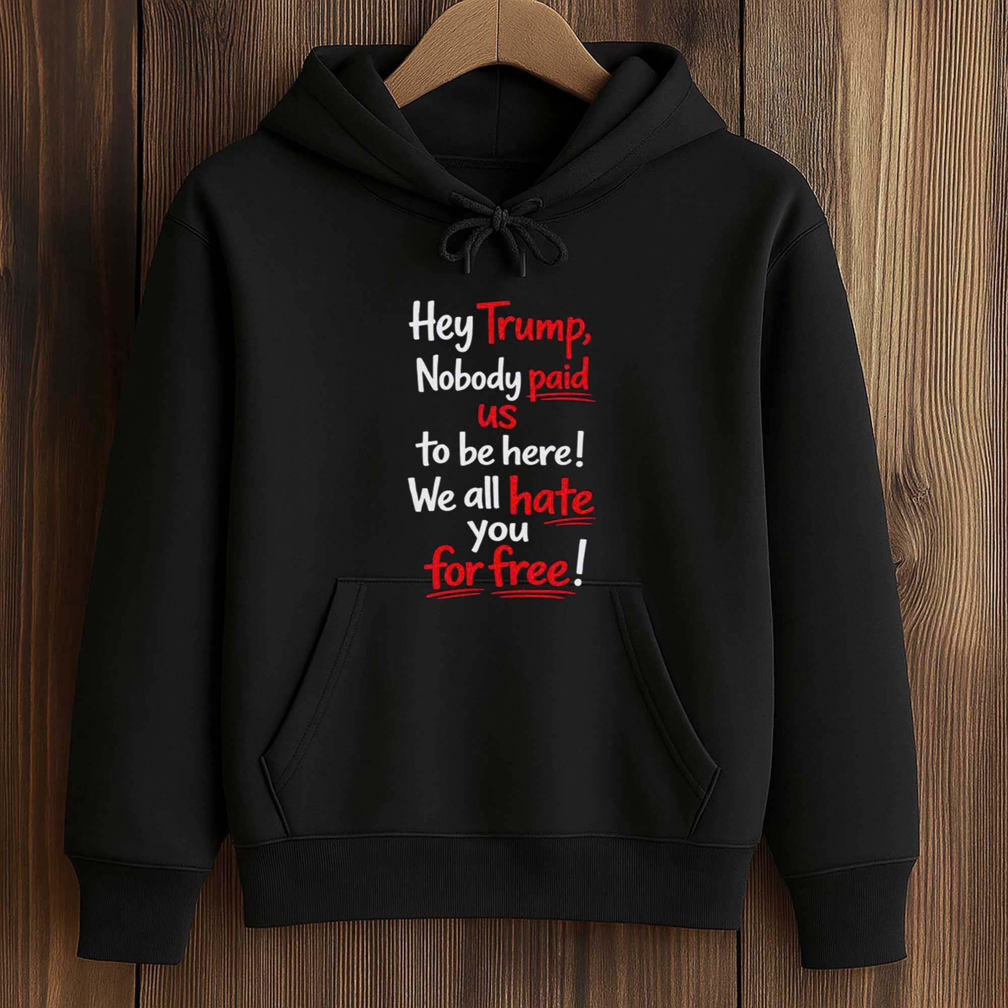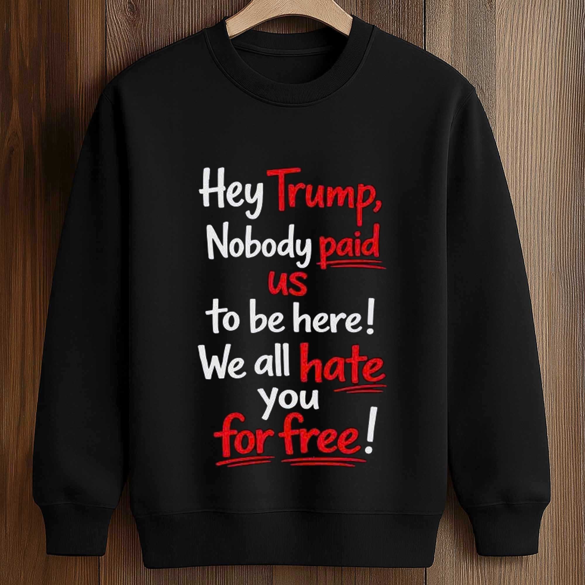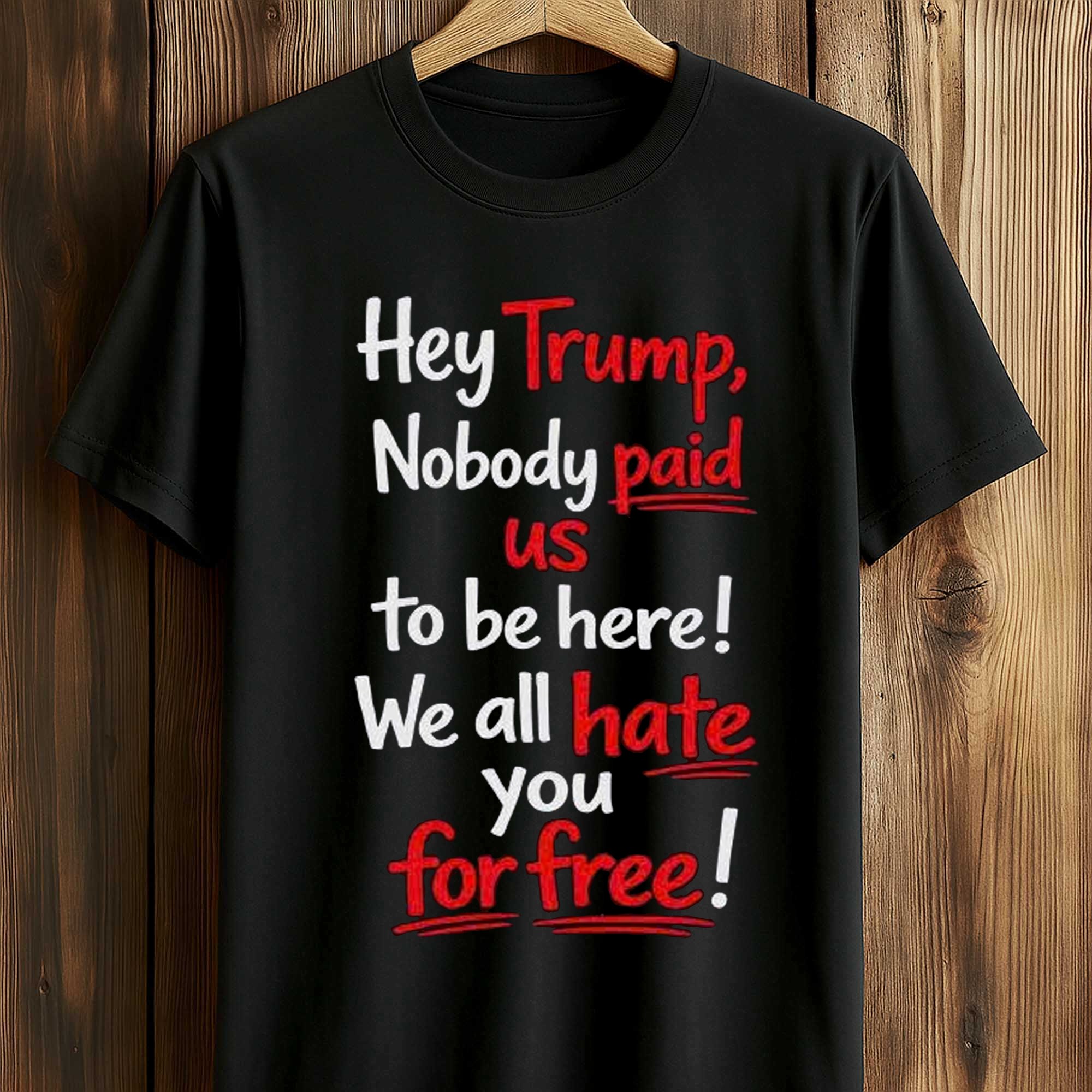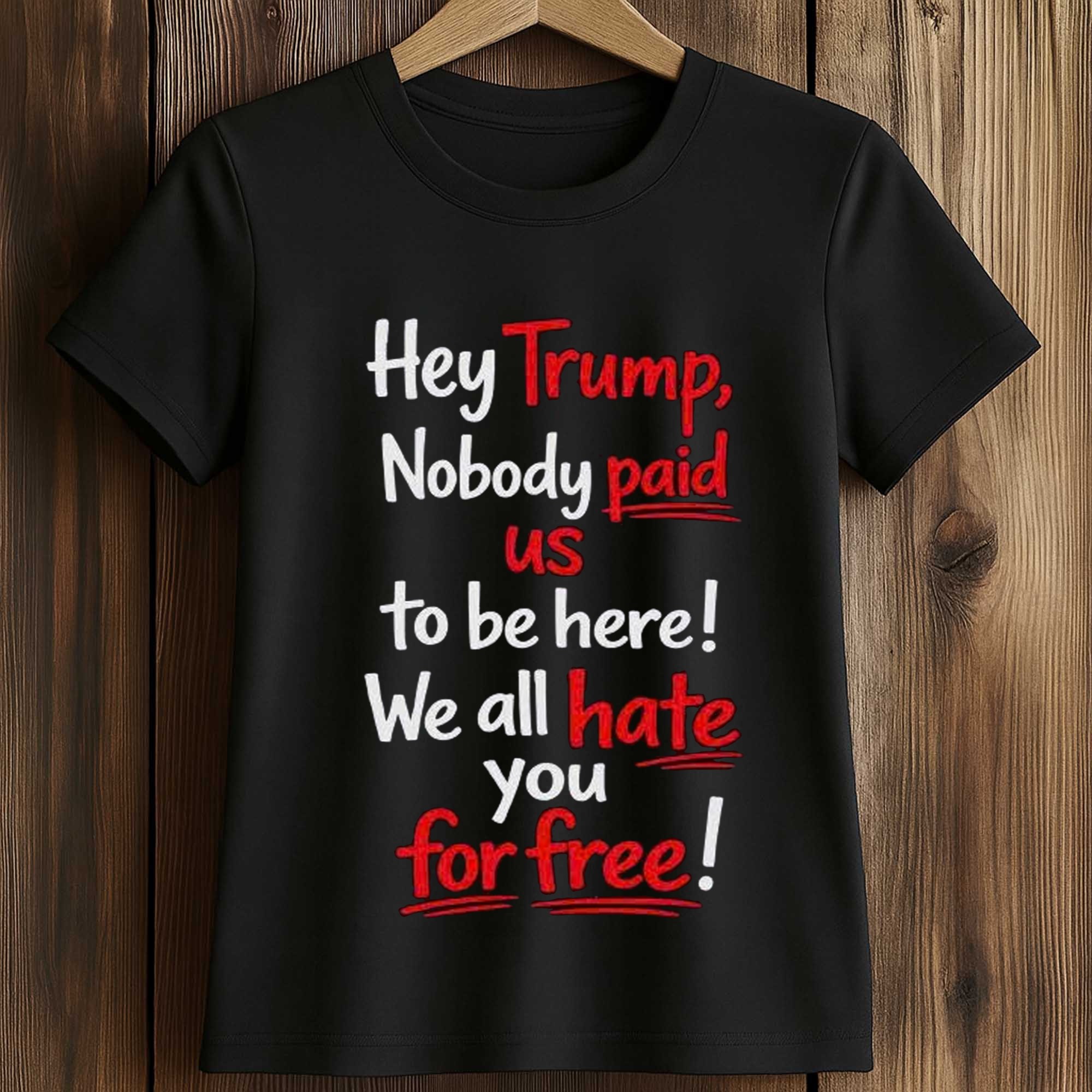 The Hey Trump Nobody Paid Us To Be Here We All Hate You For Free Shirt conveys a powerful message through its clear and eye-catching typography. Designed for those who want their clothing to reflect their voice, this shirt combines bold expression with everyday comfort. The contrast between the red and white lettering on a black background creates a striking image that immediately grabs attention.