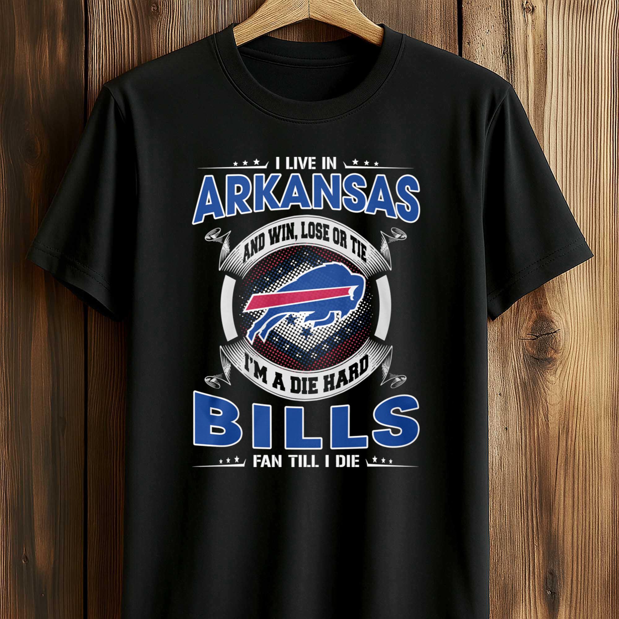 T-shirt “I live in Arkansas and win, lose, or draw, I’m a die-hard Bills fan” – Unwavering loyalty anywhere