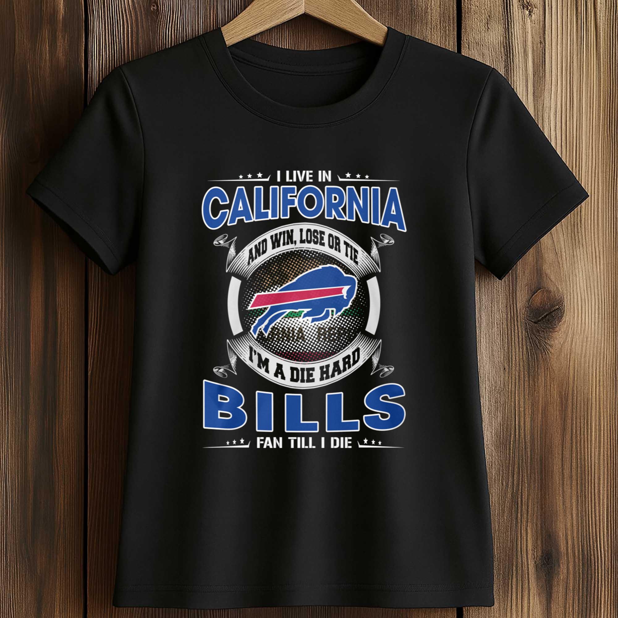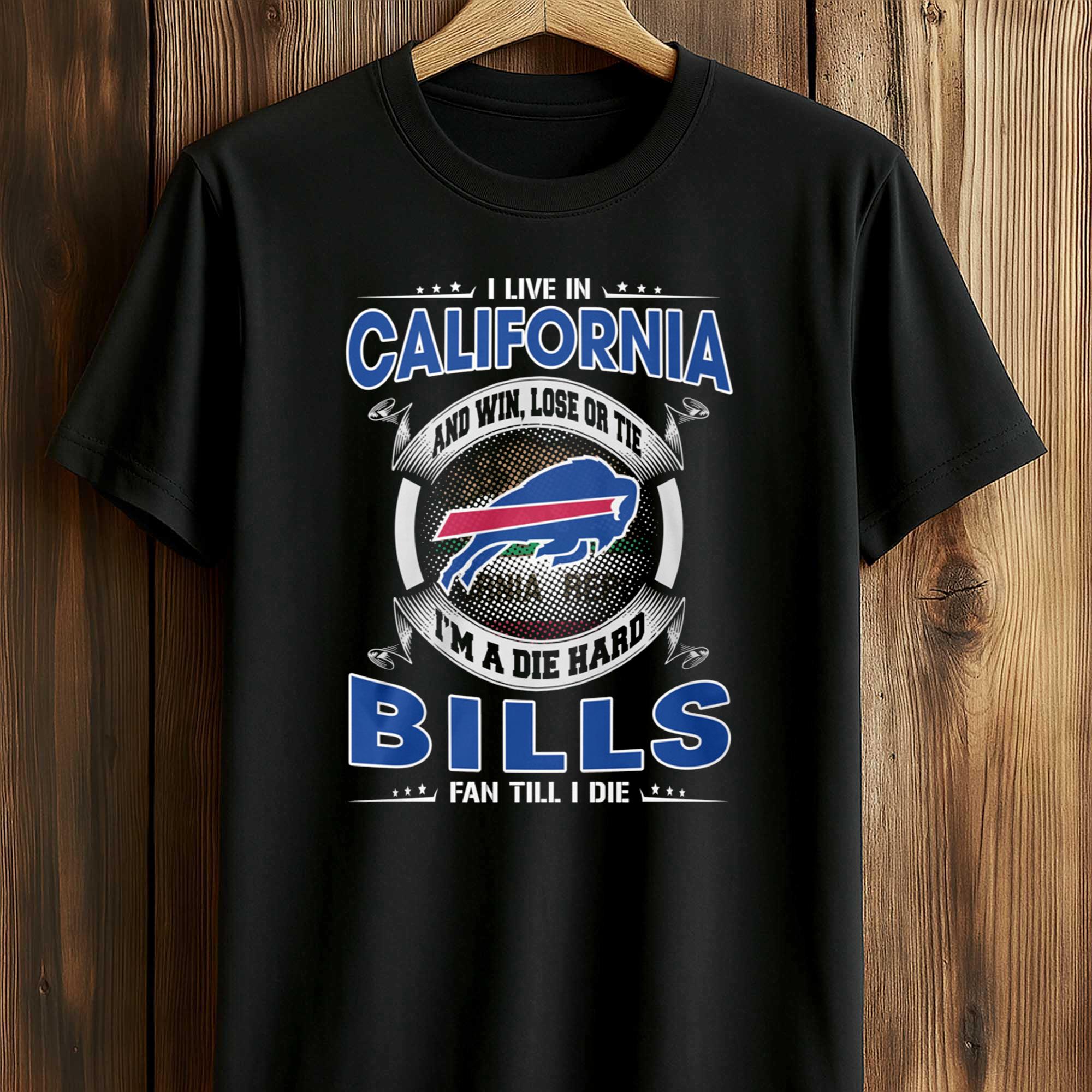 The I Live In California And Win, Lose Or Tie I’m A Die Hard Bills Fan Till I Die Shirt conveys a powerful message of loyalty. The bold California lettering, combined with the iconic buffalo logo and the Bills’ strong colors, makes the design instantly recognizable. Suitable for game days, road trips, team viewing parties, or everyday wear.
