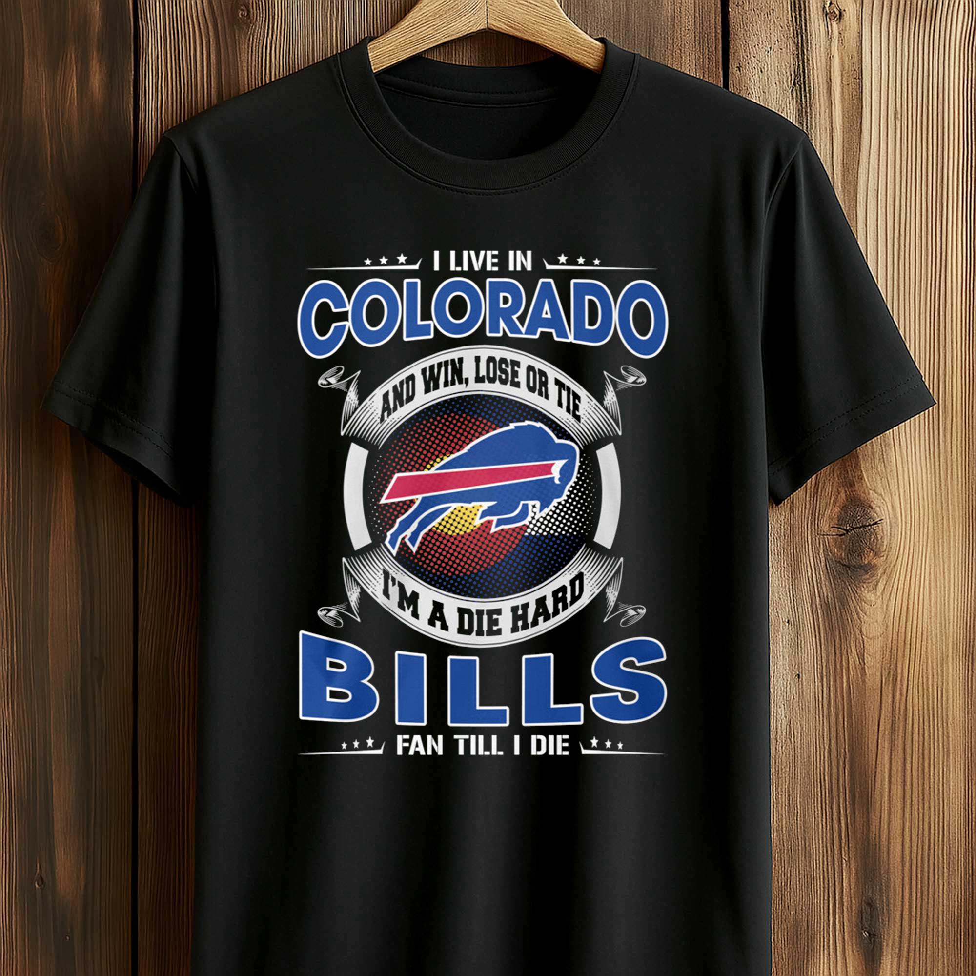 The I Live In Colorado And Win, Lose Or Tie I’m A Die Hard Bills Fan Till I Die Shirt is made for fans who never hide their loyalty. The prominent buffalo logo, bold lettering, and classic Bills colors create a confident, instantly impactful statement. This shirt is perfect for game day, casual outings, or game shows, allowing fans to express their identity, pride, and lifelong support in a powerful design.
