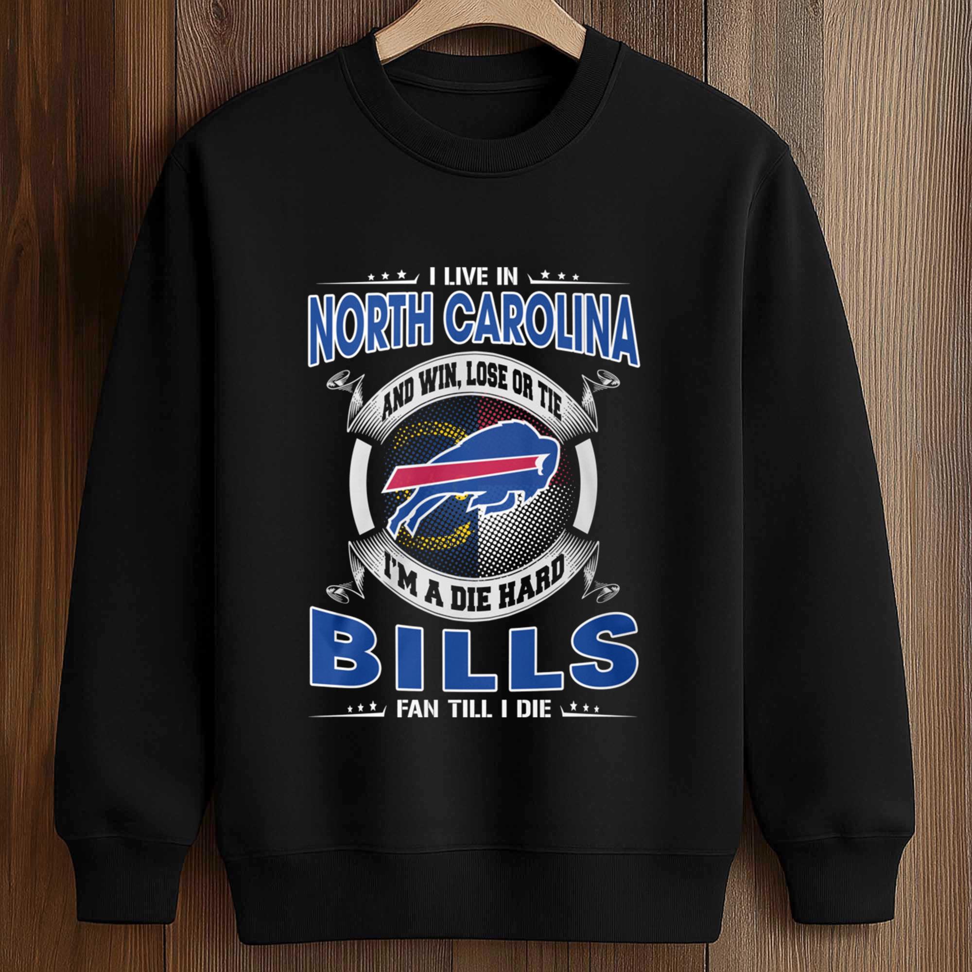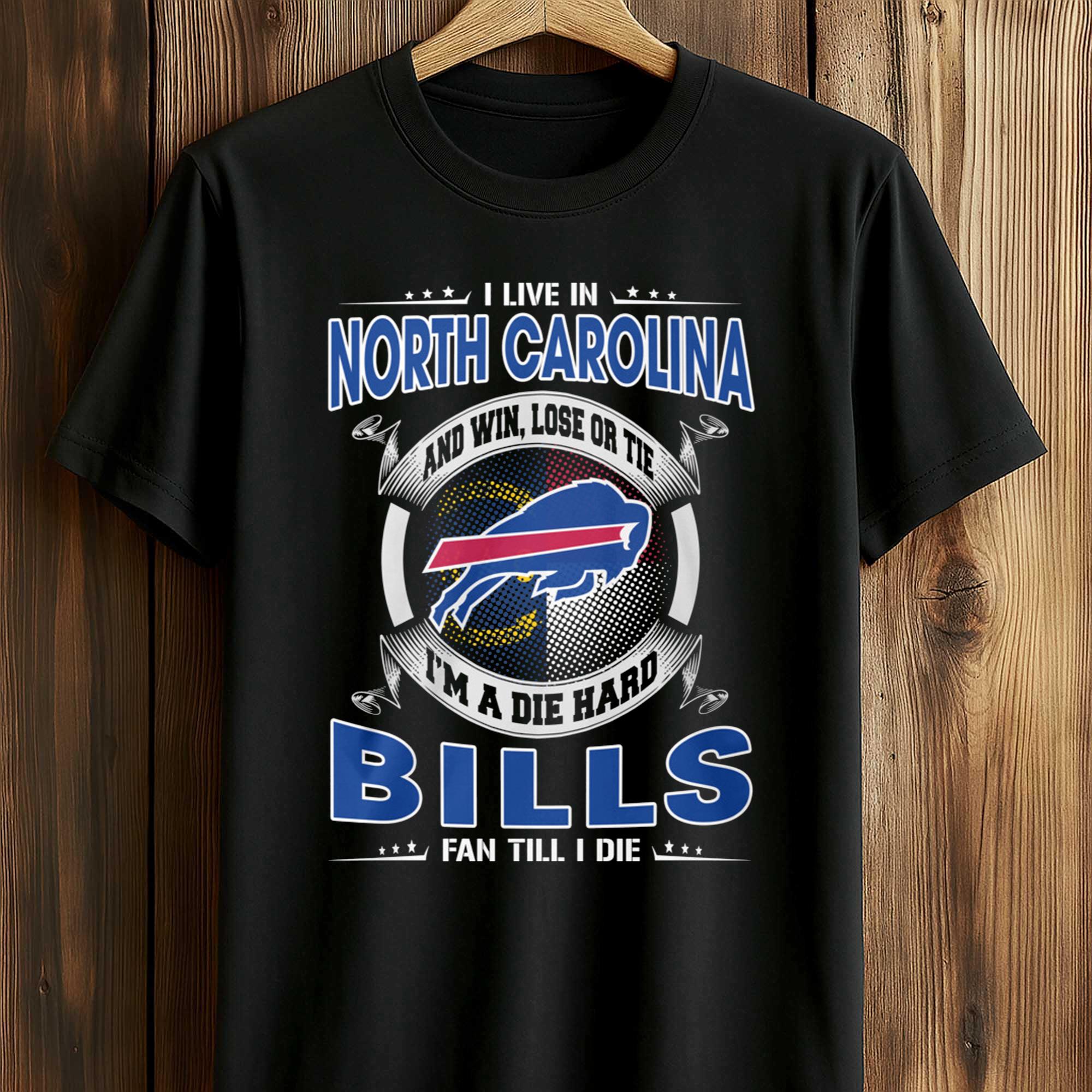This I Live In North Carolina And Win, Lose Or Tie I’m A Die Hard Bills Fan Till I Die Shirt conveys a powerful message with its simple yet eye-catching design. The Buffalo Bills logo is at the center, surrounded by confident lettering, emphasizing loyalty in every win and loss. It’s designed for fans who never waver and want to clearly express their passion.