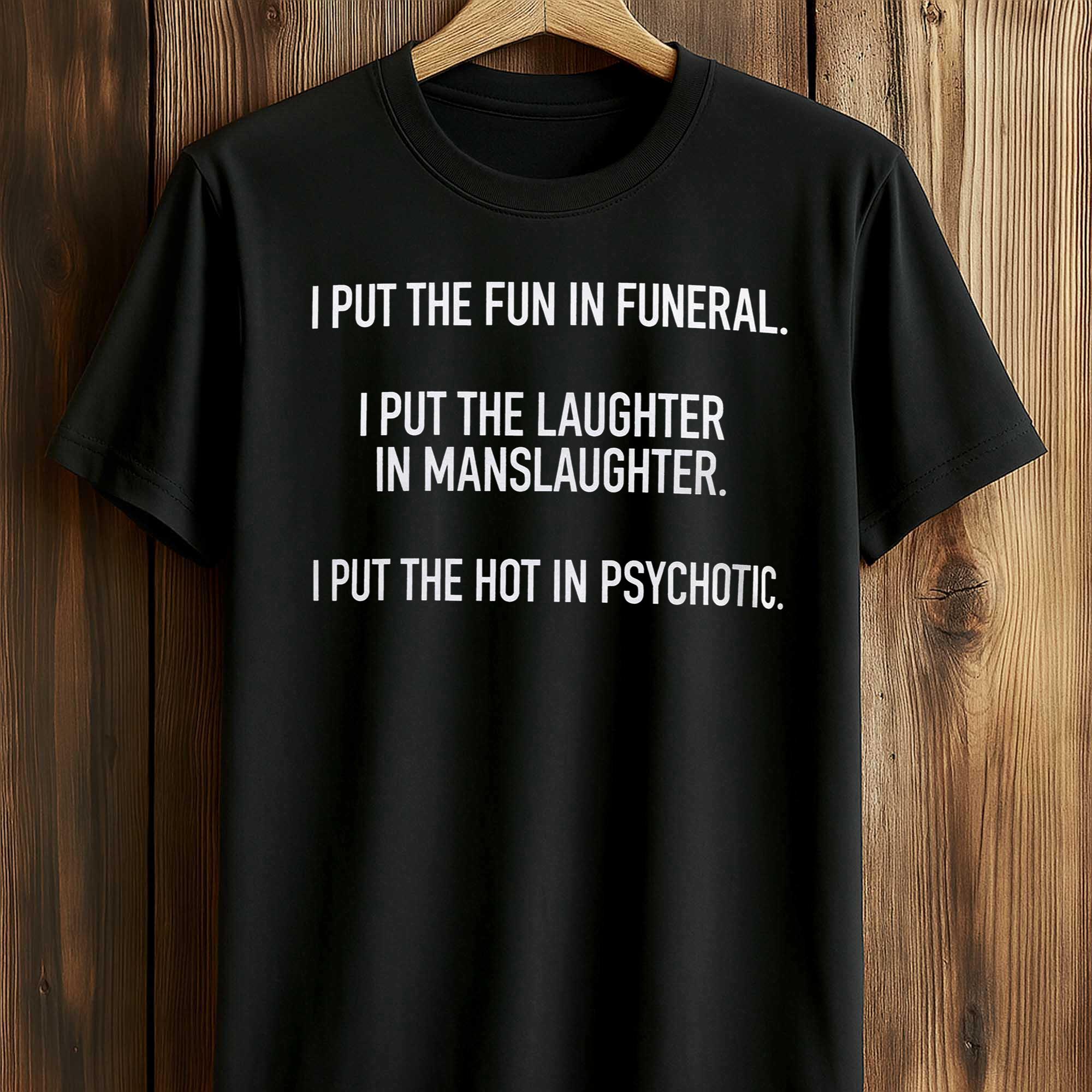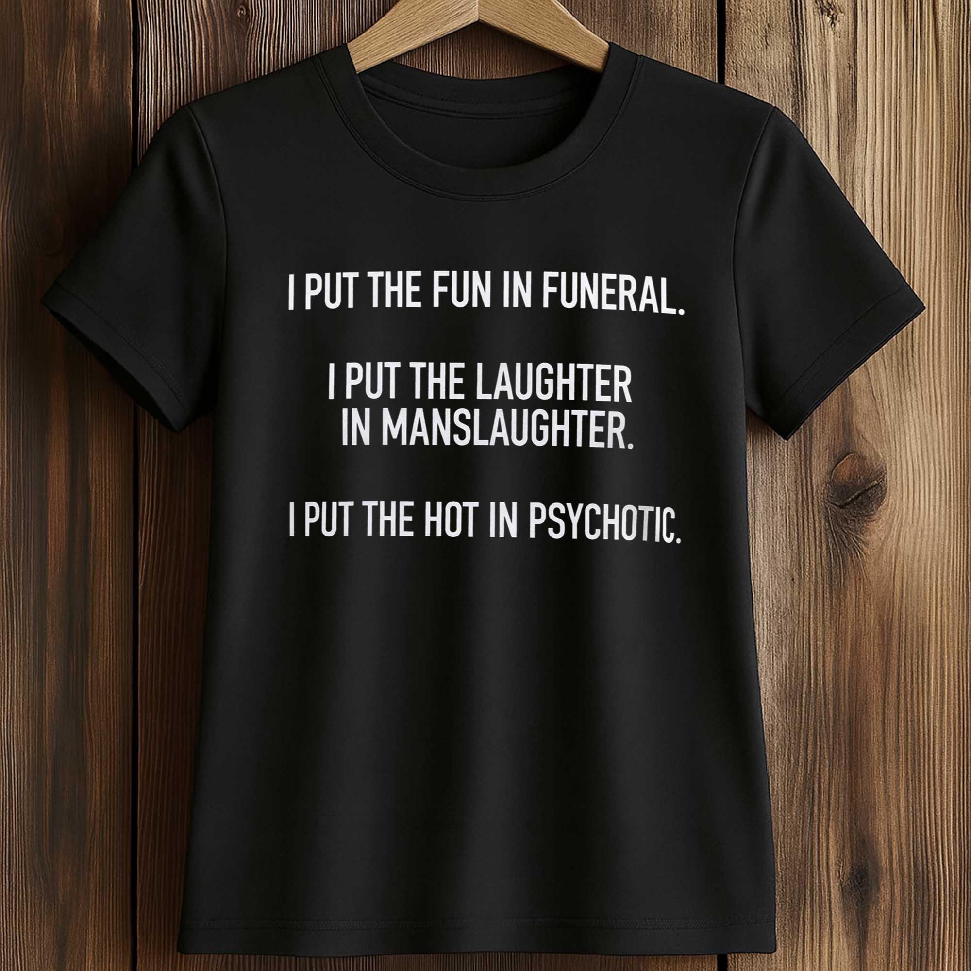 The I Put The Fun In Funeral I Put The Laughter In Manslaughter I Put The Hot In Psychotic Shirt is attracting attention from fans of dark humor and edgy fashion. T-shirts with bold quotes are trending, and this design stands out by combining irony and confidence in a clear, easy-to-read layout. This shirt appeals to those who like to express their personality, make an impression, and spark conversation without complex patterns.