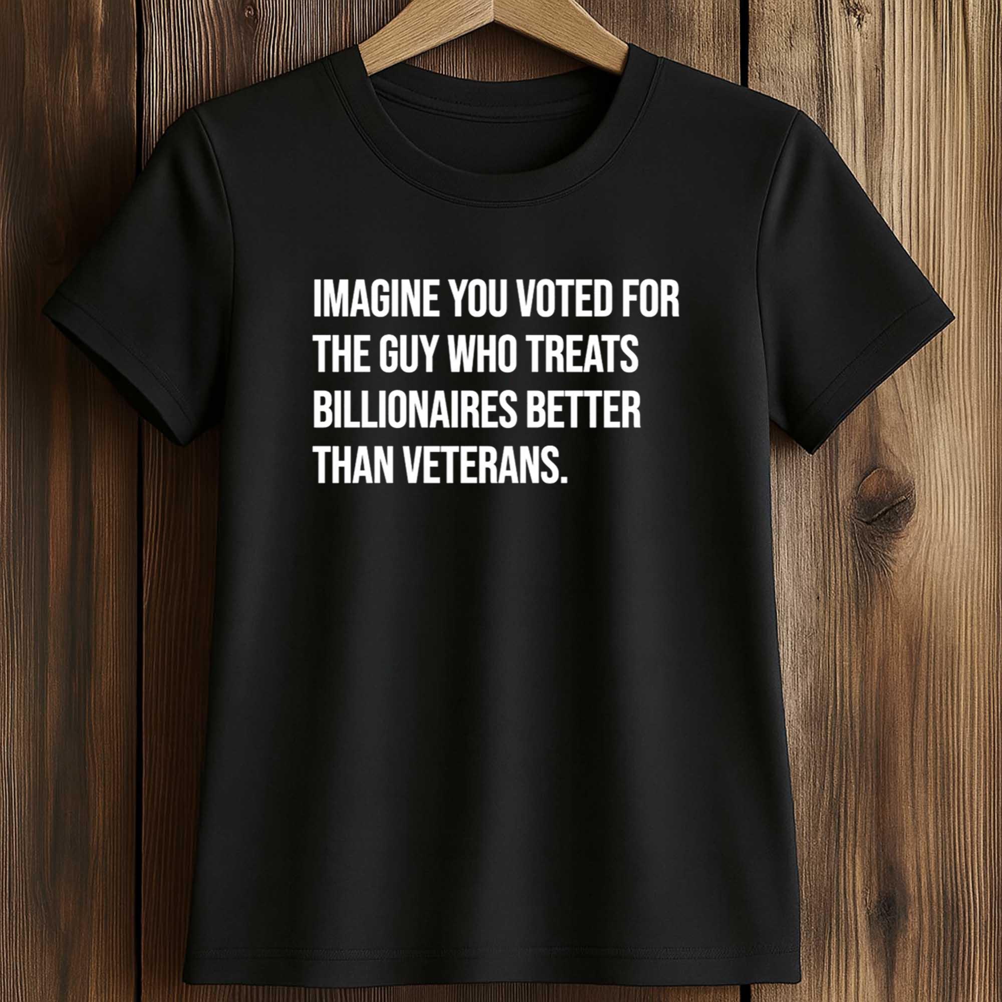 T-shirt with the text “Imagine you voted for someone who treats veterans at a higher rate than wealthy people” – A bold statement in simple form