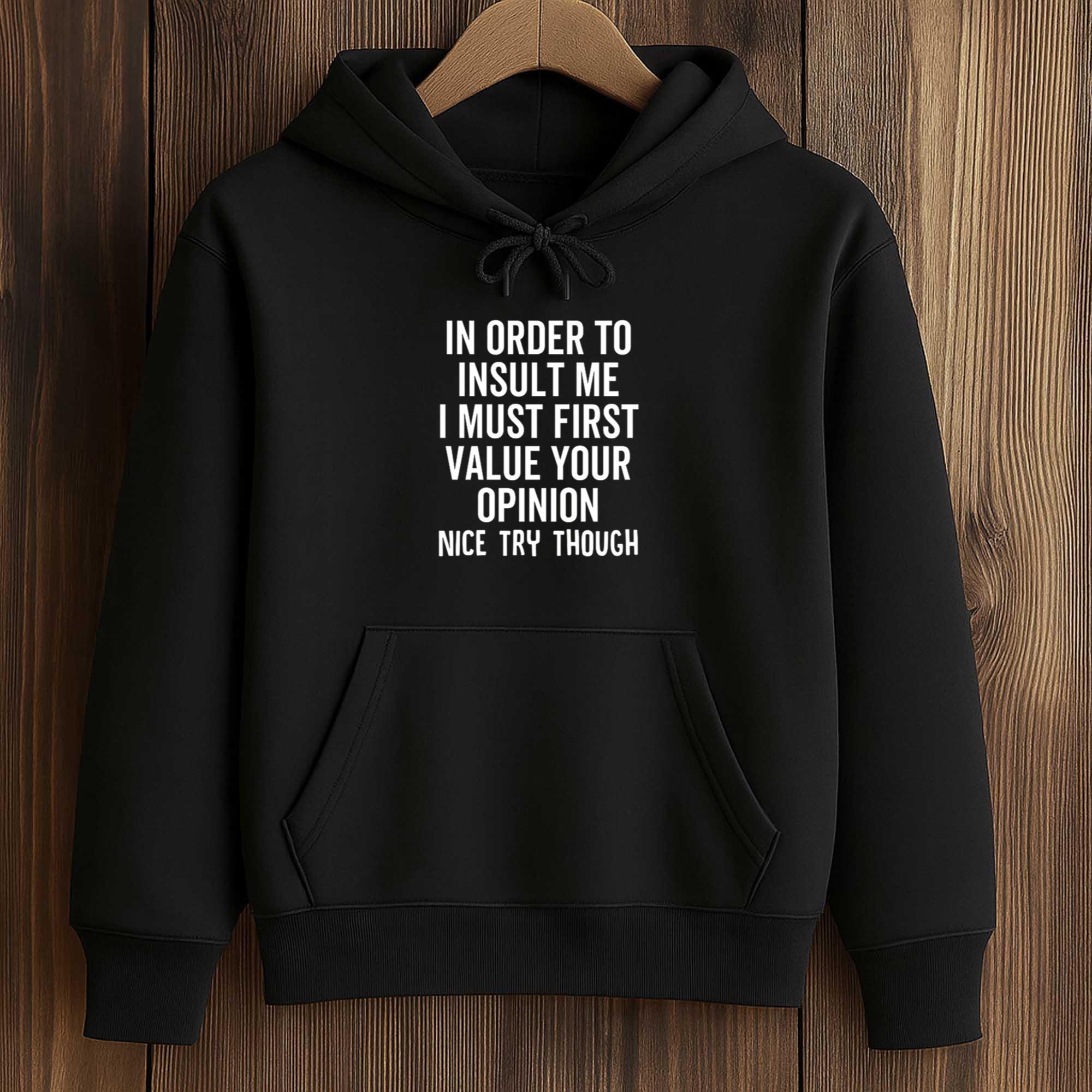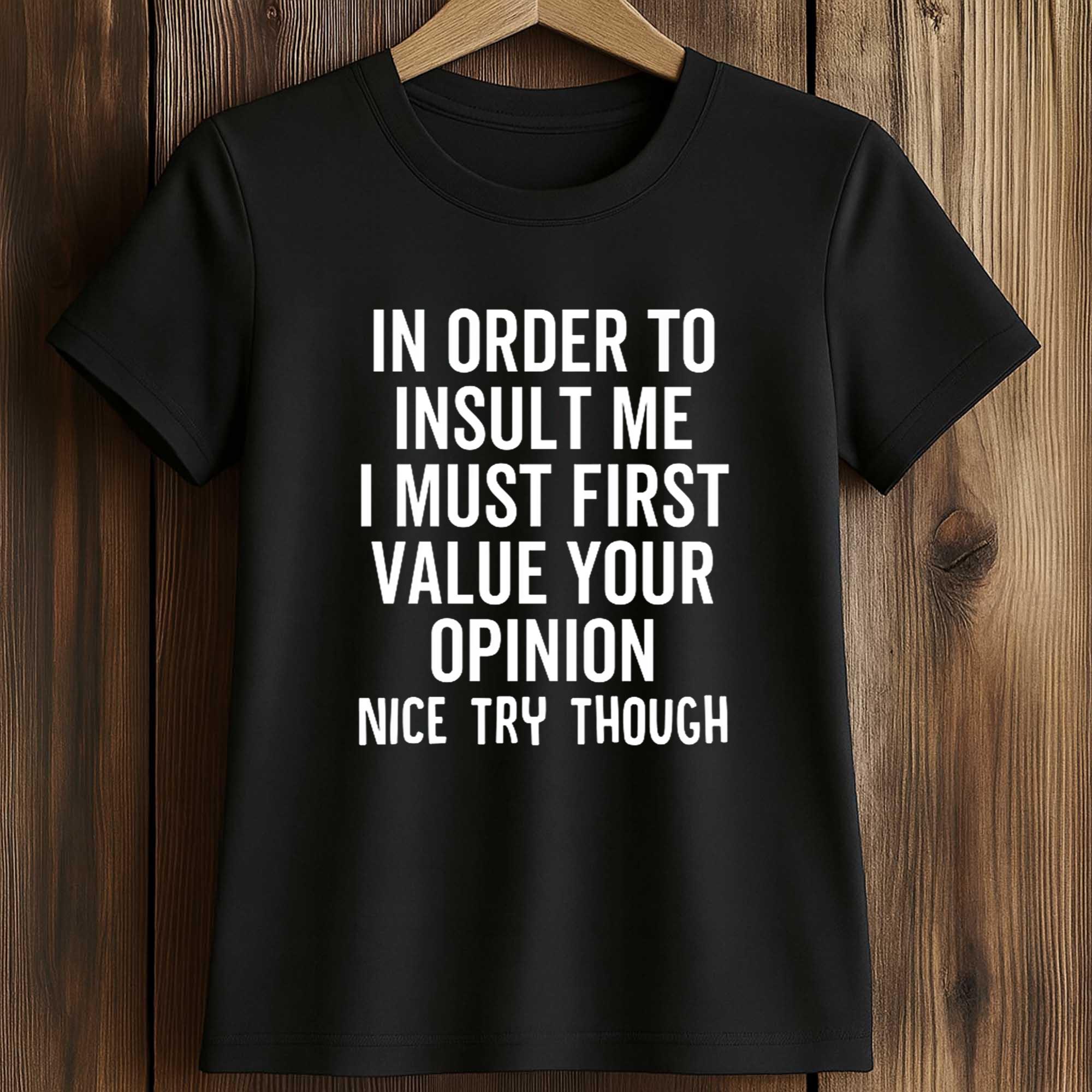 This In Order To Insult Me I Must First Value Your Opinion Nice Try Though Shirt quote is gaining attention for its sharp humor and confident tone. With the rise of satirical and witty fashion items online, this shirt perfectly fits the wave of street fashion that expresses individuality. The direct message makes this shirt popular among young people who like to express their personality in a fun and playful way.