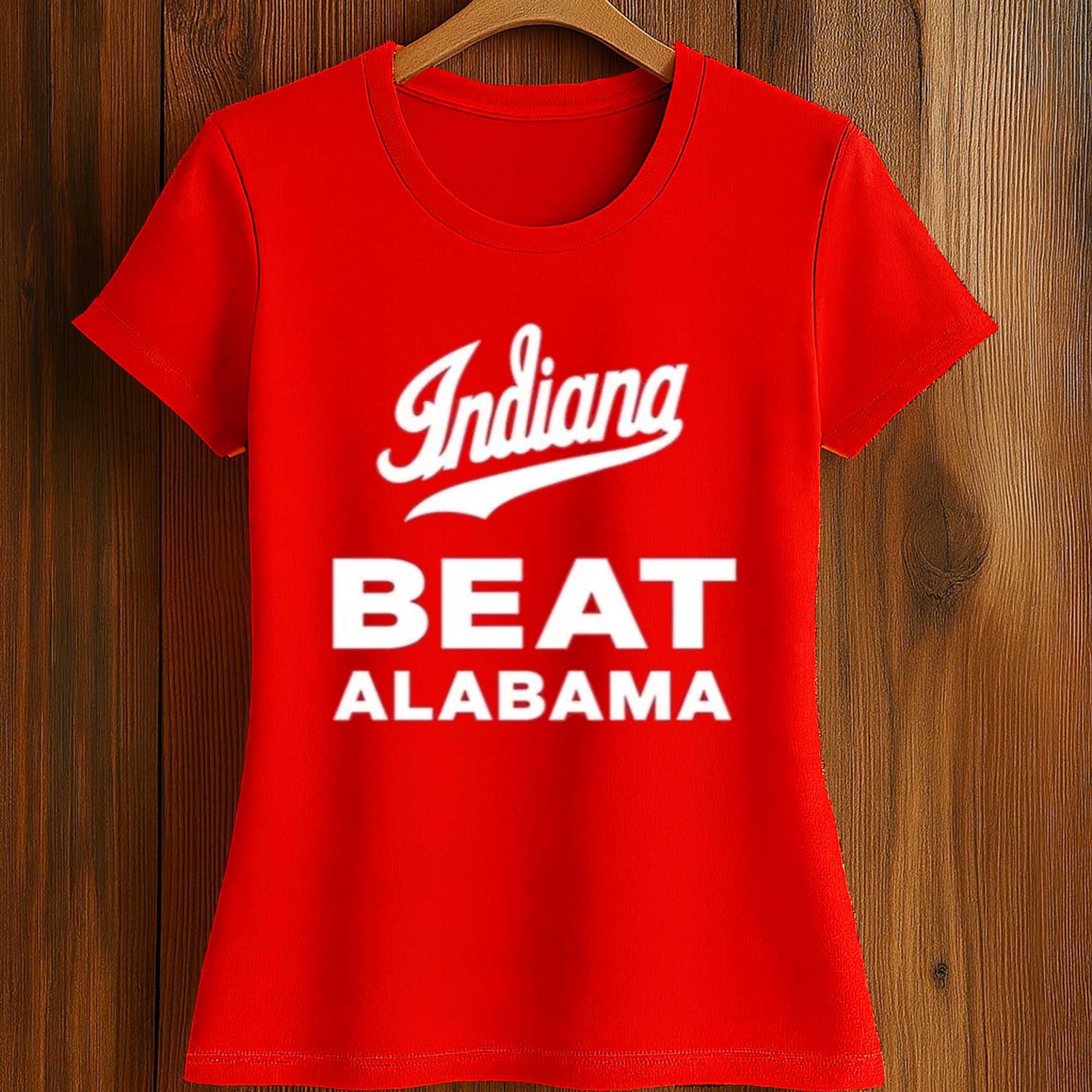 The Indiana Beat Alabama Shirt features a bold red background combined with bold white typography, conveying a clear and confident message. The word “Indiana” is written in a handwritten style at the top, while “Beat Alabama” is centrally positioned, making the message unmissable. The design is simple, powerful, and stands out in a crowd, at the stadium, or in everyday life.