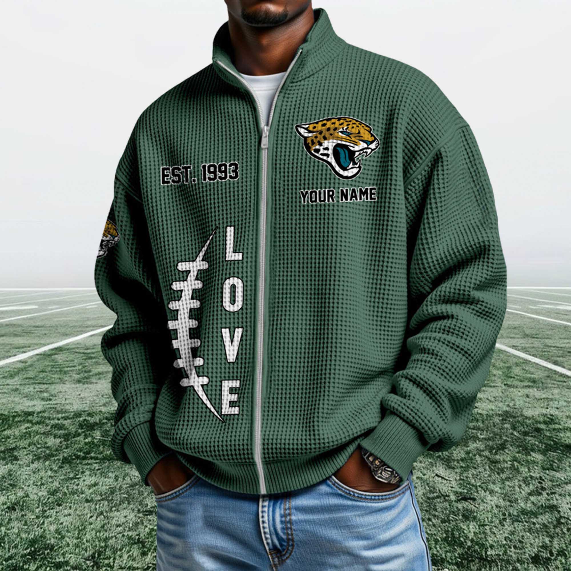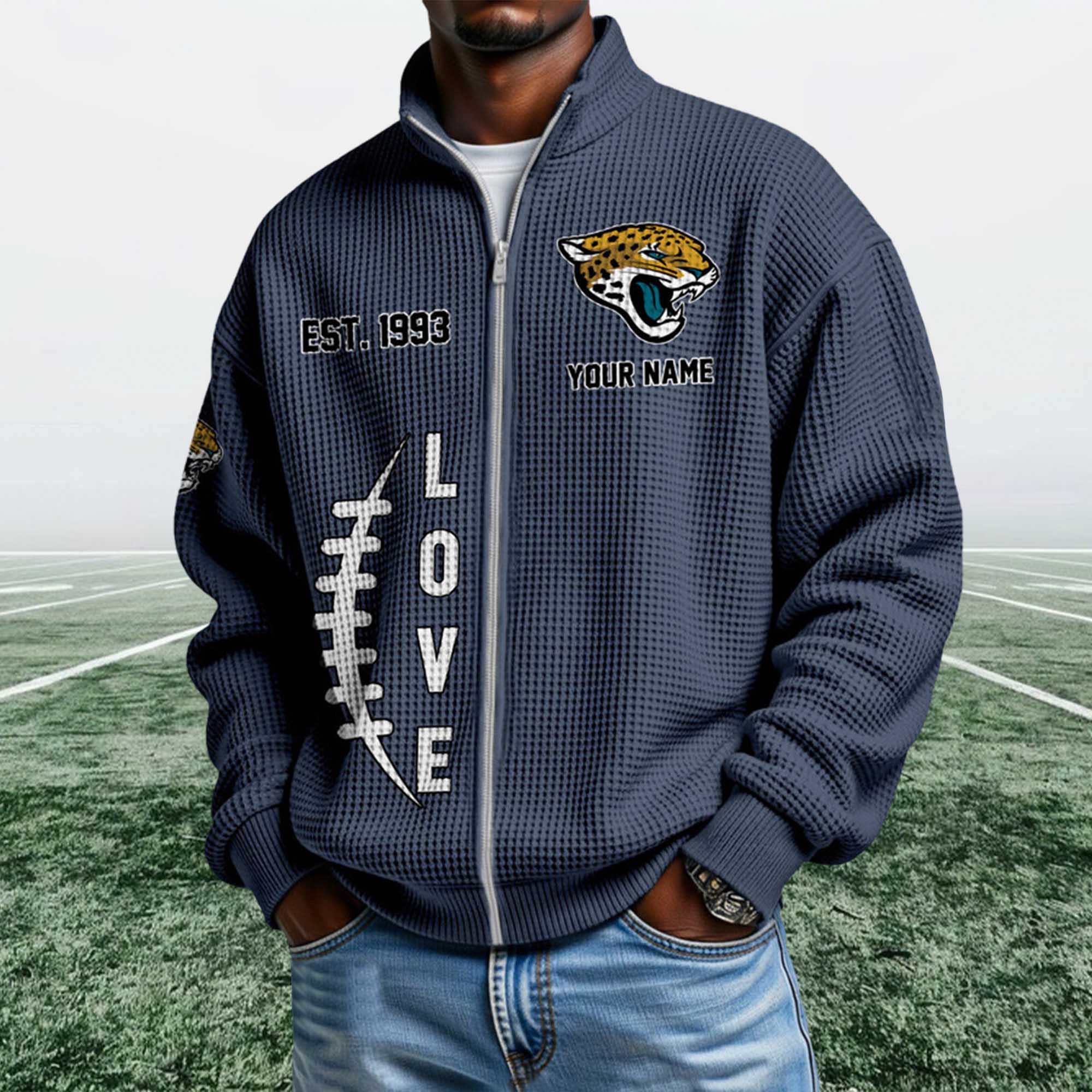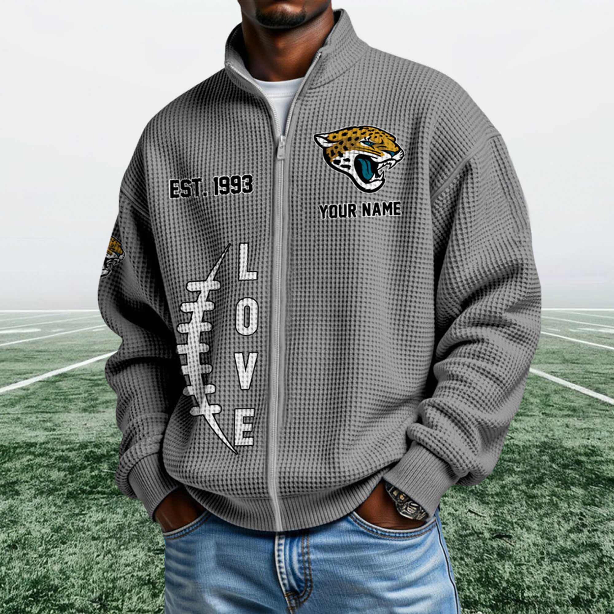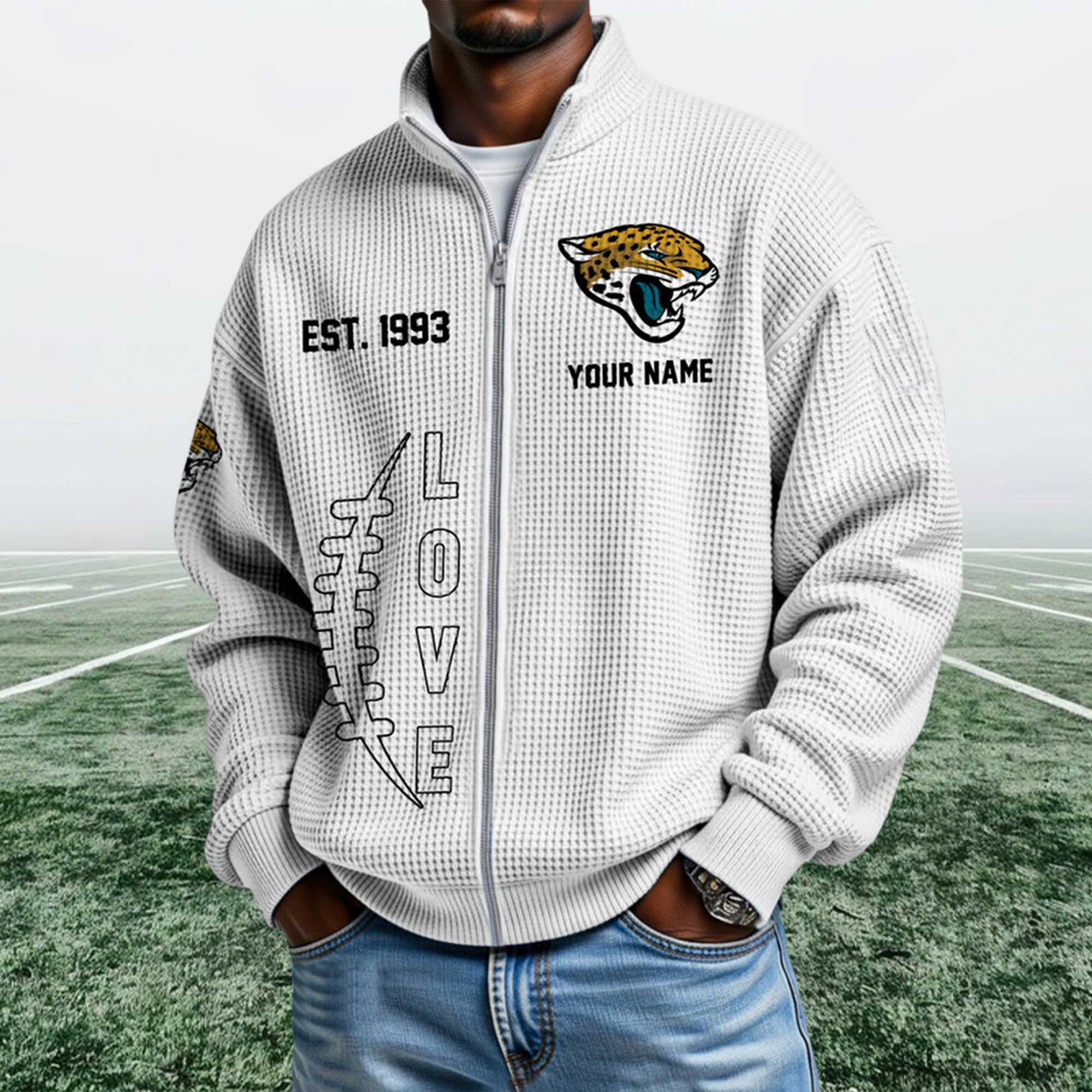 The Jaguars EST 1993 Quarter Zip Waffle Sweatshirt reflects the current trend toward heritage-inspired fan apparel. Today’s fans want personalized and easy-to-wear clothing outside of game days. This design highlights the team’s founding year with bold graphics, modern fleece material, and a ¼ zip-up collar that naturally fits into everyday wear.