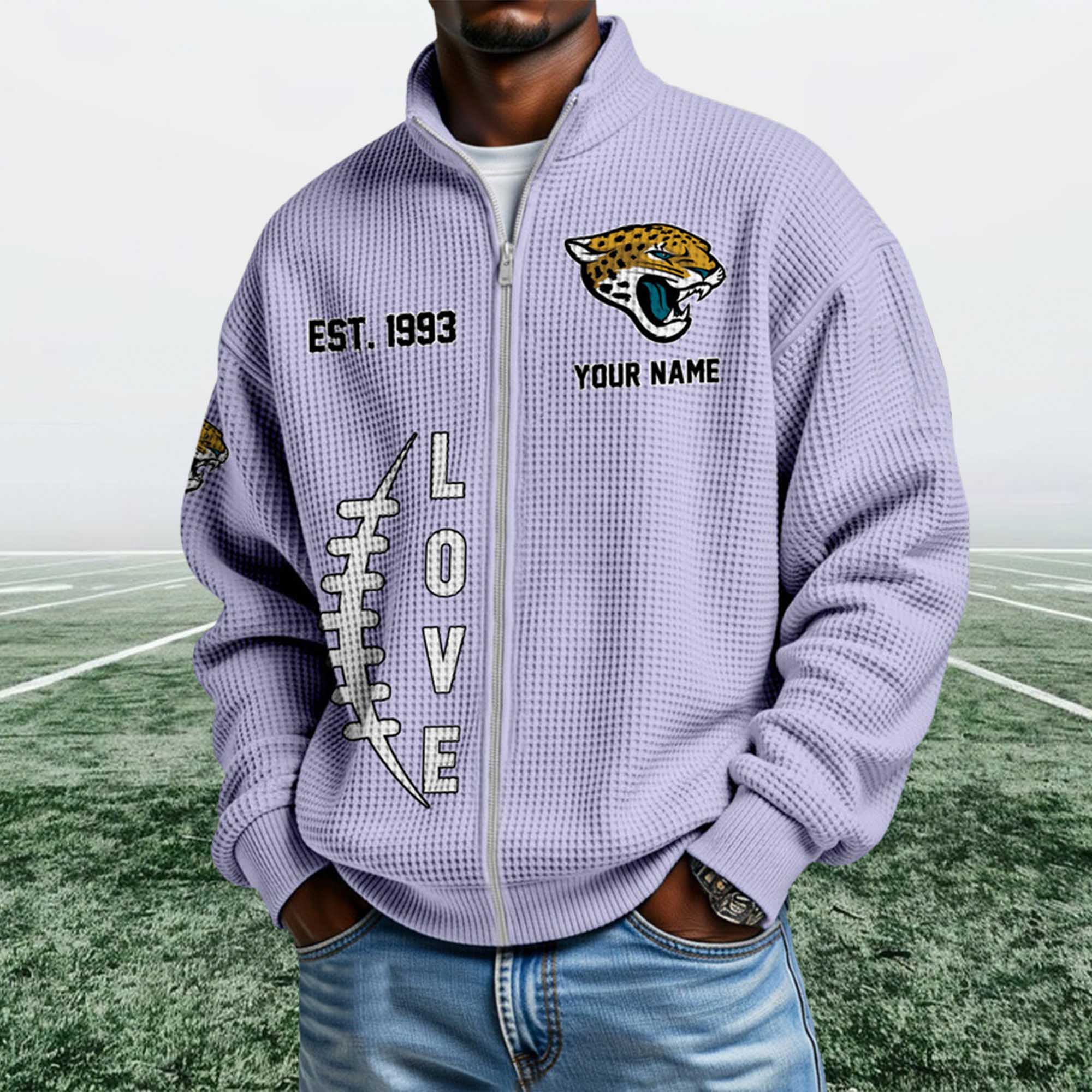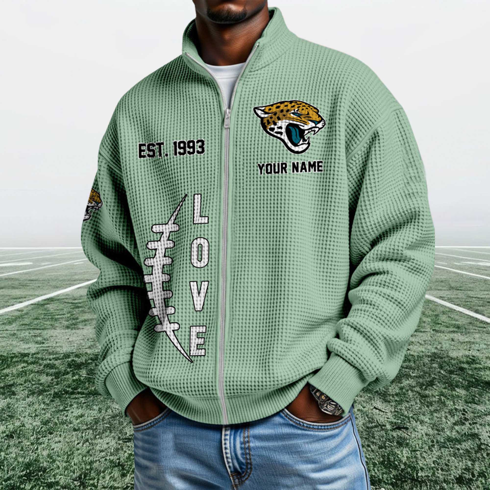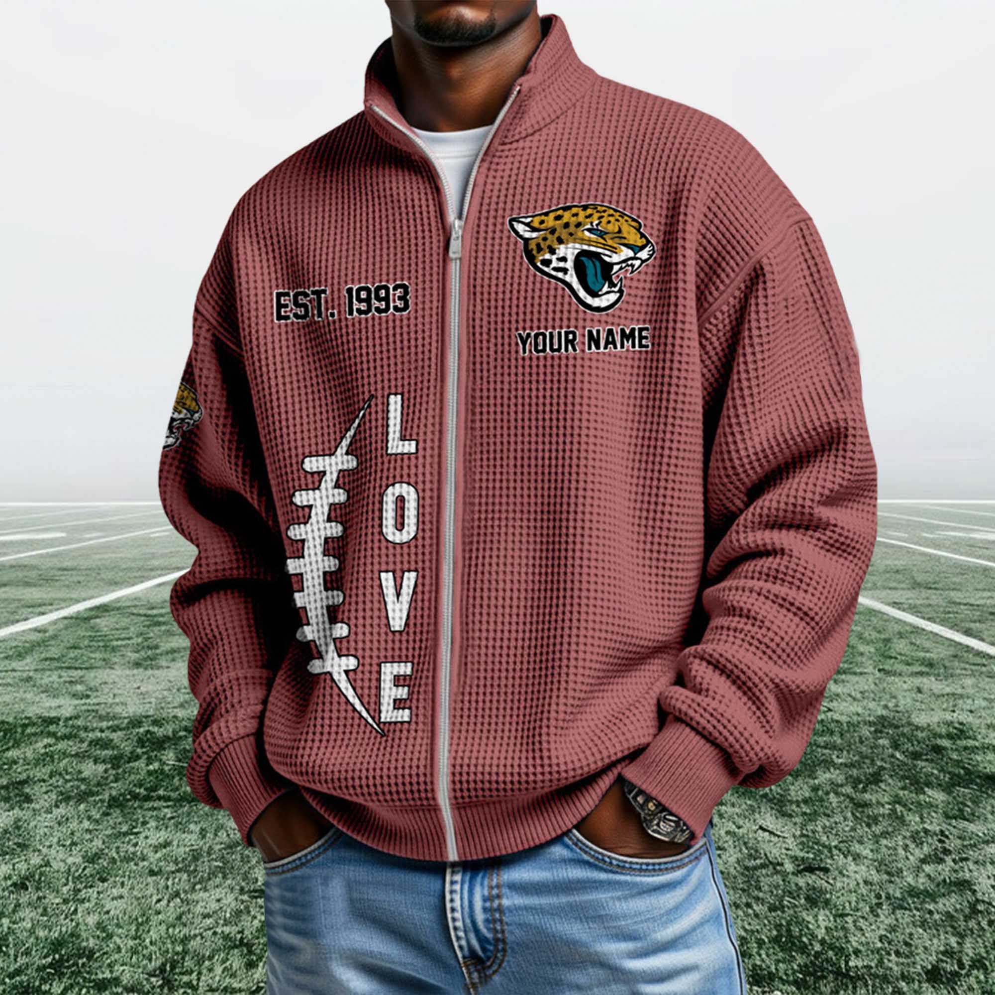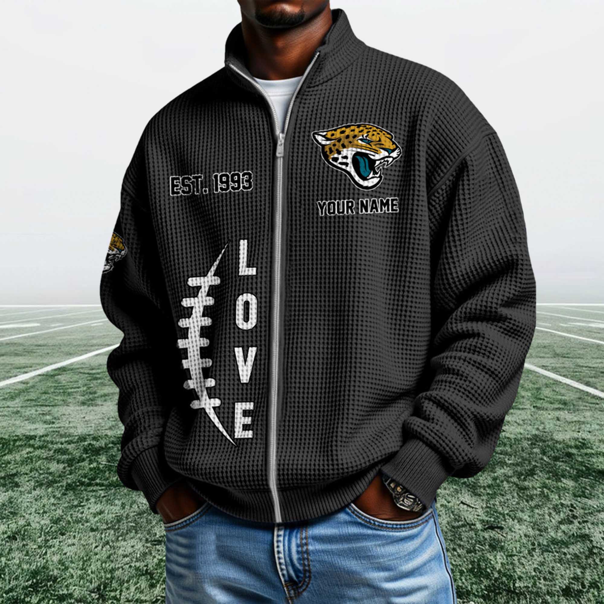 The Jaguars EST 1993 Quarter Zip Waffle Sweatshirt reflects the current trend toward heritage-inspired fan apparel. Today’s fans want personalized and easy-to-wear clothing outside of game days. This design highlights the team’s founding year with bold graphics, modern fleece material, and a ¼ zip-up collar that naturally fits into everyday wear.