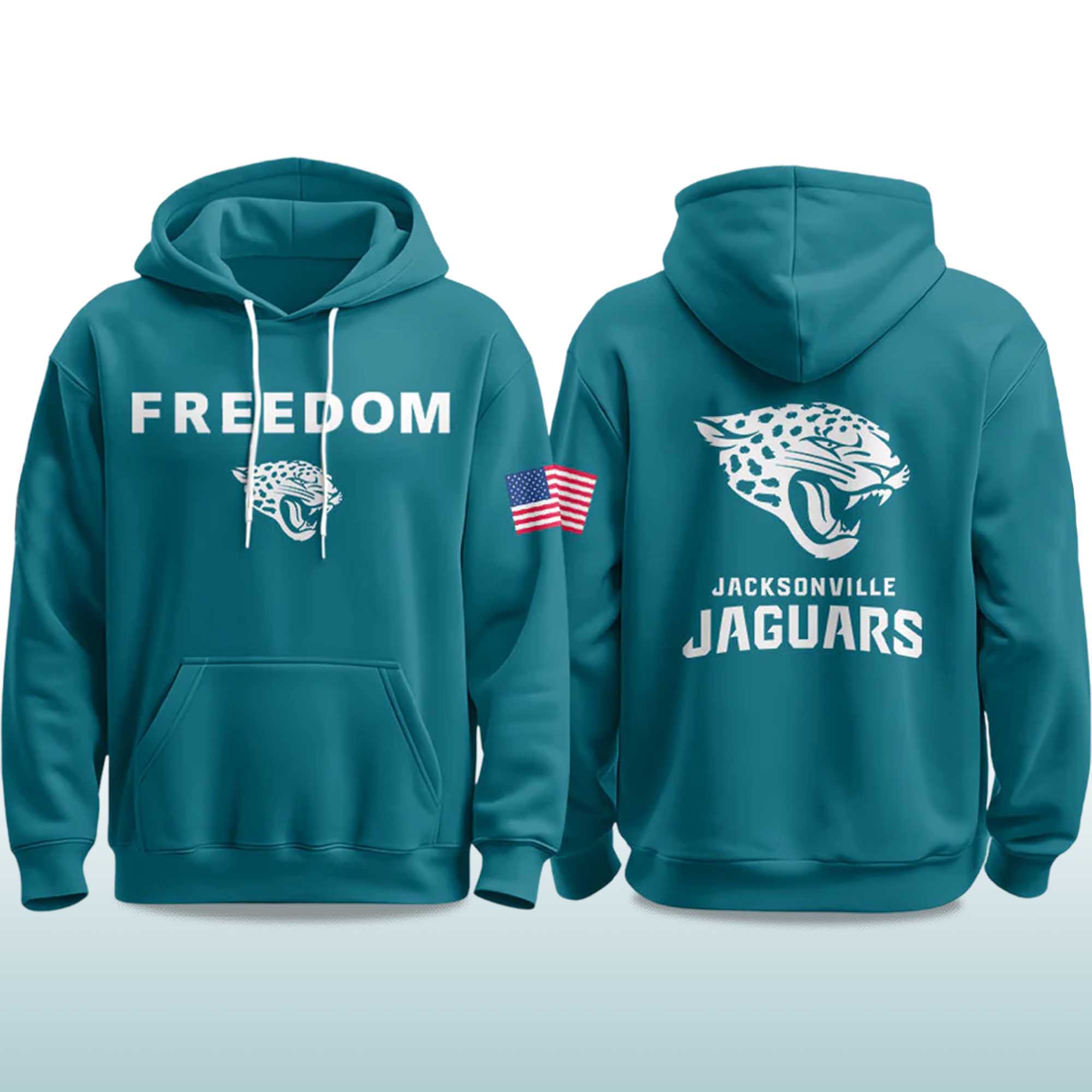 The Jaguars Freedom 2025 Hoodie features a vibrant and energetic design that reflects the excitement of the new season. The teal color stands out at first sight, while the crisp white print and patriotic sleeve details create a balance between team passion and modern style that resonates with today’s fans.