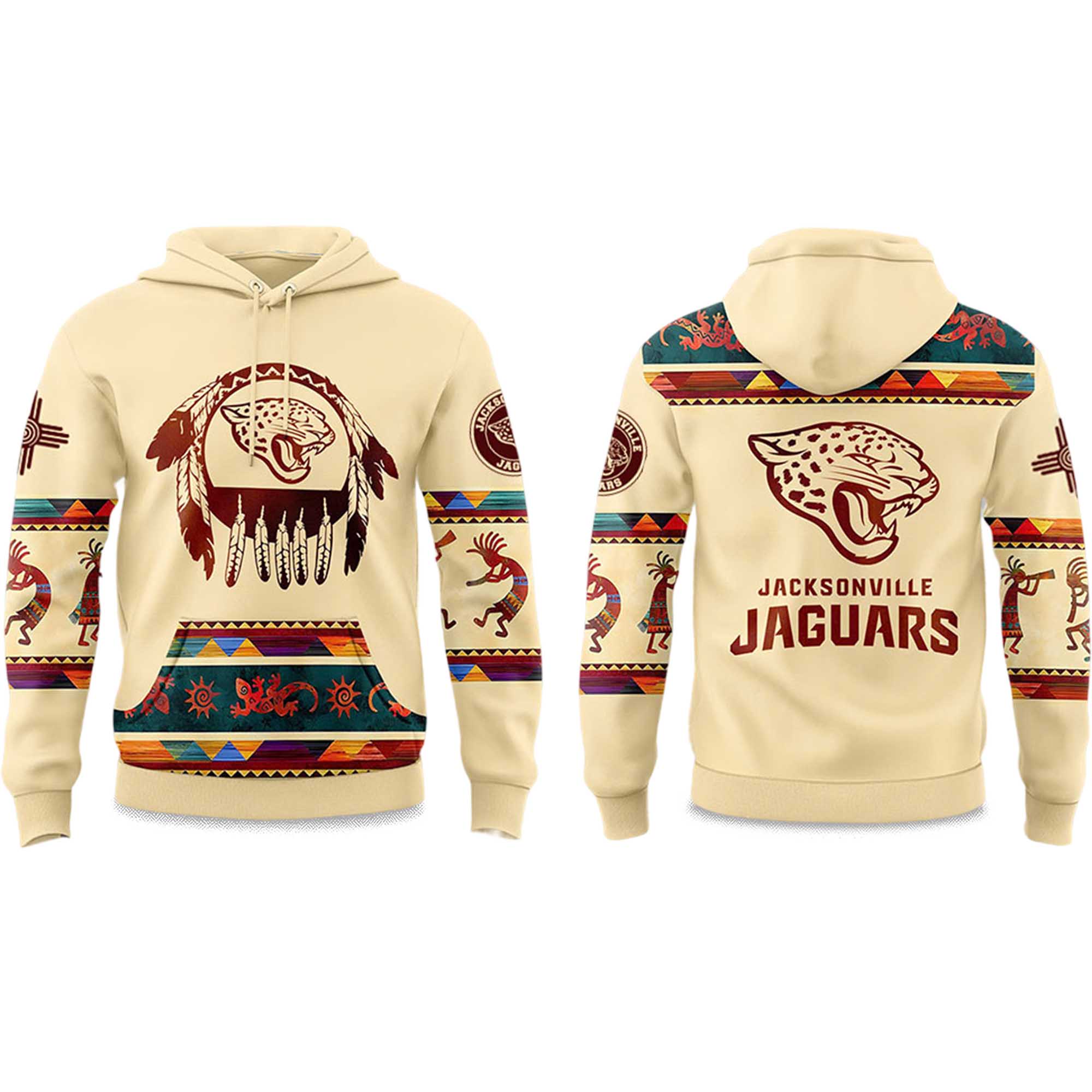 The Jaguars Native American Heritage Month Hoodie features a soft beige color scheme paired with bright tribal-style illustrations and a bold team logo. The warm, expressive pattern creates a look that is both bold and personal, making it a great choice for fans who love apparel with a strong visual and cultural influence.