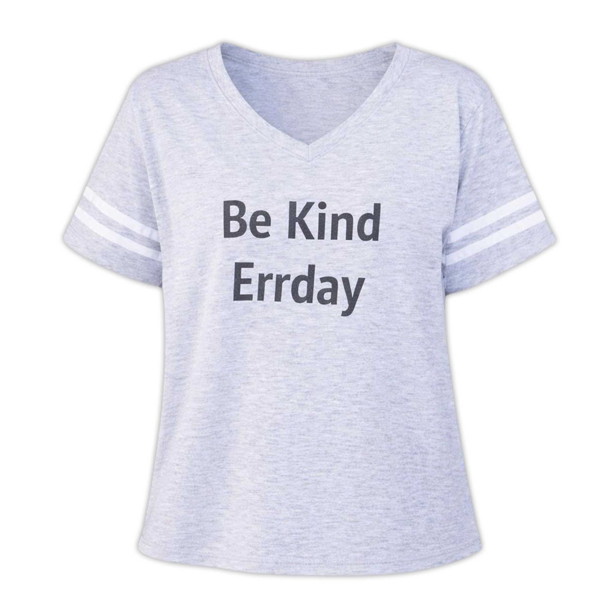 The design keeps things simple and modern with the phrase Be Kind Every Day printed in a simple, easy-to-read font on the front. The neutral tones complement the soft fabric color well, creating a calm and balanced look. Small stripes on the sleeves add a sporty touch without overshadowing the message. The overall style gives a light, positive feel and is easy to pair with many different outfits.