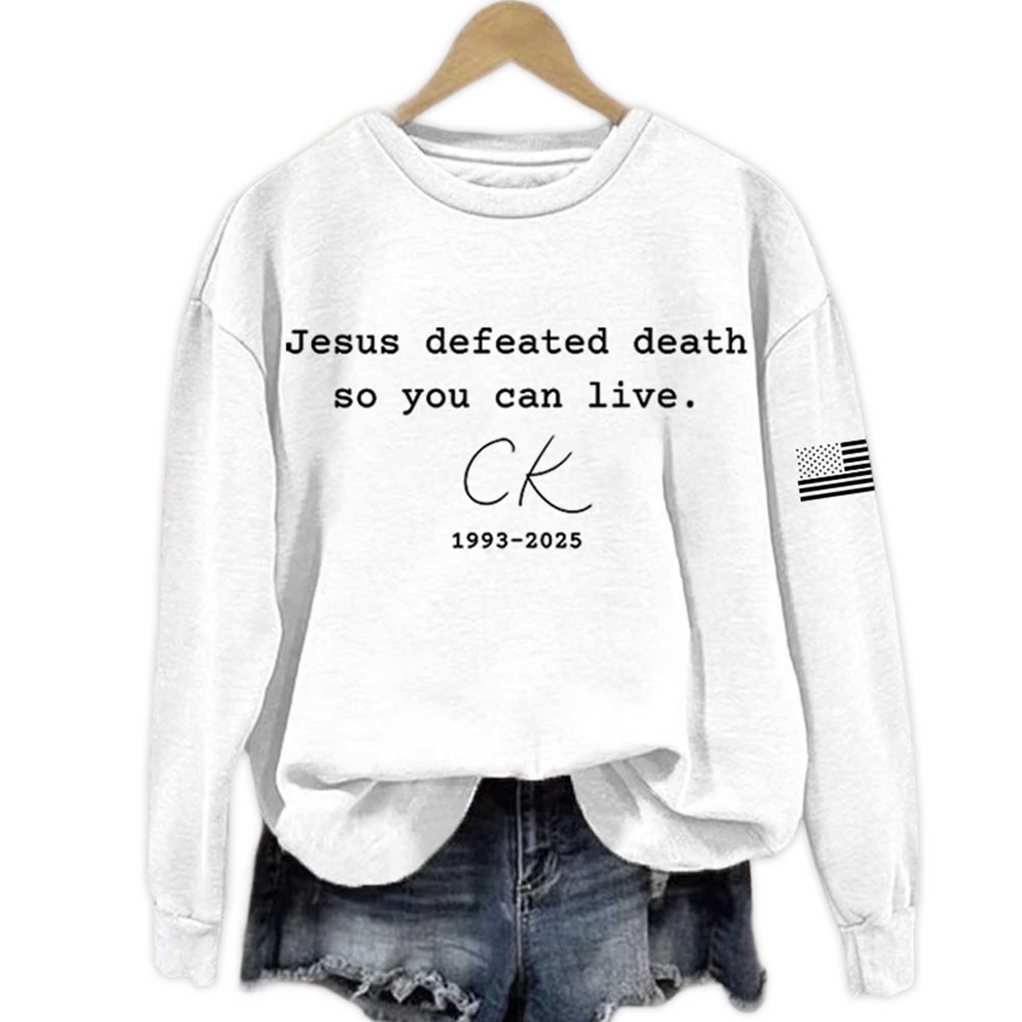 The sweatshirt features a minimalist white lettering pattern on a black background, emphasizing clarity and strength. The message “Jesus defeated death so you can live” is boldly printed in the middle, symbolizing the victory of faith over darkness. Below, the initials CK (1993–2025) are printed in an elegant script, adding a touch of personality and nostalgia. The American flag patch on the sleeve adds a subtle patriotic touch, symbolizing freedom and devotion. The soft fleece lining provides warmth and comfort, while reinforced seams ensure durability for all seasons.