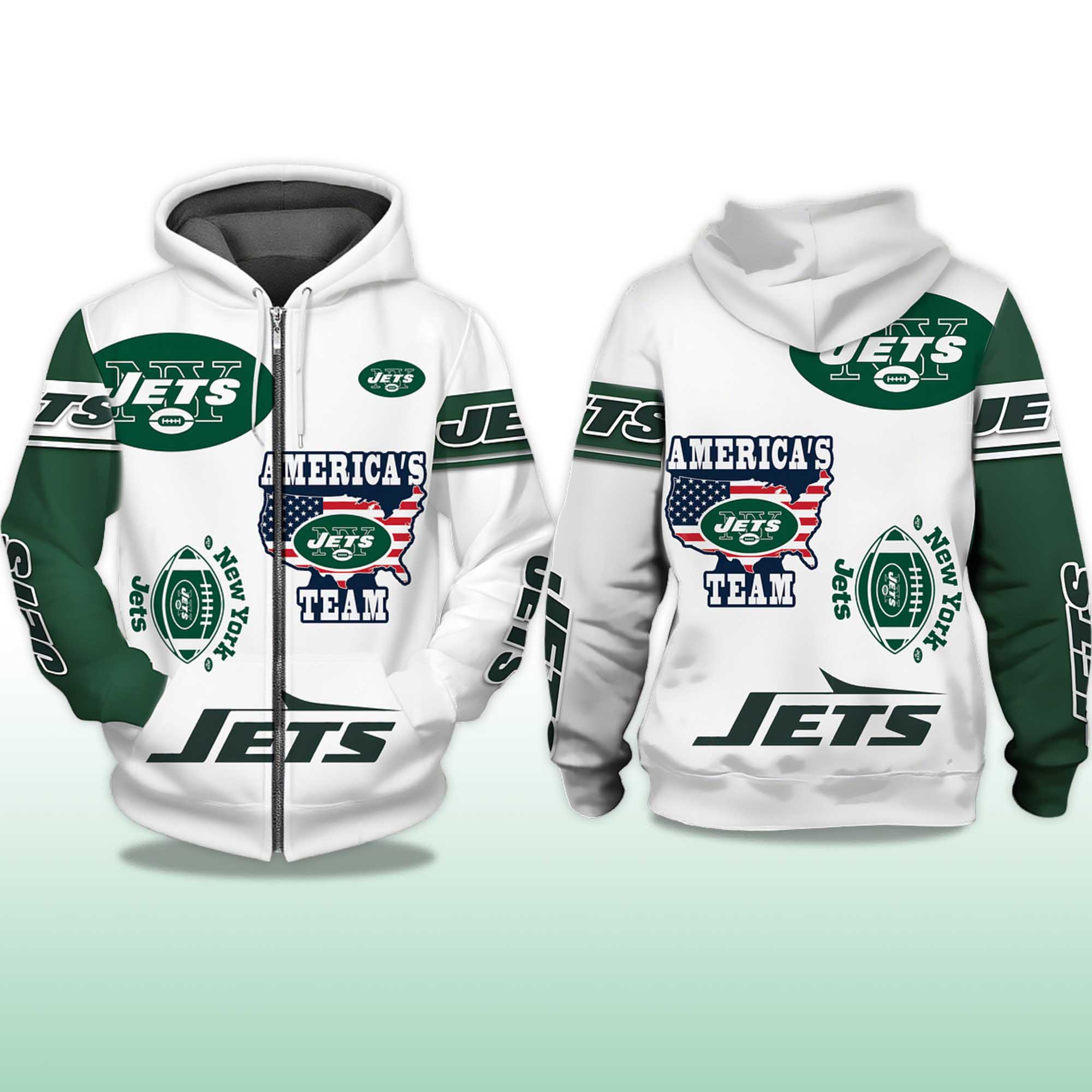 The Jets America’s Team Zip Hoodie is designed for fans who love to show off their team colors in bold and stylish ways. With a crisp white base and bold green accents, this hoodie brings a fresh, energetic look to your on-court style. Whether you’re at the stadium, at a BBQ with friends, or layering on a chilly evening, this hoodie will keep you in the Jets spirit.