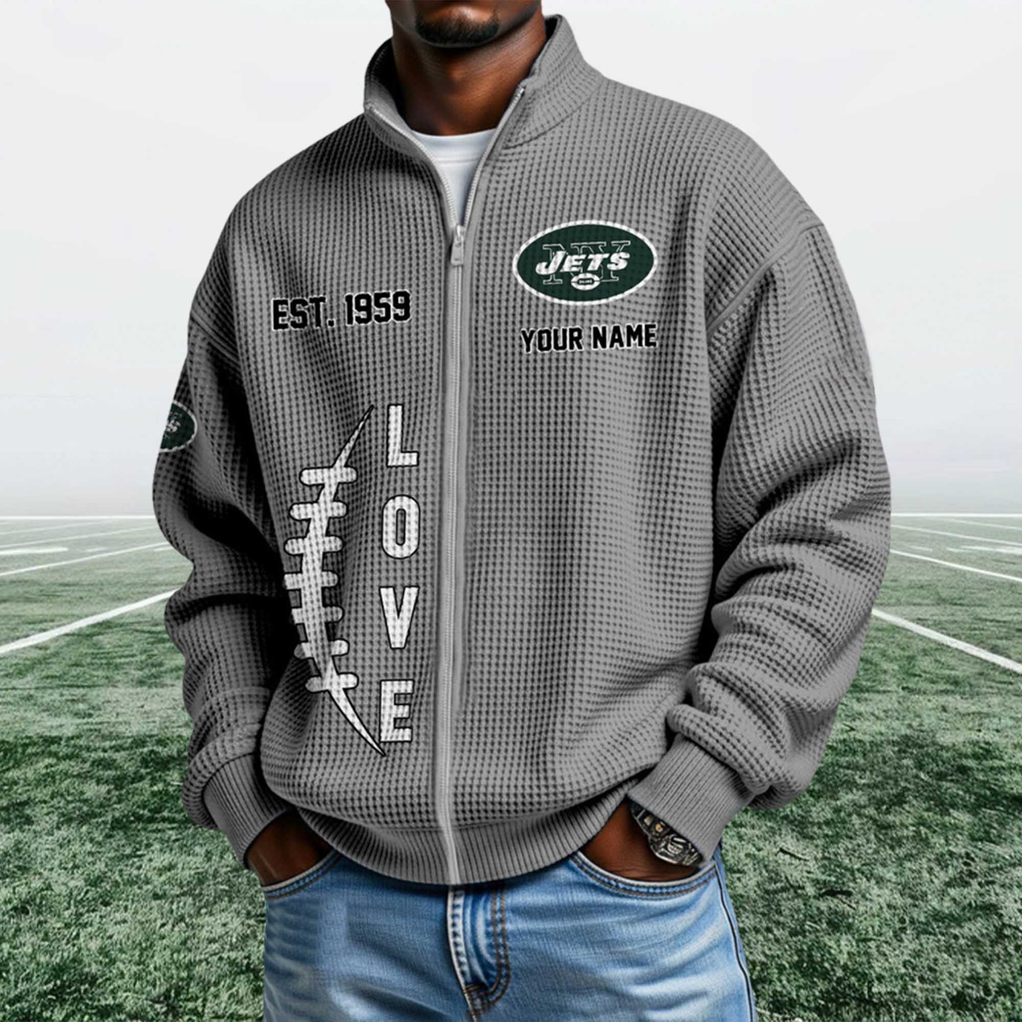 The EST 1959 detail symbolizes the founding year of the Jets, representing decades of tradition, loyalty, and dedication from both players and fans. The graphic imagery along the football theme reinforces the sport’s identity, while the overall design connects past achievements with current fan culture, making this sweatshirt a wearable item to commemorate the Jets’ history.