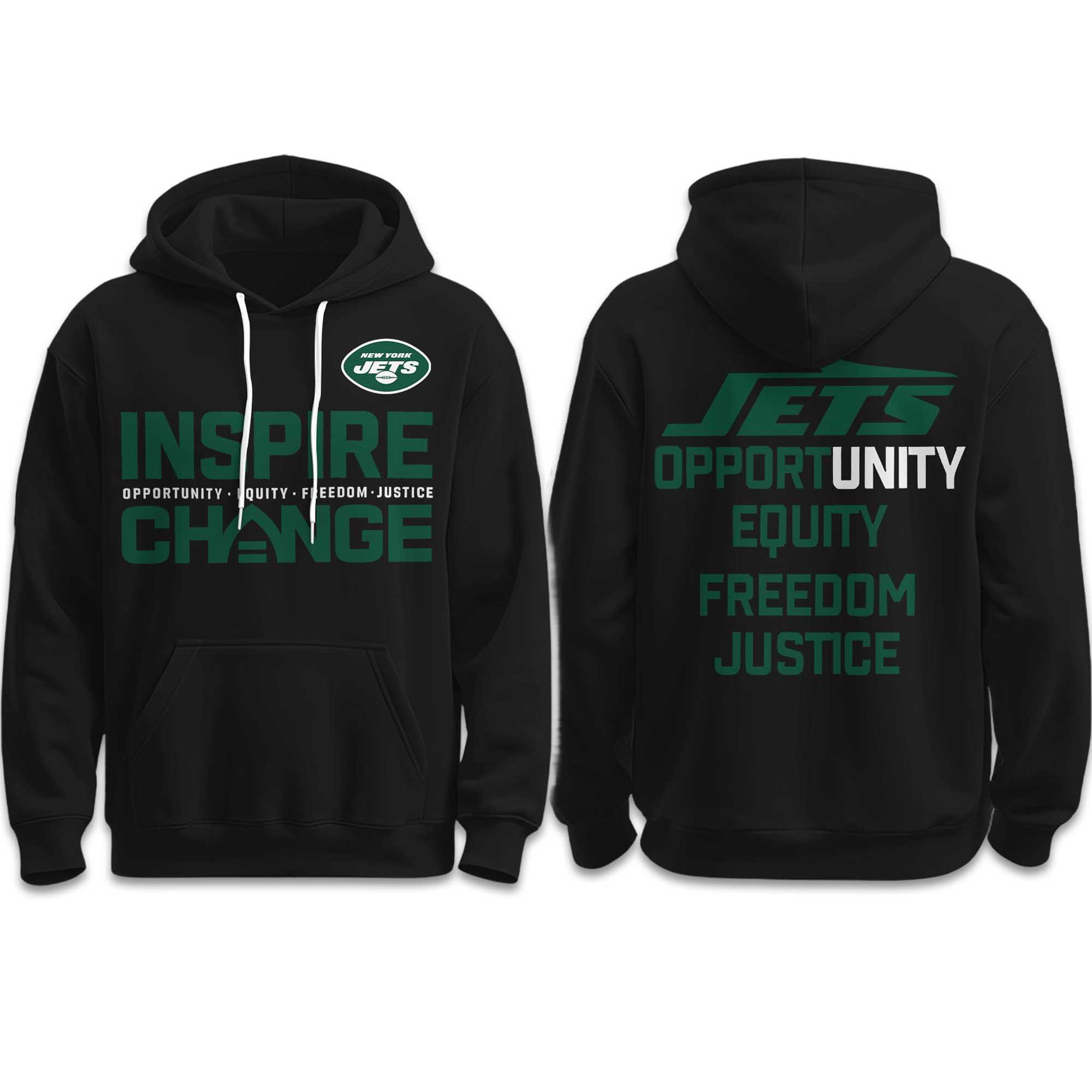 On the front, the words “Inspire Change” appear alongside the Jets logo in a balanced, easy-to-read layout. The back highlights messages about opportunity, equity, freedom, and justice printed in overlapping green lettering, standing out clearly. Ribbed cuffs and hem help the hoodie maintain its shape over time. The black and green color combination creates a modern, elegant, trendy, and easy-to-style look.