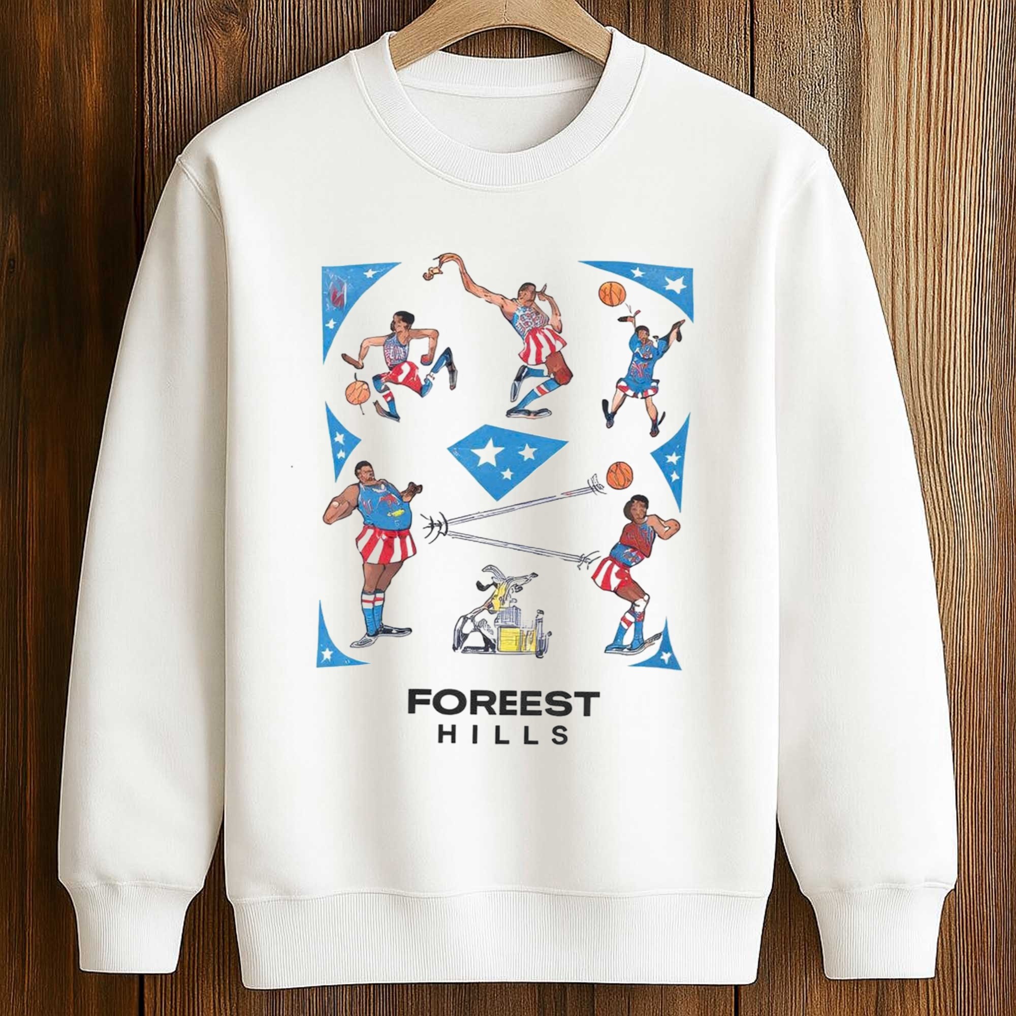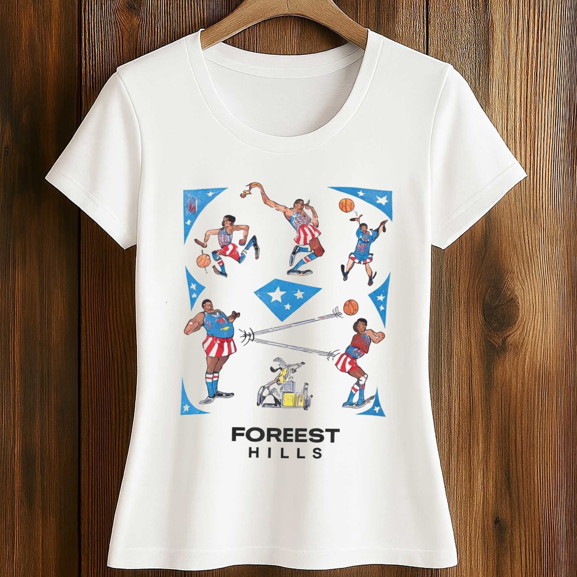 The front image depicts various action poses inspired by Jose Alvarado’s agile playing style on the court. The red, white, and blue color scheme creates a vibrant feel reminiscent of a classic sports poster, while the stars and geometric shapes add movement. The bold Forest Hills lettering highlights the design, showcasing hometown identity and connecting the player’s New York roots to the overall look. The playful retro layout makes the shirt eye-catching, nostalgic, and full of personality.