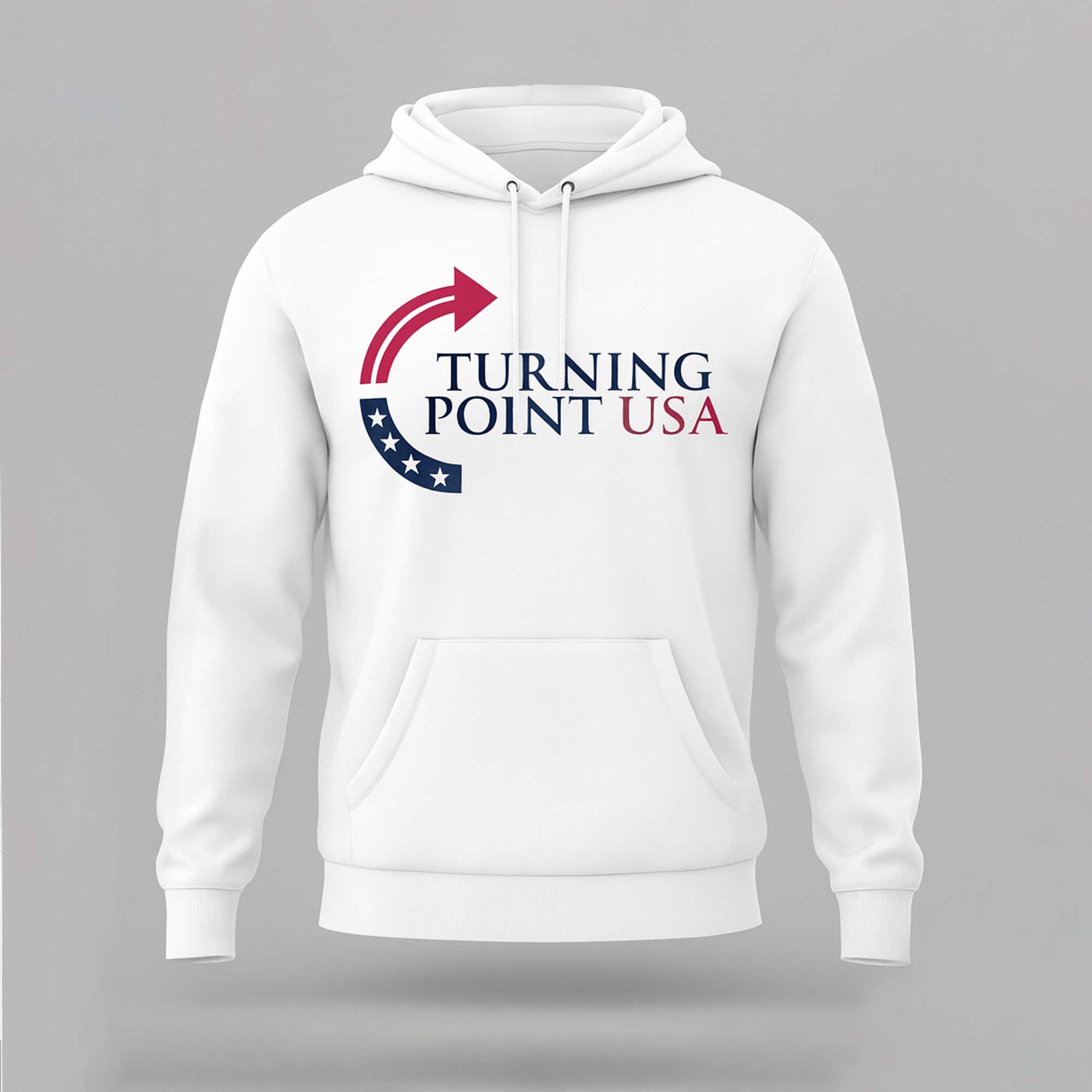 This hoodie features a crisp white base with the Turning Point USA logo—a moving red arrow paired with navy blue stars, representing direction, freedom, and individuality. The bold contrast of red and blue on white creates a sophisticated and modern look. Soft cotton ensures comfort and breathability, while a kangaroo pocket and drawstring hood add warmth and functionality to everyday wear.