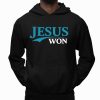 The Kyle Stowers Wearing Jesus Won Shirt features a glossy black base with a striking blue “JESUS” and crisp white “WON” lettering, combined with a dynamic blue swoosh underneath. This minimalist yet bold design combines a modern aesthetic with a timeless message of faith. Unlike typical religious apparel, it has a fresh, sporty feel that appeals to a younger crowd. Whether you’re at a game or a casual gathering, this shirt is sure to stand out as you share a message of hope and victory.
