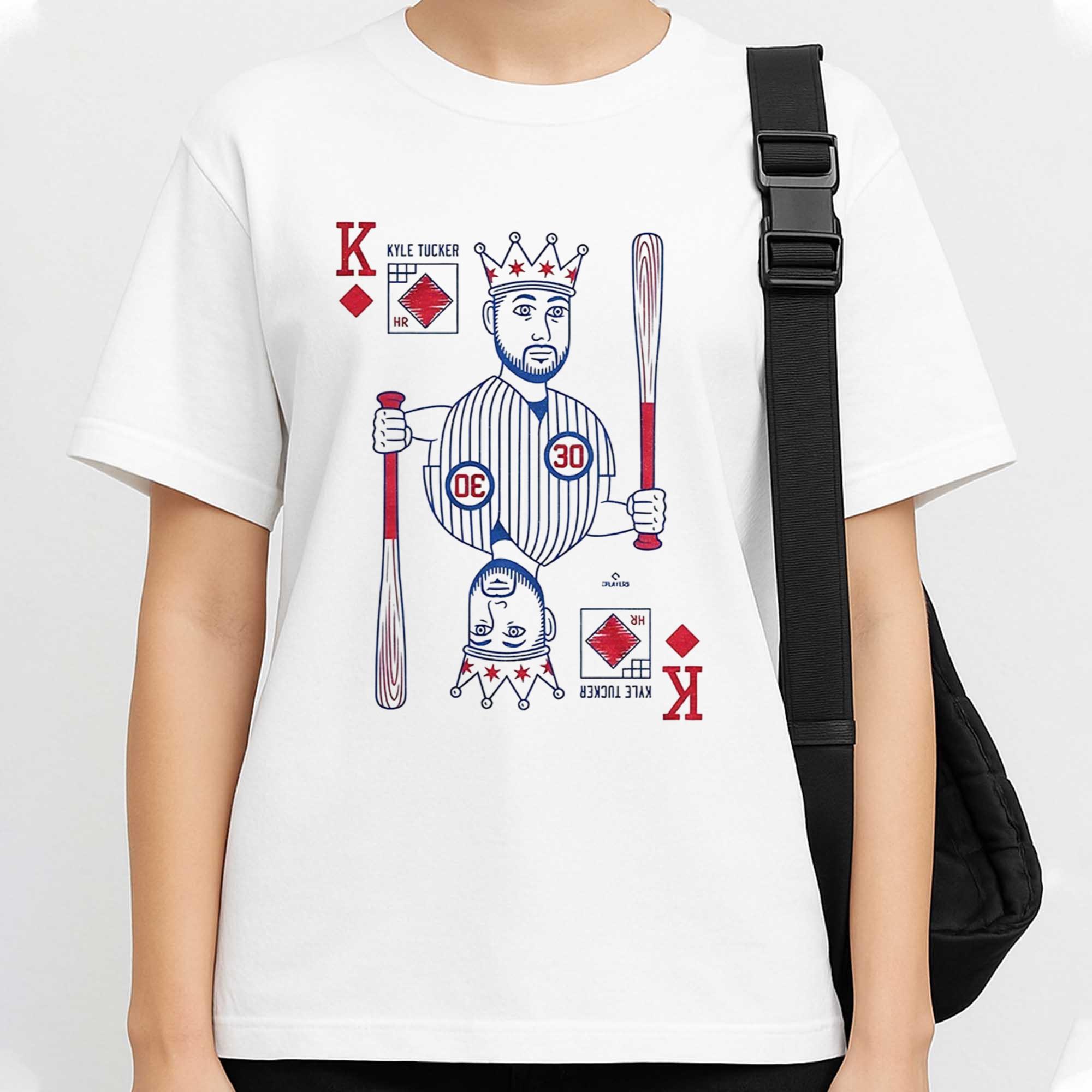 This shirt features a captivating design that transforms Kyle Tucker into the “King of Diamonds” with playing card-inspired graphics. Dressed in Cubs stripes, Tucker confidently swings a baseball bat, surrounded by red and blue accents that pop against a white canvas. The team logo and “King Tuck” text add authenticity, while a reflective card bottom adds a unique look. This isn’t just clothing—it’s a statement of fandom that will turn heads at any game or casual outing.