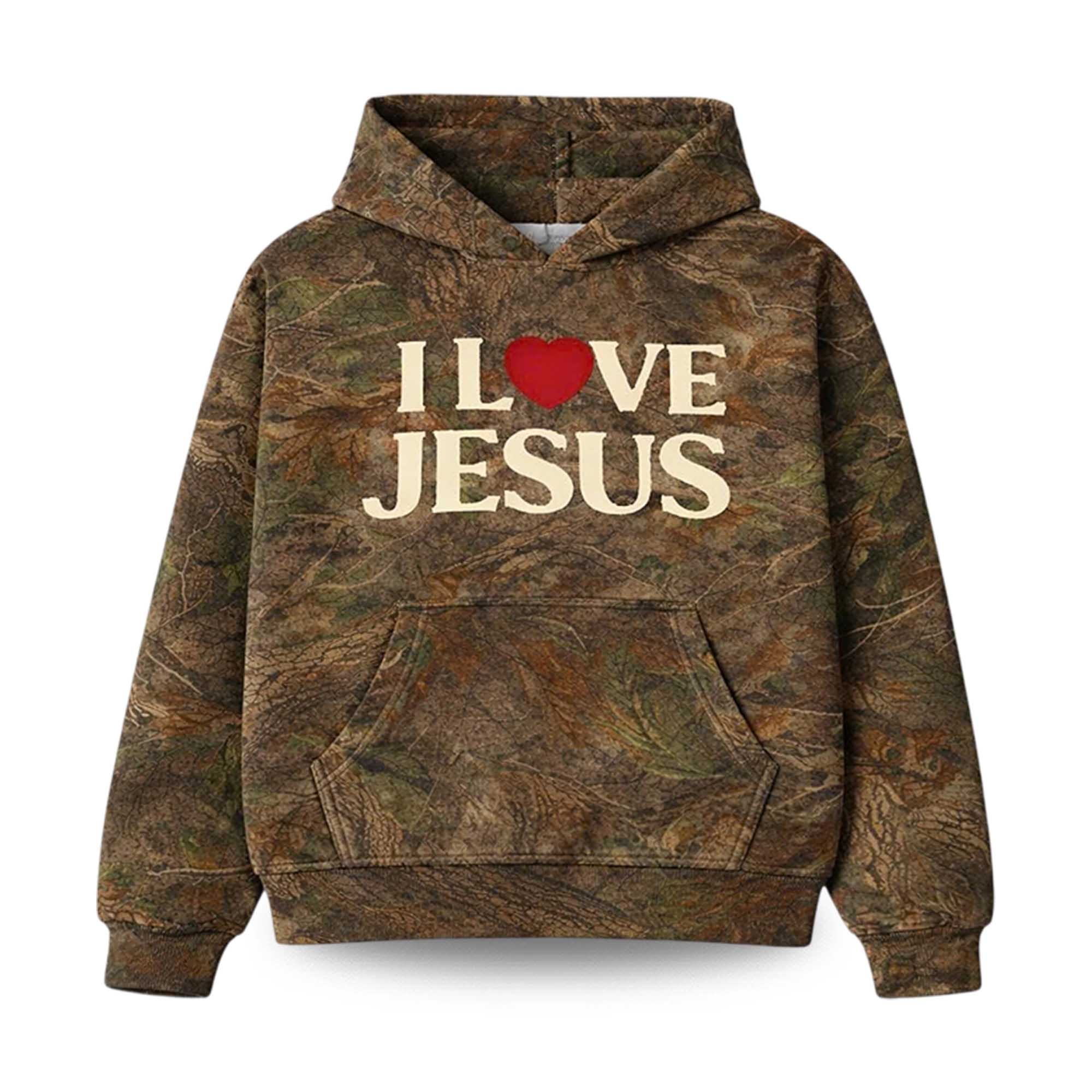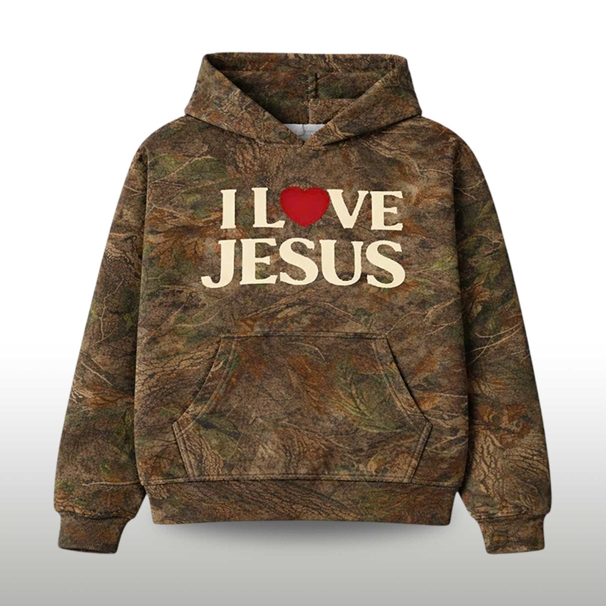 The highlight is the contrast between the camouflage background and the clear, prominent message. The red heart creates an eye-catching accent without overshadowing the design. This balance results in a hoodie that is both sturdy and expressive, perfect for fans who want their attire to reflect both their beliefs and personal style in a confident and sophisticated way.
