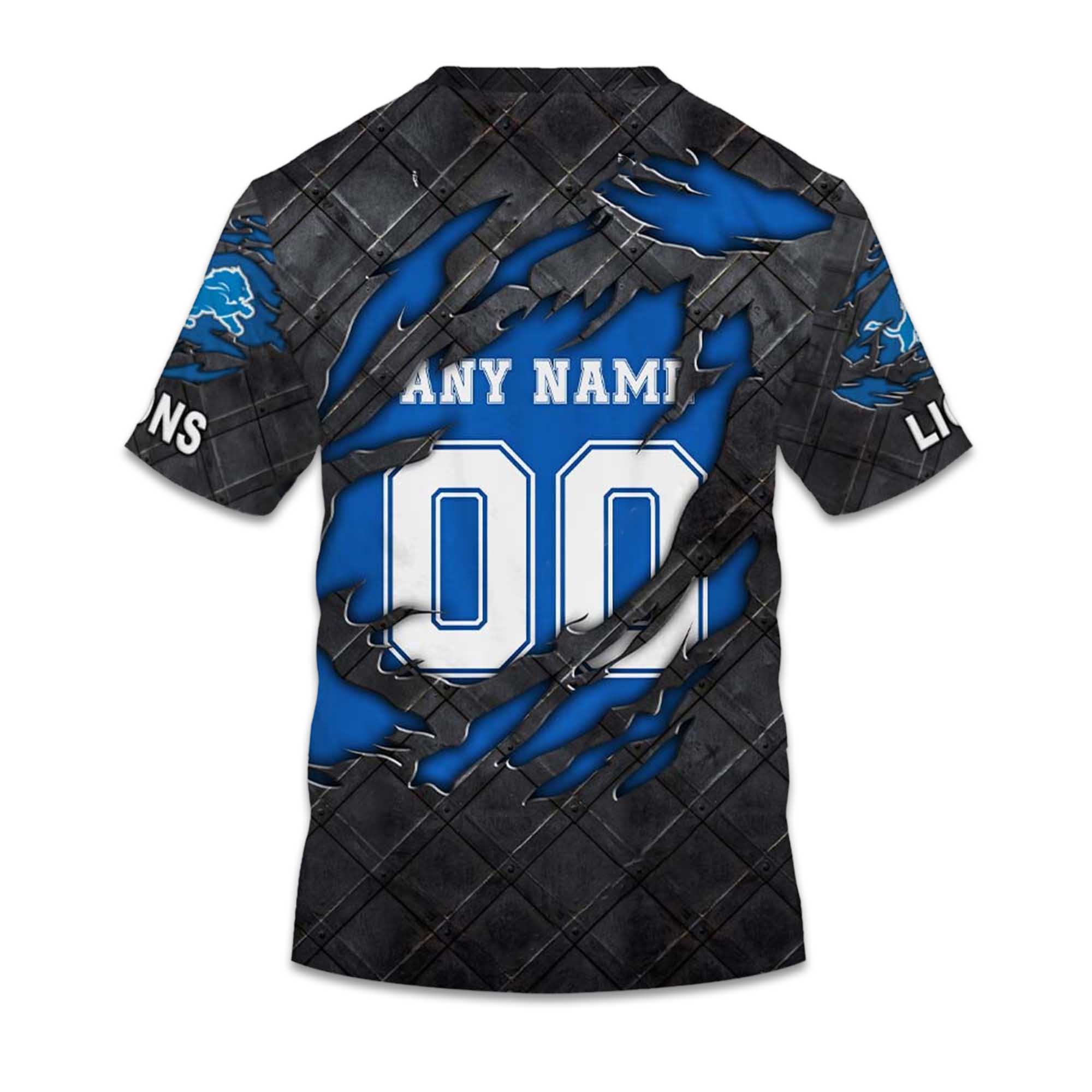 The design uses a deep black color scheme combined with electric blue accents for contrast and depth. The cracked metallic pattern creates a powerful, industrial-inspired look, while the lion logo symbolizes confidence and forward movement. Clean lines and bold imagery give the shirt a strong personality without being overly flashy.