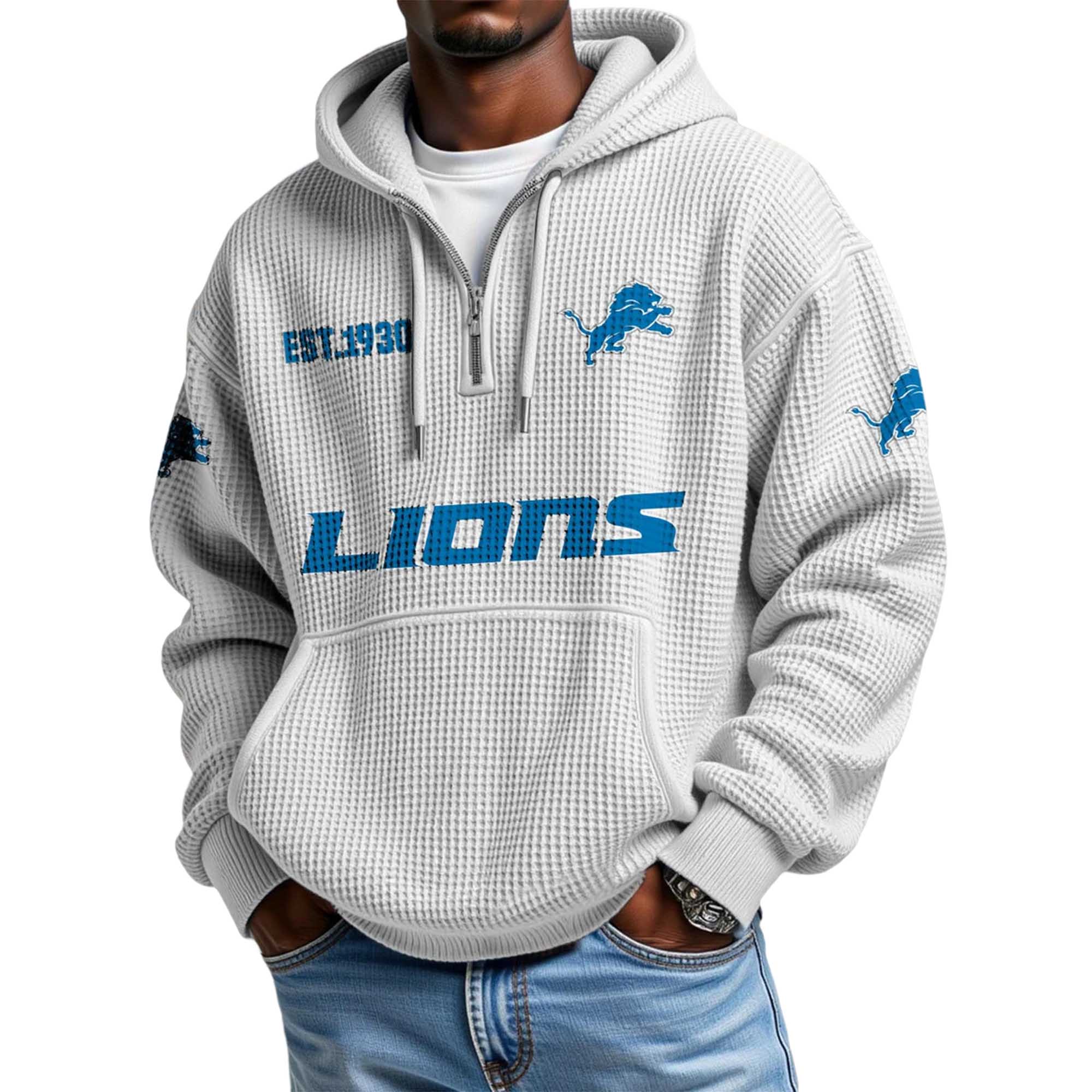 The Lions EST 1930 Quarter Zip Waffle Hoodie combines the team long-standing heritage with a fresh, modern design. This hoodie features an eye-catching light blue knit fabric, while the bold Lions logo showcases Detroit’s strong identity. Fans will love the blend of comfort and style in this versatile garment.