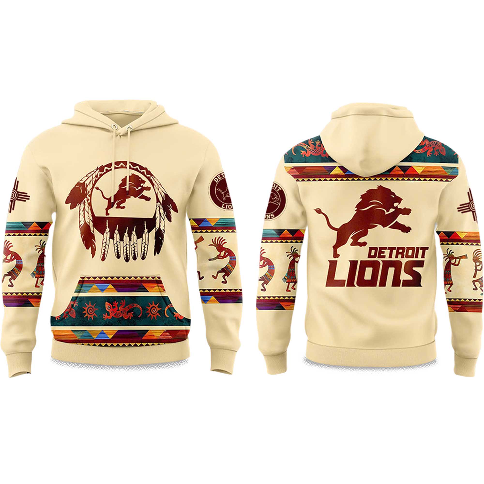 The Lions Native American Heritage Month Hoodie offers a vibrant blend of Detroit Lions cultural motifs and energy. The warm beige hues create the perfect backdrop for bold colors, iconic accents, and powerful lion imagery, making it a fun and meaningful choice for fans who love emotional sportswear.