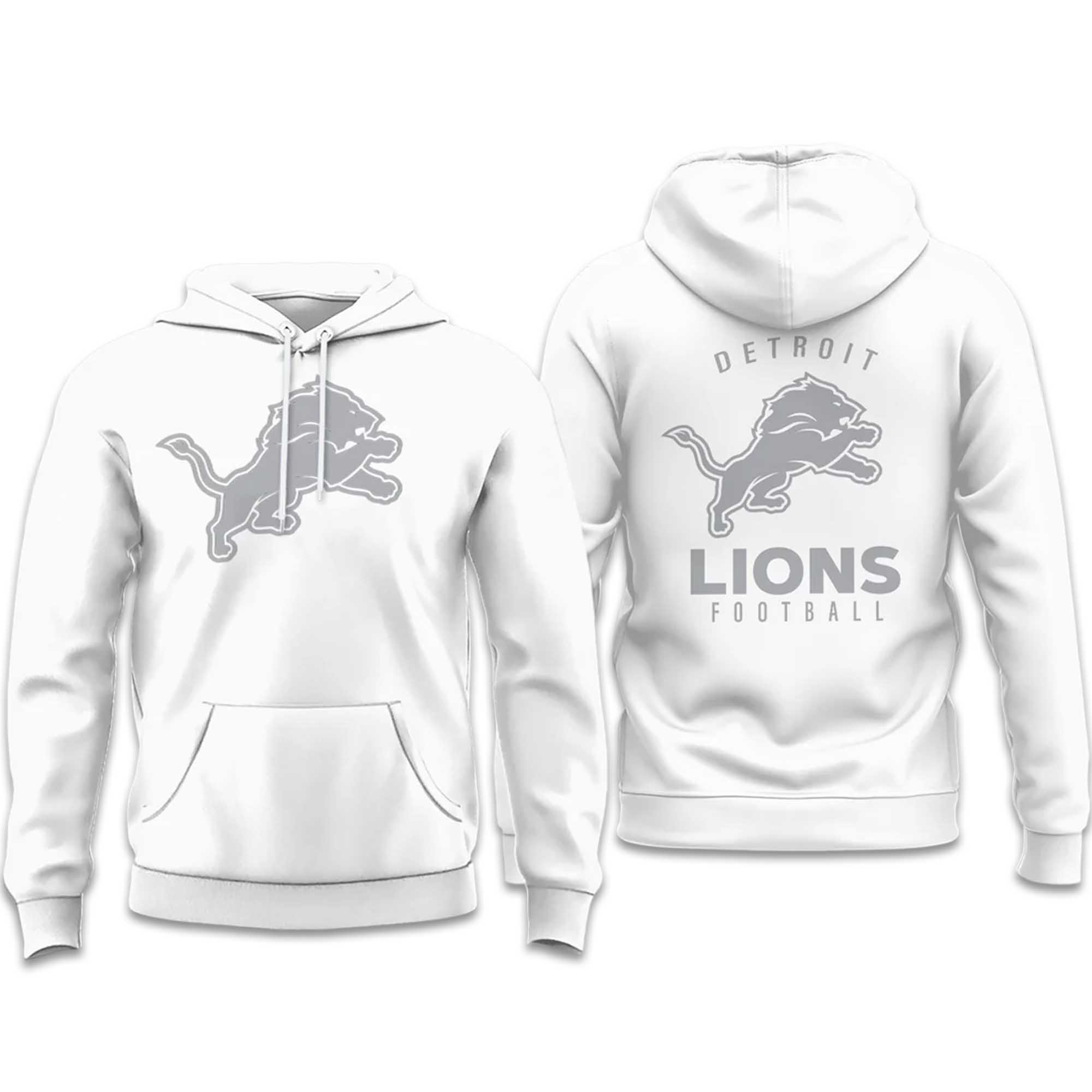 The Lions White Out 2026 Hoodie a bright white background combined with subtle grey accents for a crisp yet balanced look. The front displays the iconic leaping Lions logo, while the back highlights the words “Lions Football” with Detroit above. Designed for everyday comfort, the hoodie features a relaxed fit, adjustable hood, and front pocket, suitable for game days, casual outings, or cool evenings.