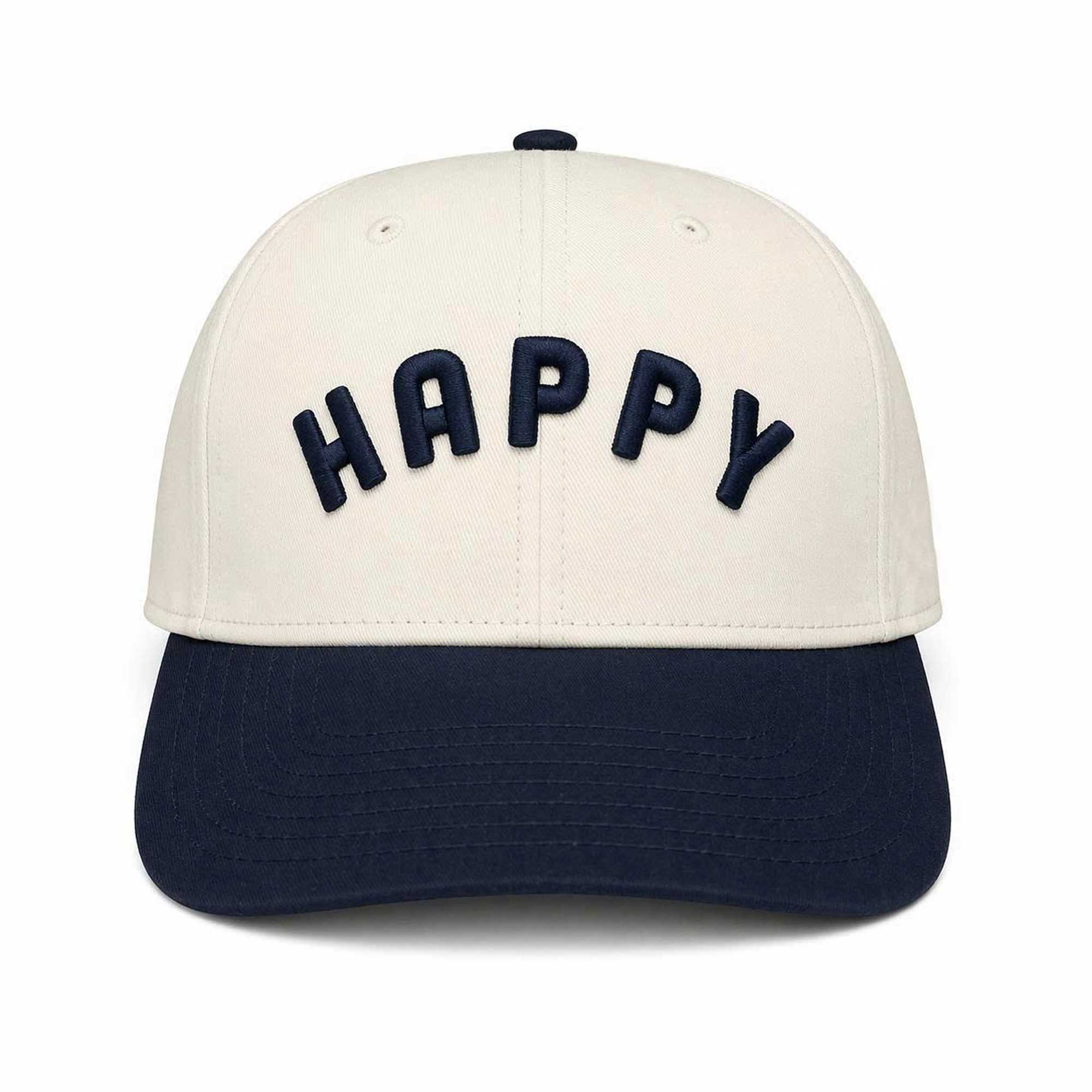 The cap features an elegant cream-colored crown paired with a deep navy brim for a timeless two-tone contrast. The HAPPY lettering is embroidered in navy blue on the front, creating visual emphasis and depth. The minimalist design focuses on the prominent lettering while still highlighting the color. The curved brim creates a classic sporty look, and the balanced design makes it easy to pair with both athletic and casual outfits.