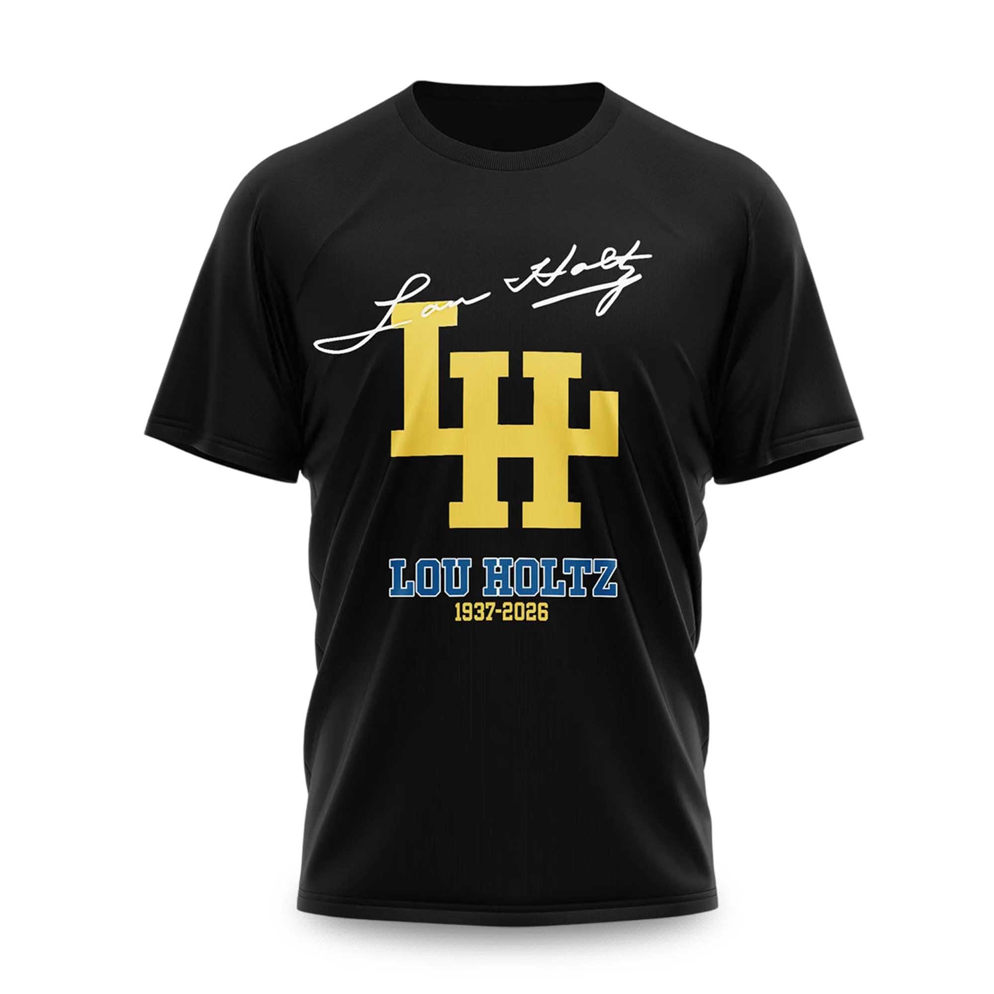 This shirt combines meaningful memorial elements with a powerful visual style. The contrasting yellow and white lettering against the black background creates a striking yet powerful look. The signature motifs and commemorative imagery help to express the spirit of Lou Holtz’s career. The soft material and comfortable fit make it suitable for everyday wear, attending memorial events, or gatherings where fans come together to remember a legendary coach.