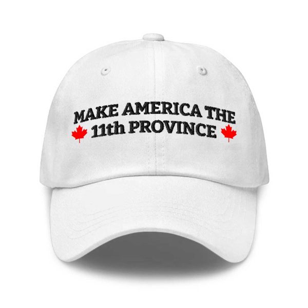 The Make America The 11th Province Canada Hat is a white baseball cap that playfully suggests a bold political idea. Featuring the phrase “MAKE AMERICA THE 11TH PROVINCE” in black with two red maple leaves, this hat reflects a playful perspective on the Canada-US relationship. It is a trendy accessory for those who enjoy political satire and cross-border talk in today’s cultural conversations.