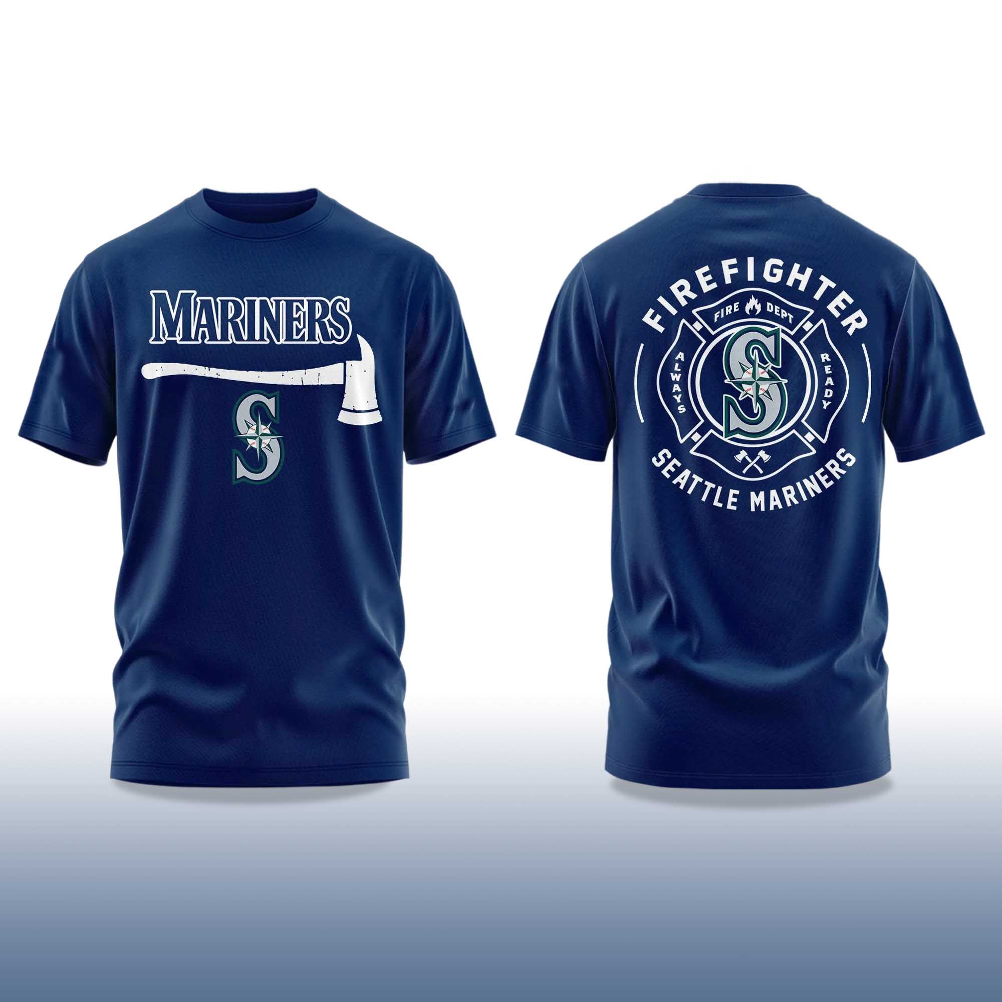The shirt features a navy blue body with subtle white detailing that highlights the Mariners logo and firefighter axe on the chest. The back of the shirt features a prominent circular print with the words “FIREFIGHTER SEATTLE MARINERS” centered in the team logo. The high-quality print ensures long-lasting sharpness and vibrancy, while the soft fabric provides a comfortable, breathable fit, ideal for everyday wear or cheering at the stadium.