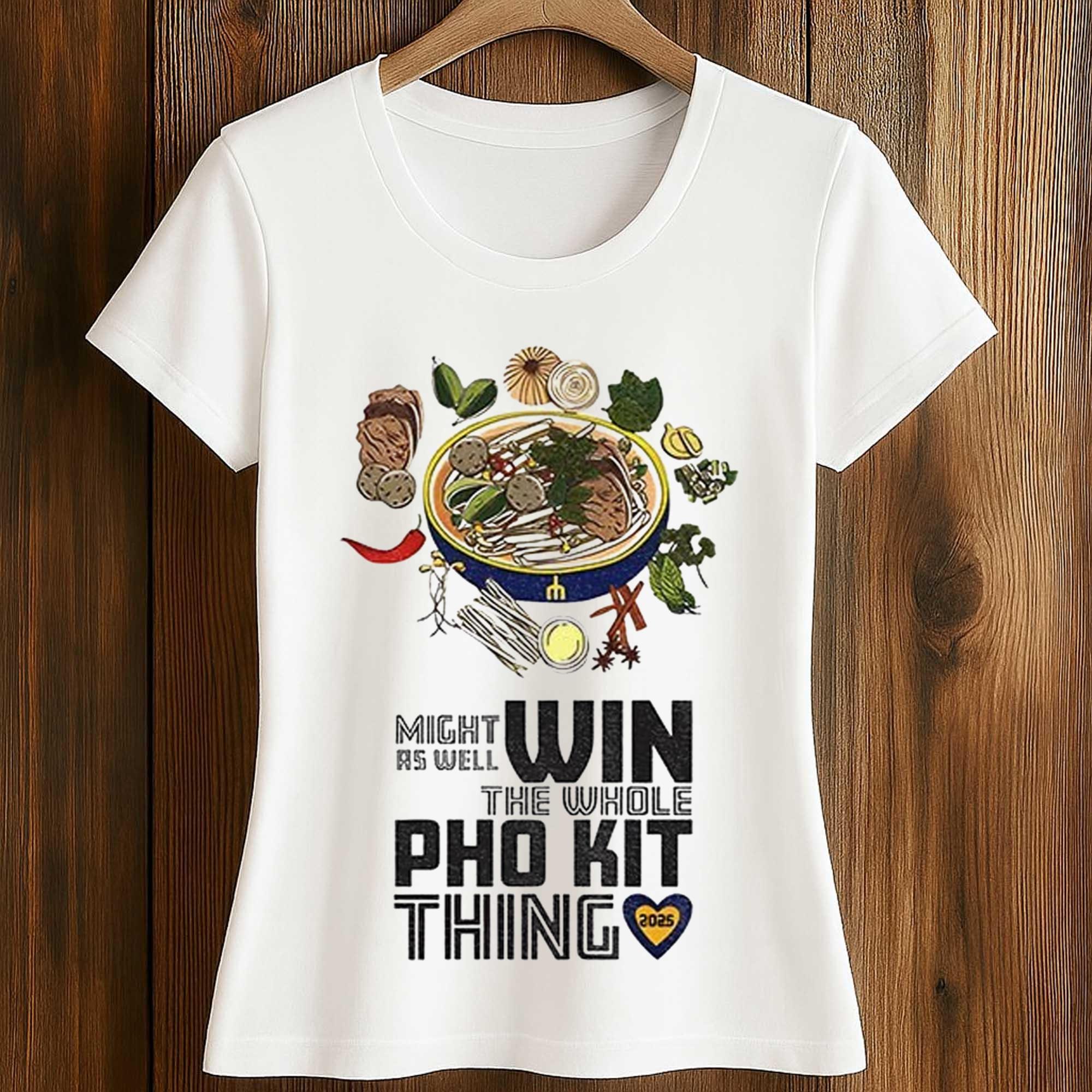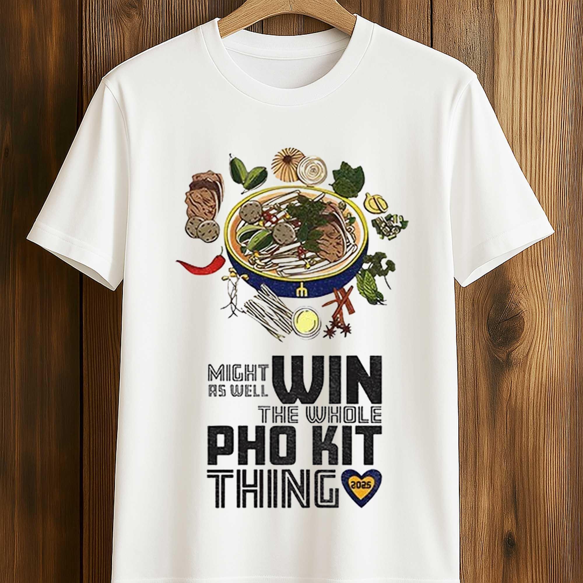 This shirt features a vibrant illustration of a steaming bowl of pho, surrounded by noodles, herbs, meat, and spices. Bold typography “Might As Well Win The Whole Pho Kit Thing 2025” gives the shirt a look that’s both playful and inspirational. Printed on a soft, breathable white background, the design pops with vibrant color, making it suitable for both stadium days and casual outings.