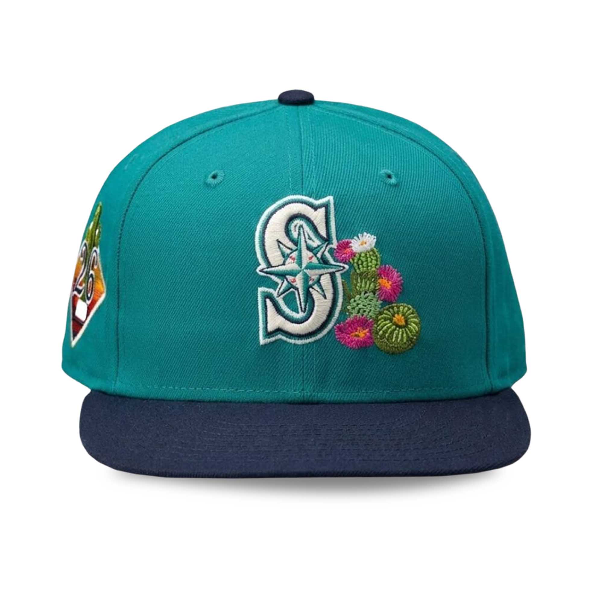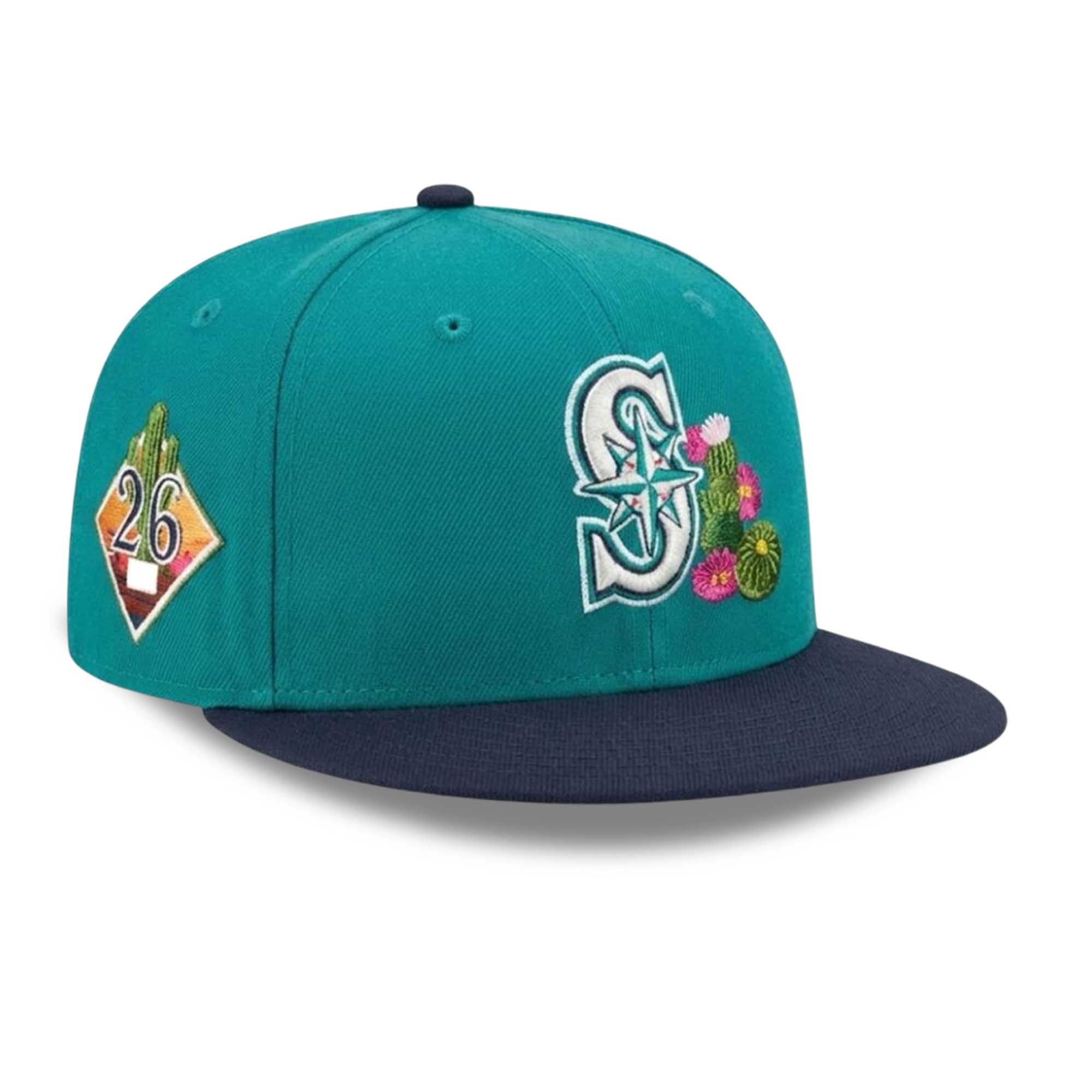 The vibrant turquoise color instantly evokes the Mariners’ identity, while the navy brim balances the design. Floral details add a fresh, seasonal touch without detracting from the classic logo. The 2026 patch on the side makes this cap look modern and is associated with the spring training activities at Peoria.