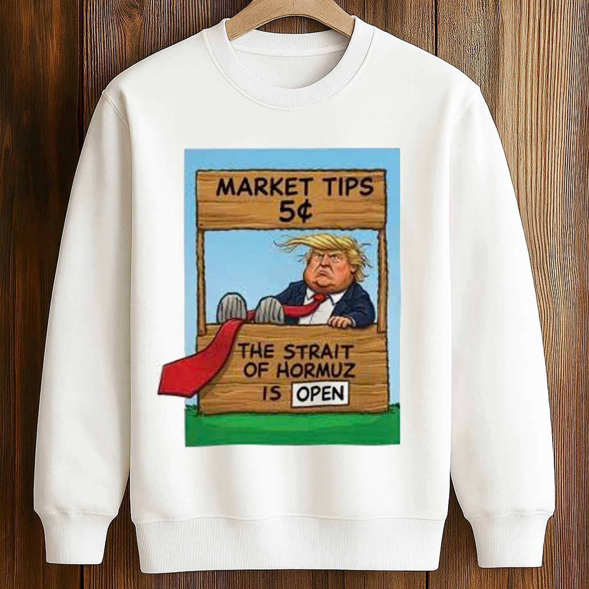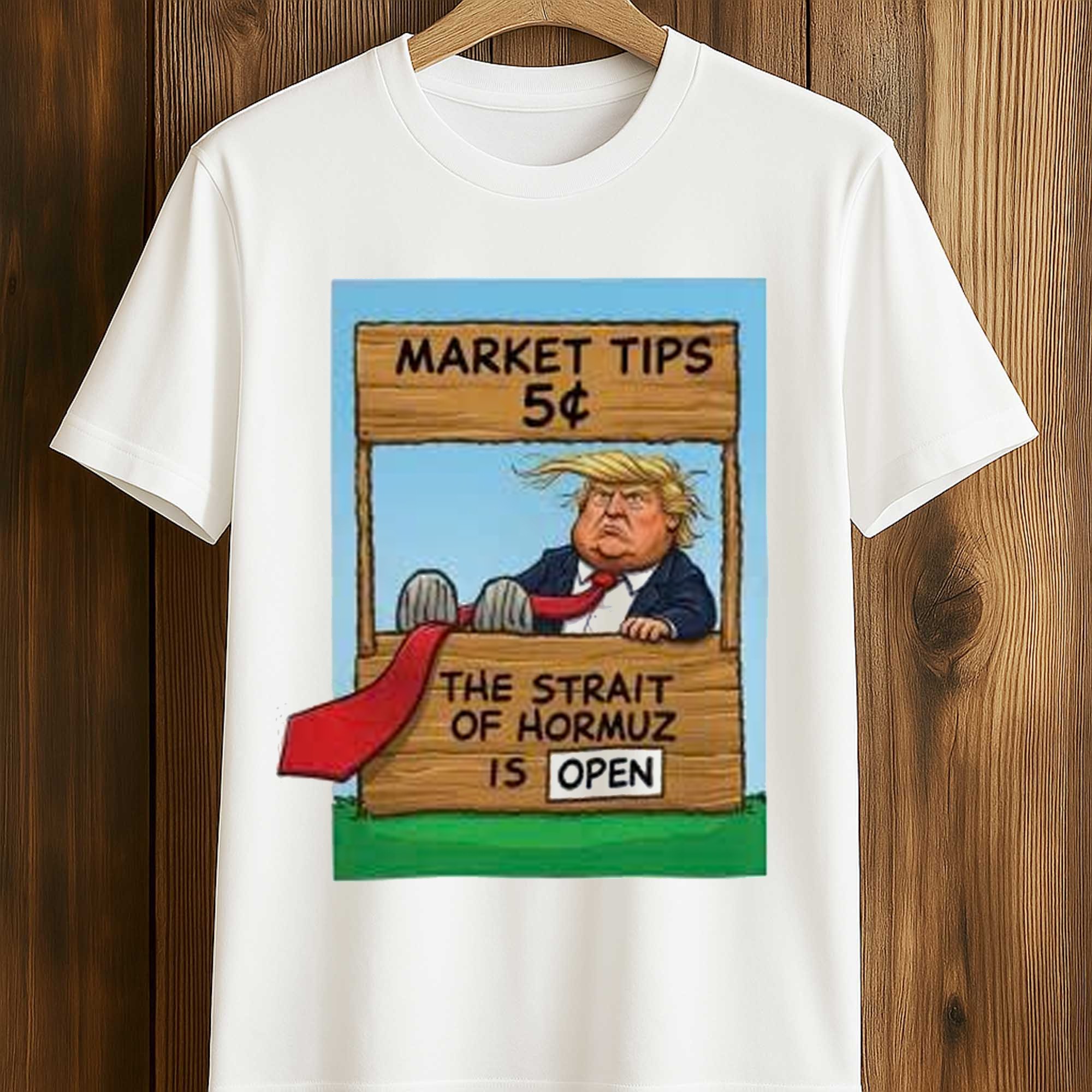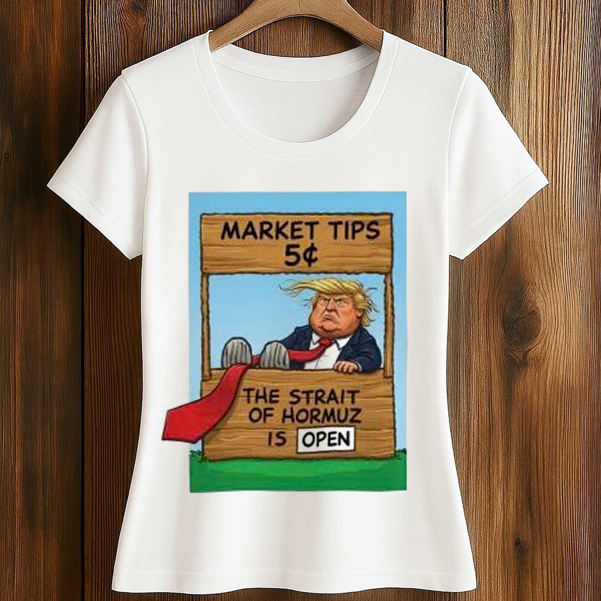 The image on the shirt features a cartoon-style roadside stall labeled Market Tips 5¢ with a humorous sign that reads The Strait of Hormuz is Open. Bold colors, hand-drawn lines, and expressive character styles make the image instantly stand out. The white background helps the illustration stand out, while its central placement creates a balanced and clean look. This design combines politics, economics, and internet humor in a fun visual format that stands out in any everyday context.