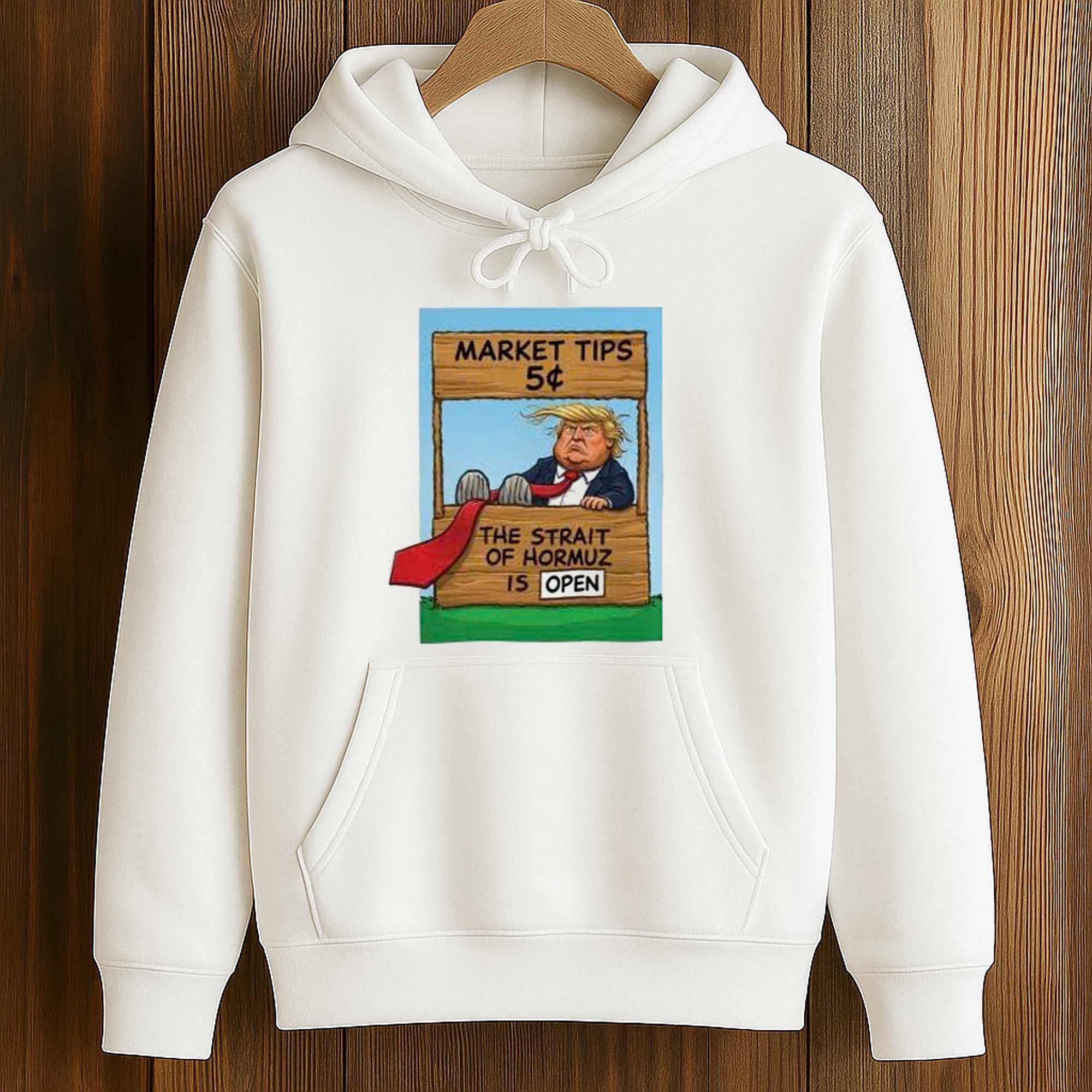The design reflects the close connection between global politics and financial markets. The Strait of Hormuz is one of the world’s most important shipping lanes, especially for oil transport. By turning that real-world topic into a 5-cent market tip, this t-shirt humorously comments on speculation, news cycles, and the speed of investor reactions to world events.