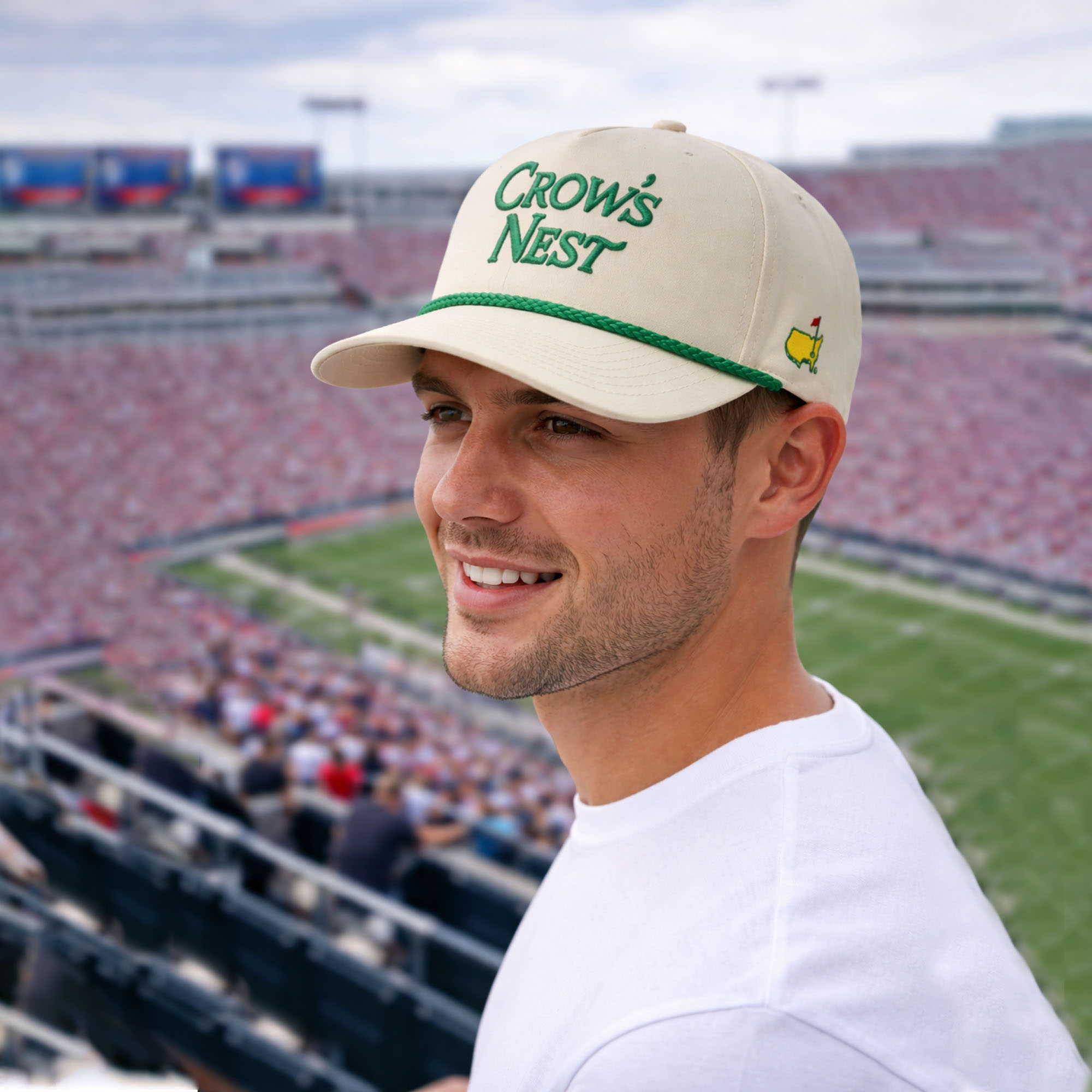 This cap features elegant green embroidered “Crows Nest” lettering set against a soft cream base, creating a clean and refined contrast. A braided green rope detail across the brim adds a vintage golf aesthetic, while the side patch inspired by Augusta enhances authenticity. The typography is bold yet classic, offering a timeless appeal without overwhelming the design. Its balanced color palette allows effortless pairing with golf attire, casual outfits, or spectator looks at tournaments.
