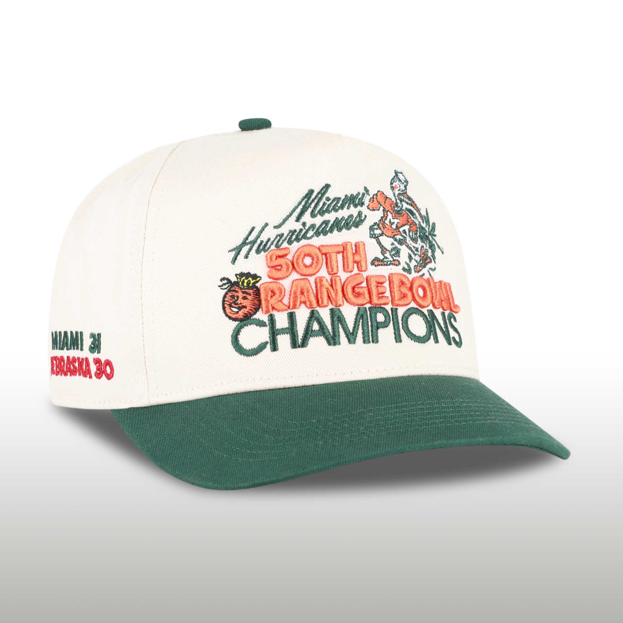 The design is inspired by classic college football caps commonly seen in the 80s and 90s. The green and white color scheme reflects the Hurricanes’ traditional color palette, while the bold lettering and commemorative details are reminiscent of classic championship memorabilia. It combines classic aesthetics with modern functionality.