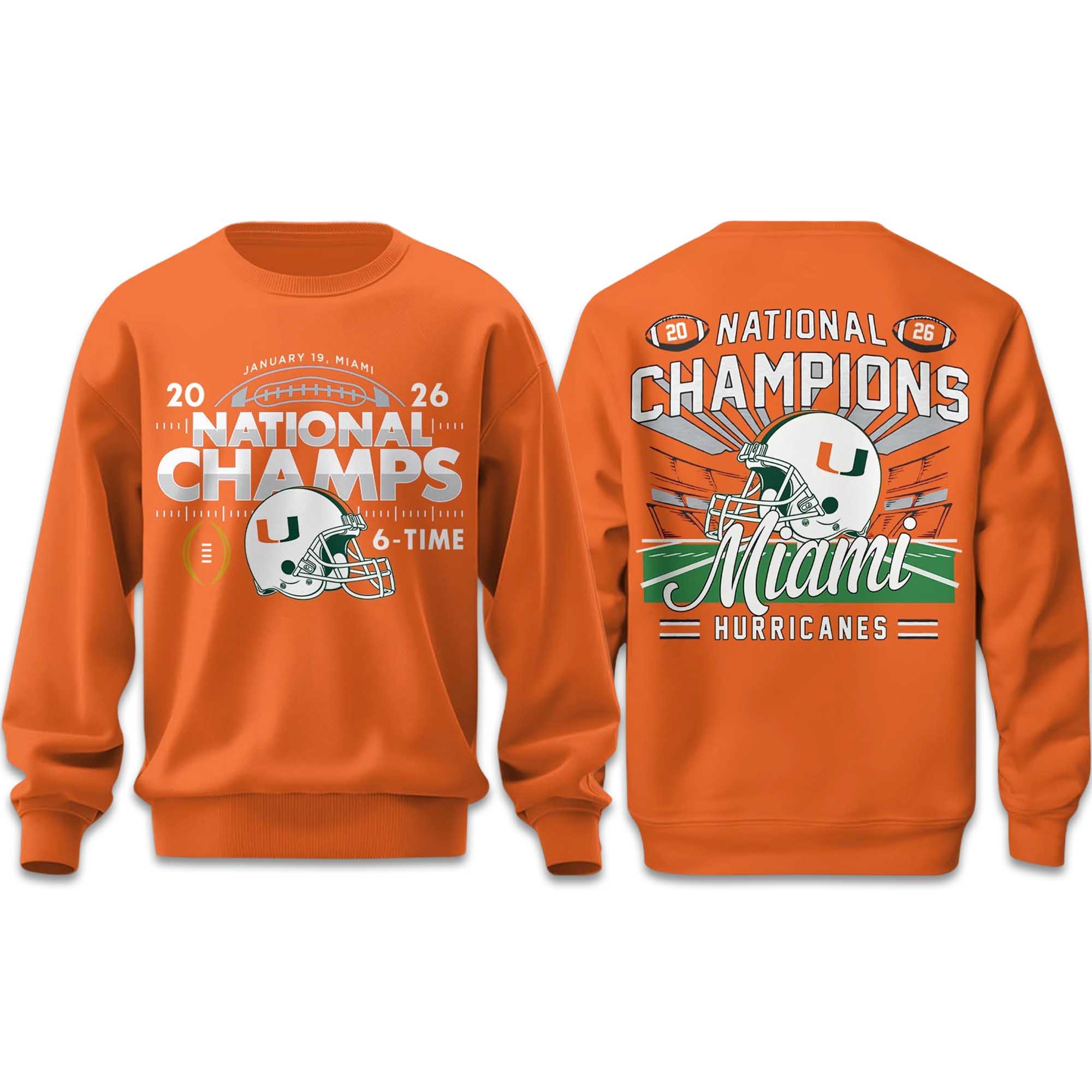 The Miami Hurricanes CFP National Champions 2026 Sweatshirt celebrates victory through eye-catching imagery and the team’s classic colors. A pristine white background highlights the bold orange and green lettering, combined with a detailed depiction of a football helmet. The front celebrates Miami’s championship heritage, while the back proudly displays the National Championship title. Designed for fans who value both comfort and team identity, this sweatshirt is suitable for both match days and casual wear.