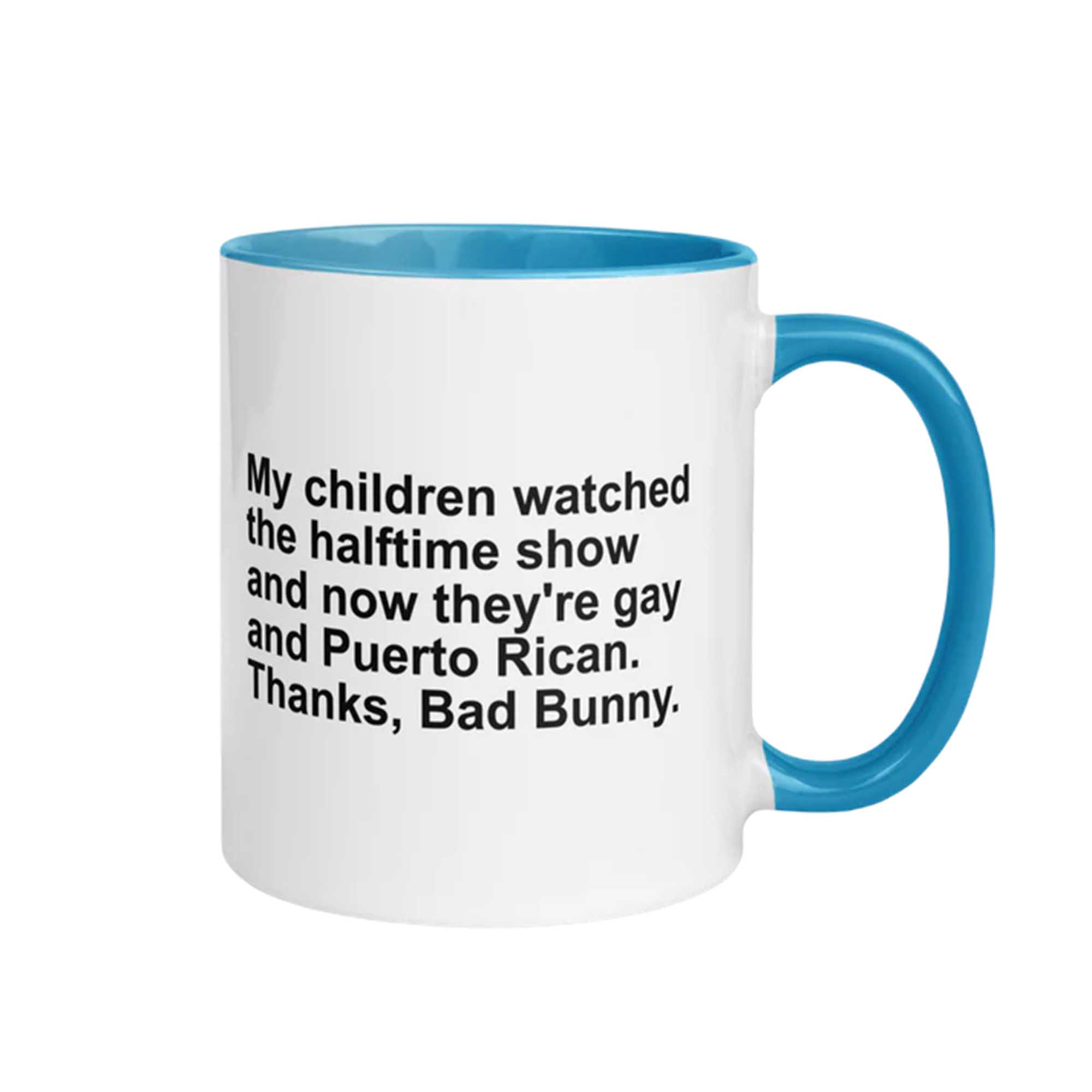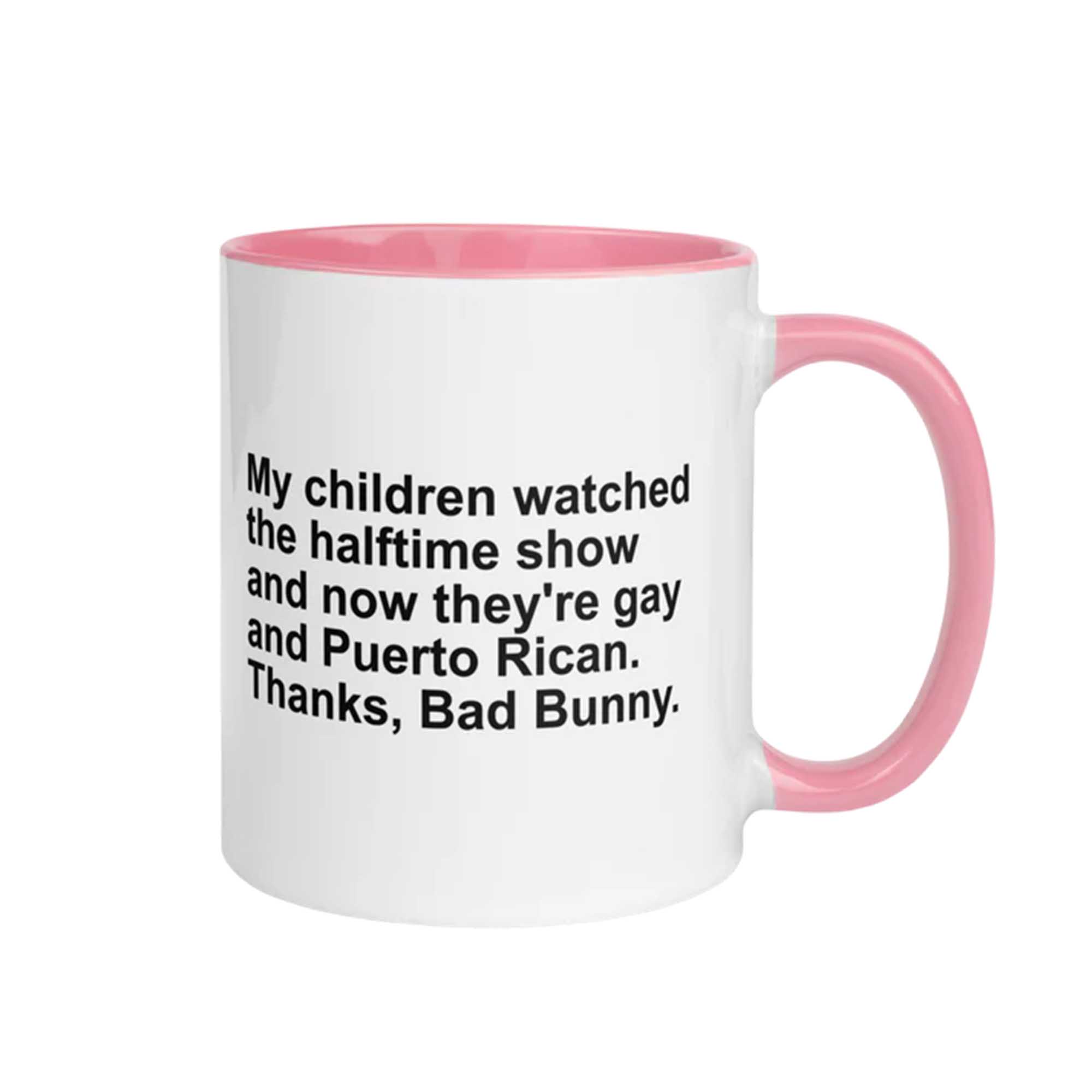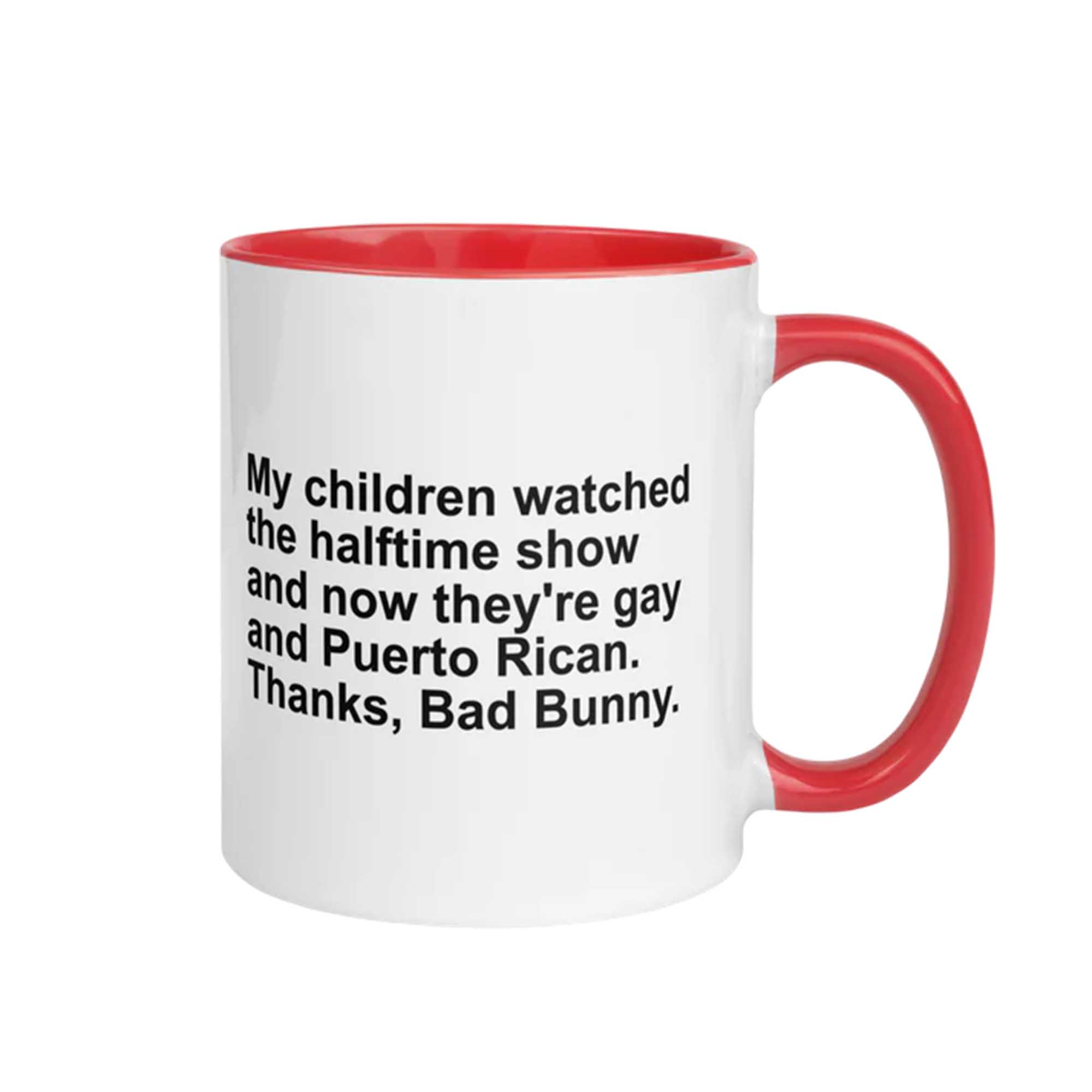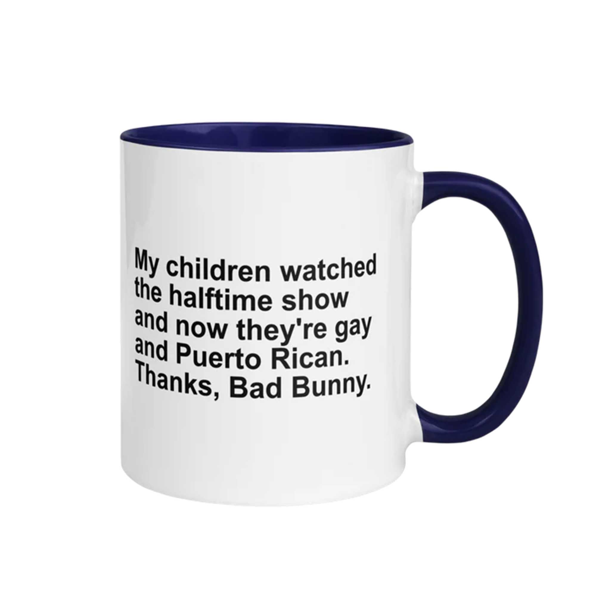 Following the heated online debate surrounding the mid-mid shows, humorous and satirical quotes quickly spread across social media. One standout quote is “My Kids Watched the Mid-Mid Show and Now They’re Gay and Puerto Rican.” This quote has become part of internet culture, reflecting humorously exaggerated reactions. The My Children Watched The Halftime Show And Now They’re Gay And Puerto Rican Mug captures that infectious energy in a fun way.