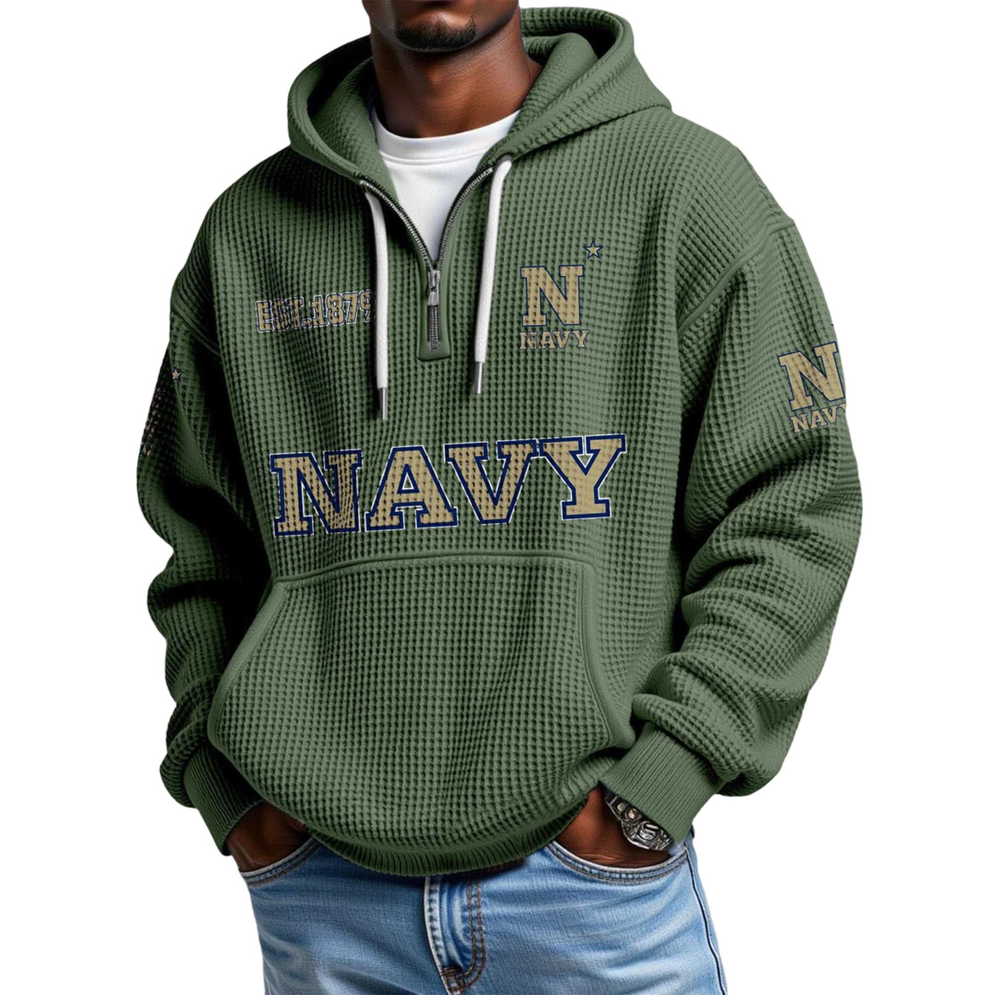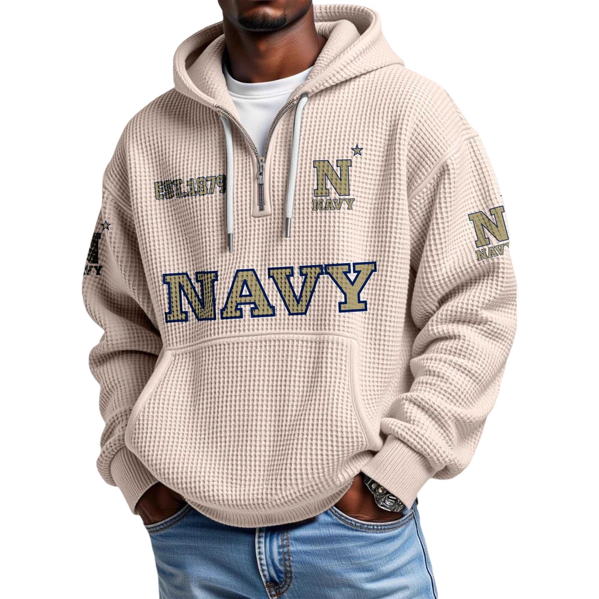 The Navy EST 1879 Quarter Zip Waffle Hoodie offers a powerful, heritage-inspired look with its graphite waffle fabric and prominent NAVY lettering. Embroidered yellow and blue emblems on the chest and sleeves highlight the proud Navy identity, giving fans a warm, confident layer for everyday wear or attending lively events.