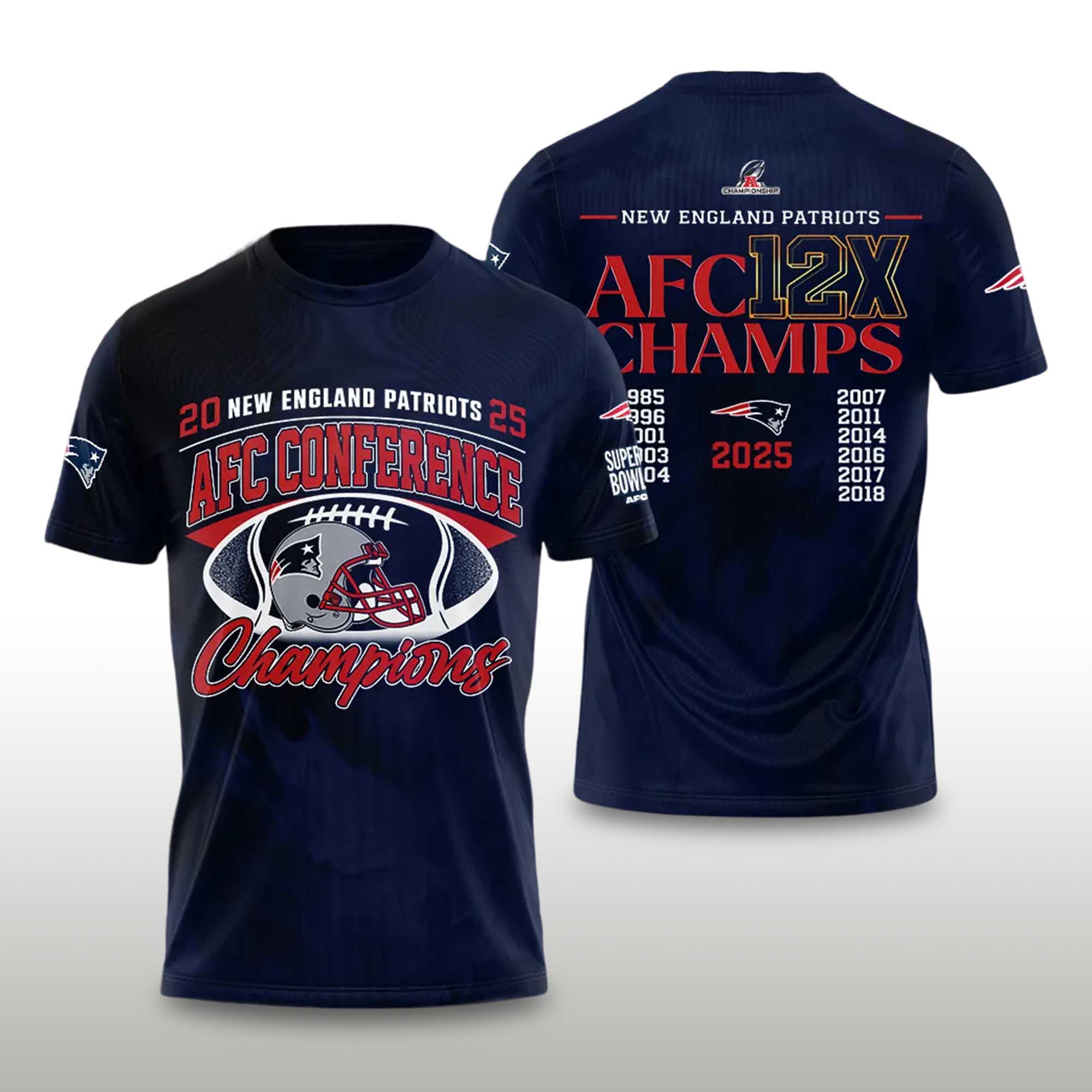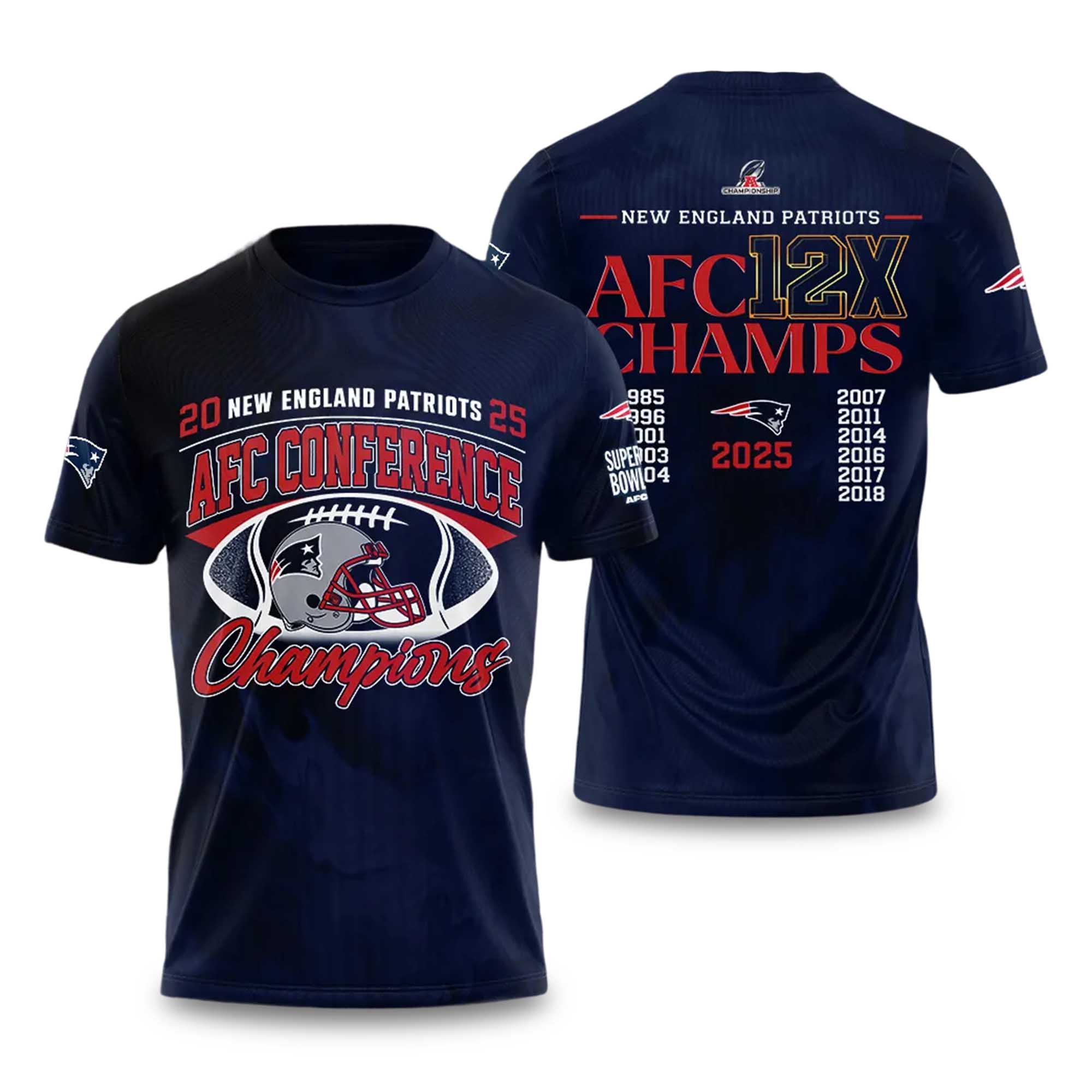 NE Patriots 2025 AFC 12X Champions Bowl LX T-shirt – Celebrating Historical Heritage