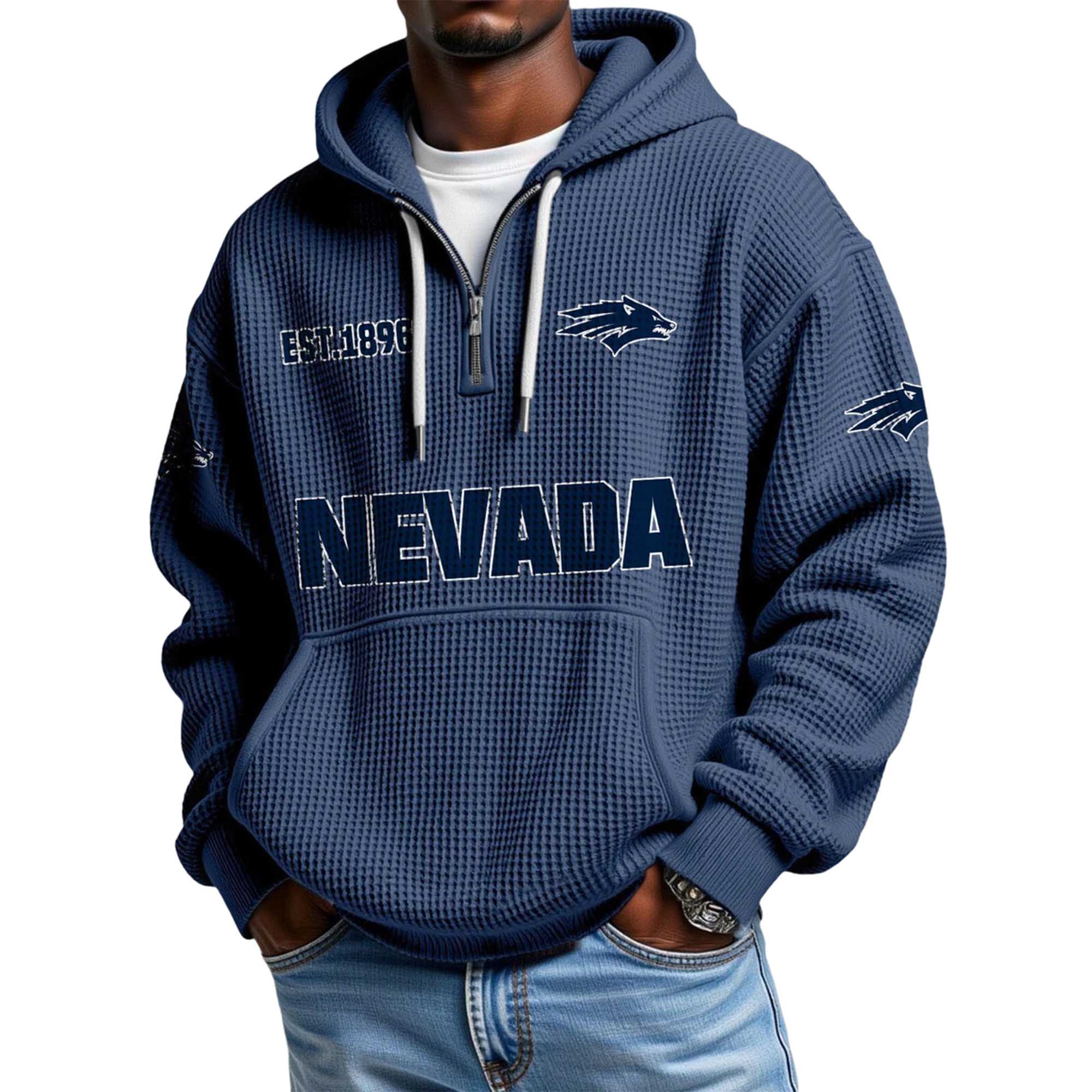Waffle-style hoodies and quarter-zip collars are very popular in streetwear and college fashion right now. This combination is comfortable, modern, and easy to style. This Nevada version perfectly fits that trend, offering both comfort and a strong team spirit without being overly flashy or complicated.