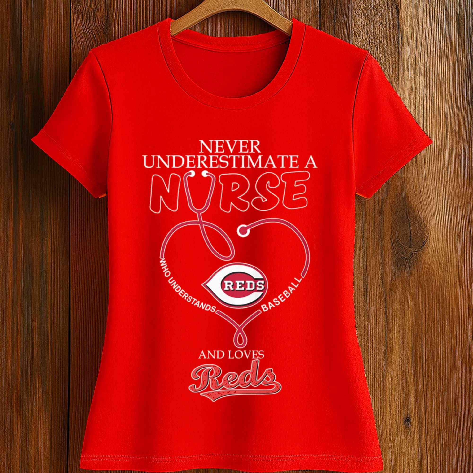 This shirt stands out thanks to its clever blend of medical and sporting elements. The stethoscope heart symbolizes compassion and dedication in nursing, while the Reds logo brings a strong baseball identity. The crisp white lettering contrasts beautifully with the vibrant red fabric, ensuring the message is easily readable. The balanced layout keeps the design modern, eye-catching, and perfect for everyday wear or game day.