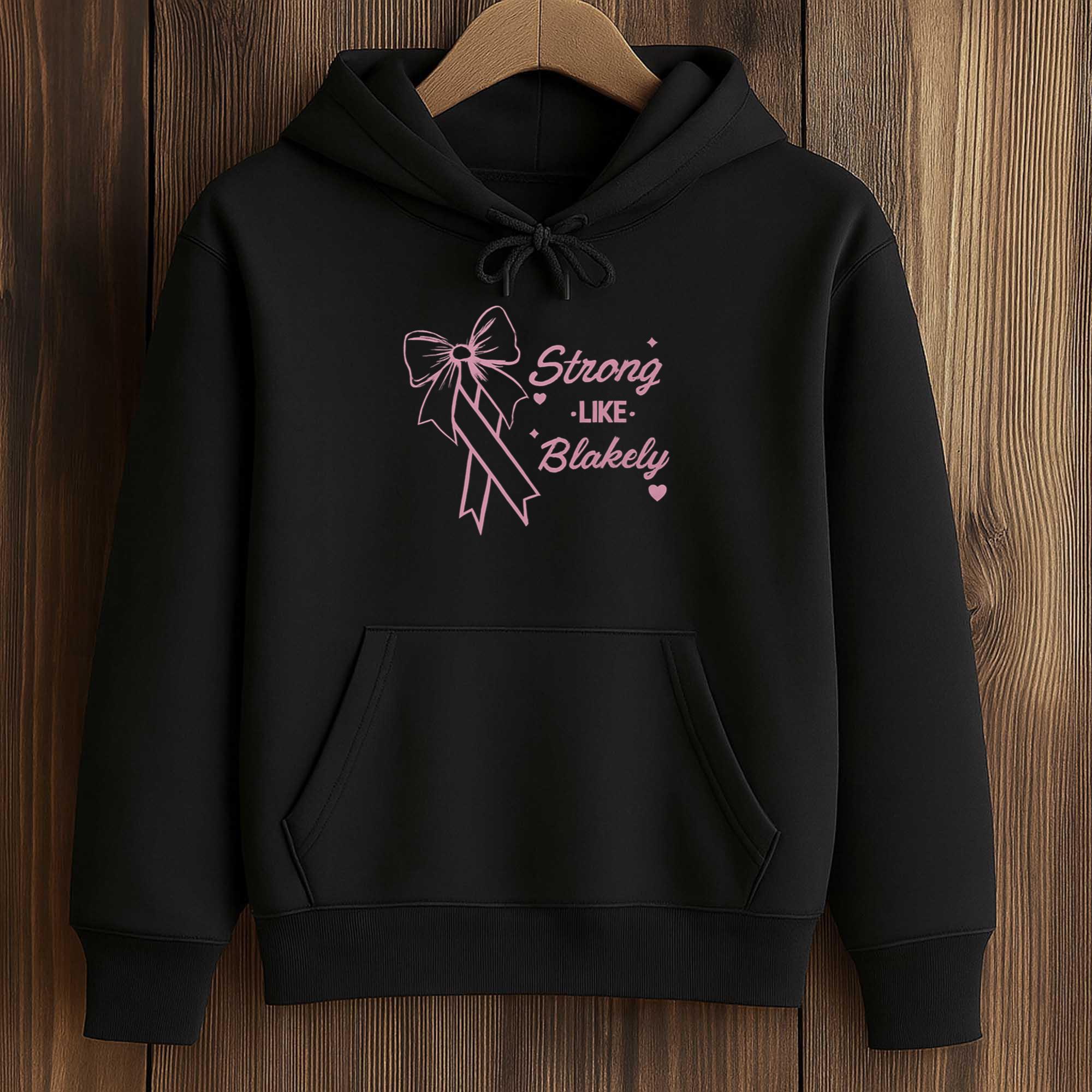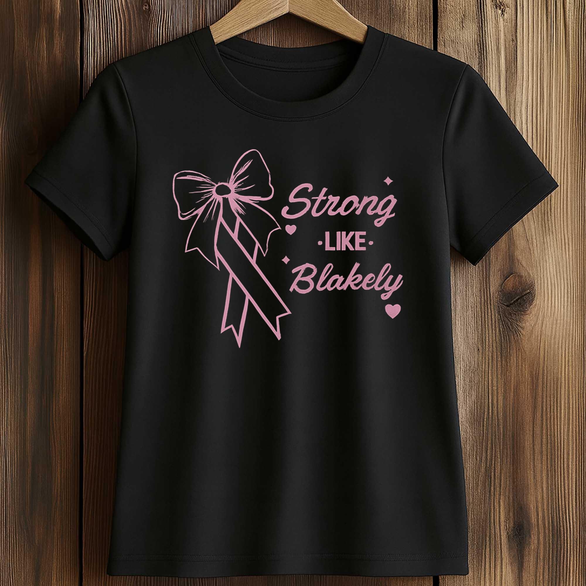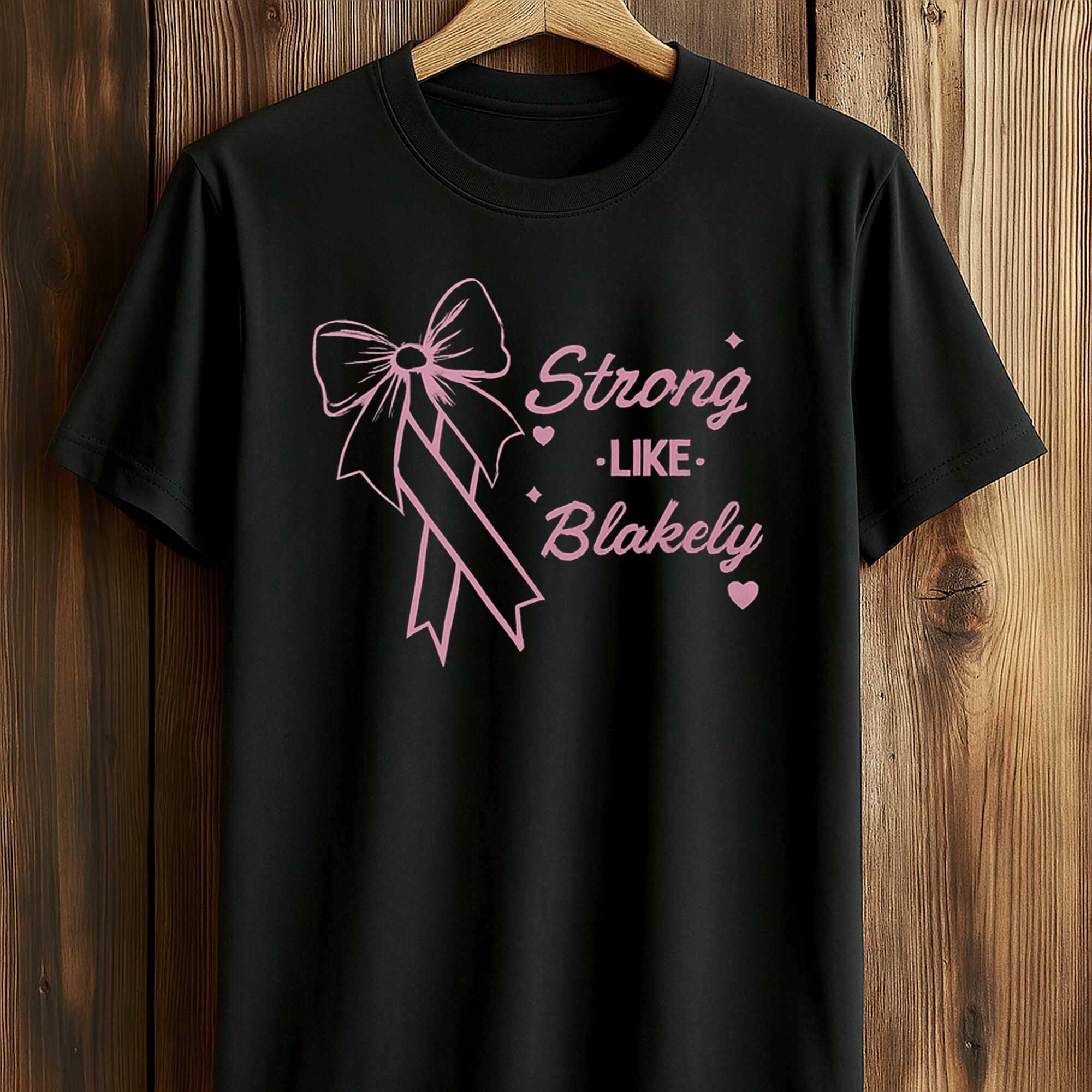 This tee features a light pink ribbon and delicate bow and the inspirational text “Strong Like Blakely” printed gracefully. Against a deep black background, the design exudes warmth and positivity. The breathable cotton fabric provides all-day comfort, perfect for both casual wear and awareness events.