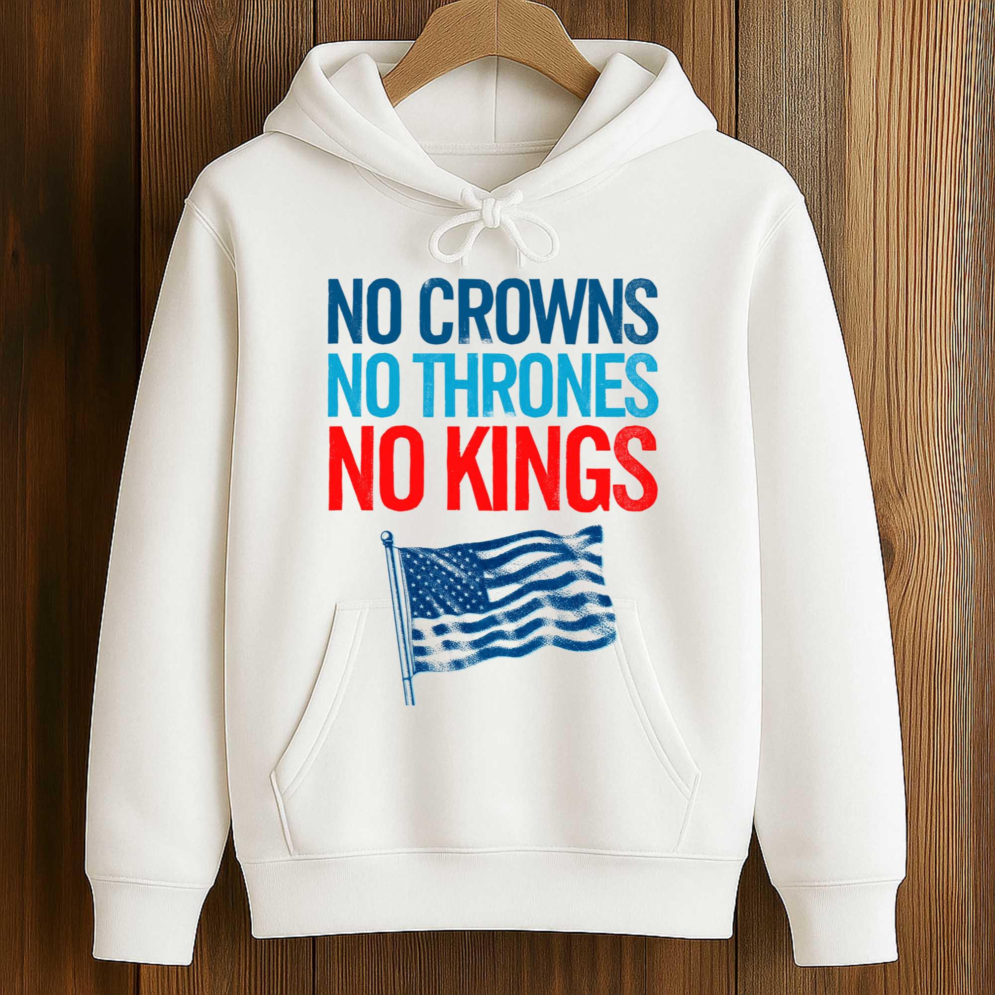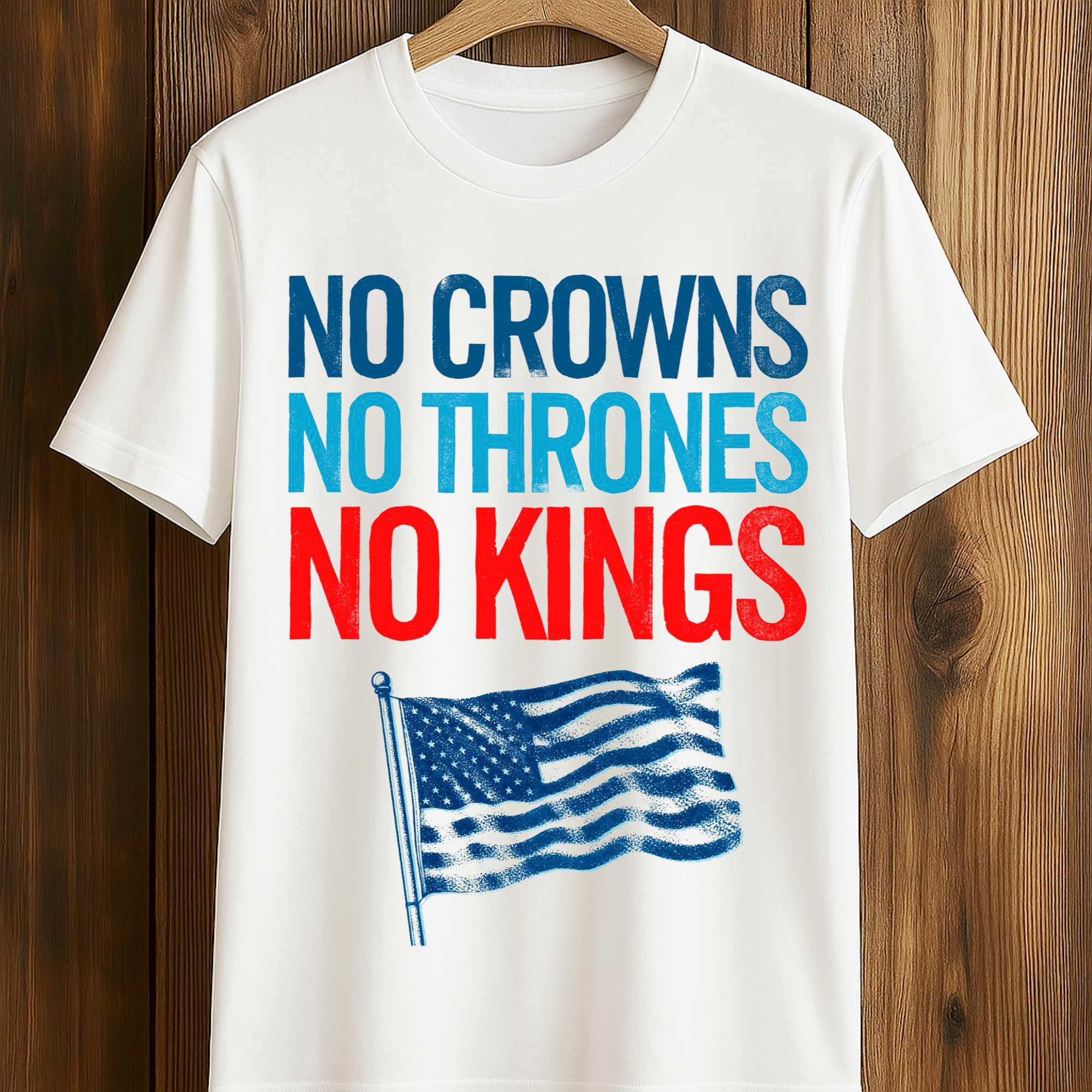 The shirt features a crisp white body, highlighting the red and blue lettering. The bold, overlapping lettering “NO CROWNS NO THRONES NO KINGS” is a clear protest against monarchy and a celebration of freedom. Below, a classic American flag motif adds a strong patriotic touch. Crafted from soft cotton, the shirt offers comfort, breathability, and a colorfast print, perfect for summer events and national holidays.