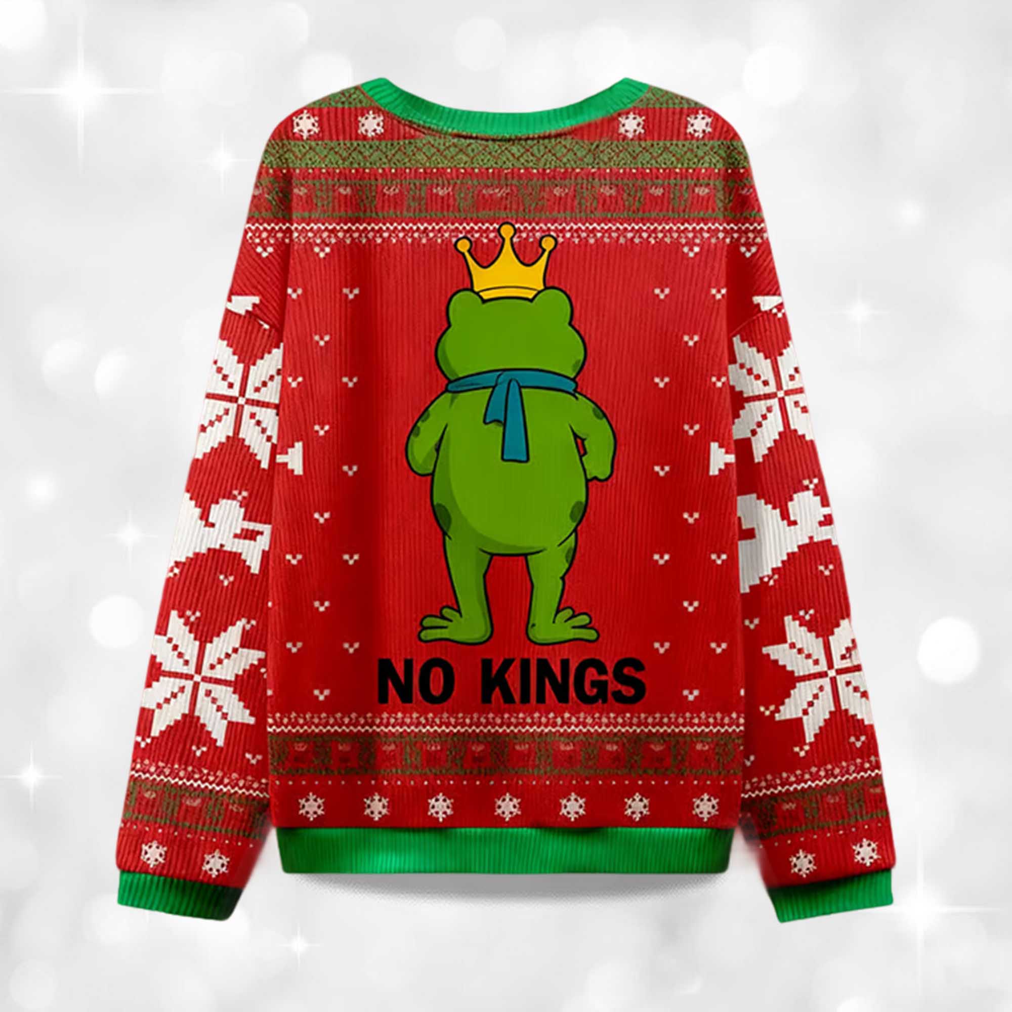 Ready to shake up your usual holiday style? Try the No Kings Protest Ugly Christmas Sweater. The vibrant green frog kicks to victory, the bouncing gold crown, and the large “NO KINGS” text give it a rebellious, bold feel while the red background with snowflakes, reindeer, and prints keeps the Christmas spirit alive. This sweater strikes the perfect balance between festive fun and bold, making it ideal for office parties, intimate get-togethers or even a protest-themed photoshoot. Throw this sweater on and suddenly your outfit will not only be festive but also bold.